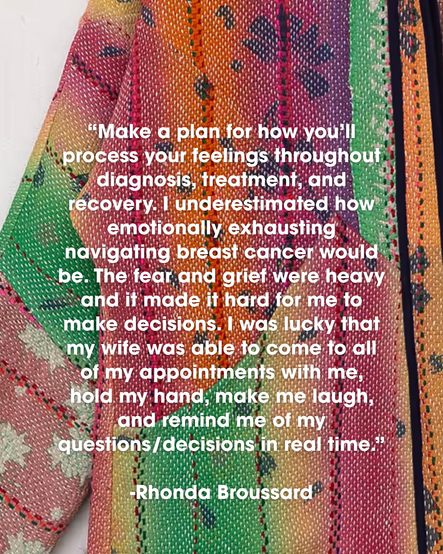 Make a plan for how you’ll process your feelings throughout diagnosis, treatment, and recovery. I underestimated how emotionally exhausting navigating breast cancer would be. The fear and grief were heavy and it made it hard for me to make decisions. I was lucky that my wife was able to come to all of my appointments with me, hold my hand, make me laugh, and remind me of my questions/decisions in real time.