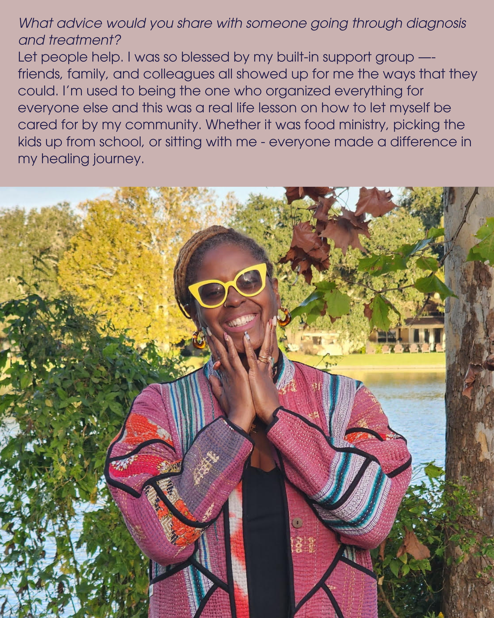 Let people help. I was so blessed by my built-in support group —- friends, family, and colleagues all showed up for me the ways that they could. I’m used to being the one who organized everything for everyone else and this was a real life lesson on how to let myself be cared for by my community. Whether it was food ministry, picking the kids up from school, or sitting with me - everyone made a difference in my healing journey.