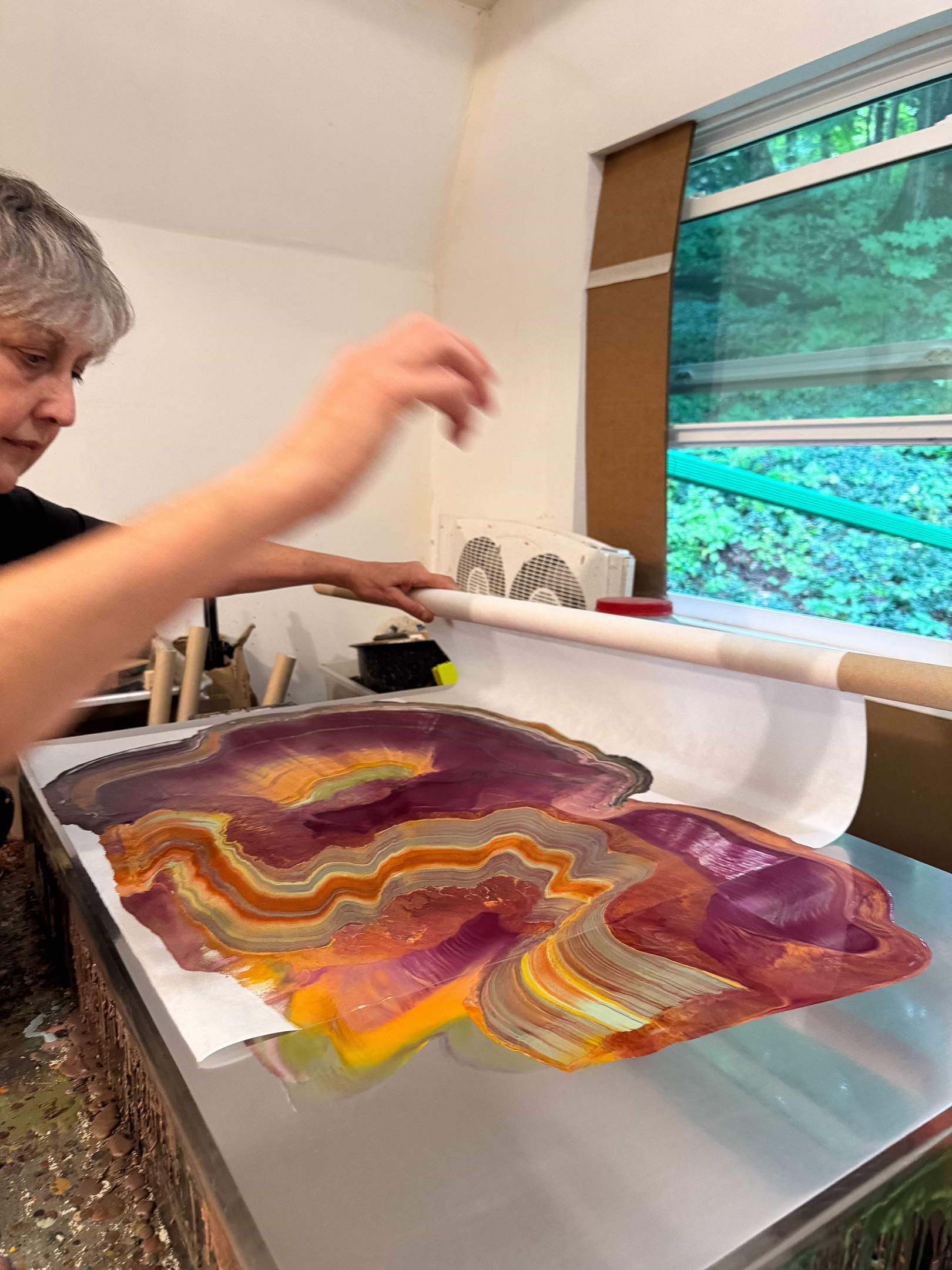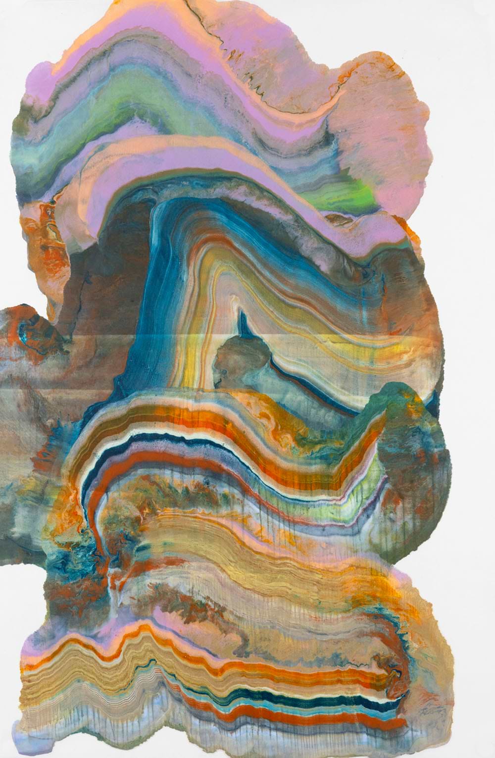 So, first I build the piece up, then I work on it, slowly over time, and while I'm doing that I simultaneously make works on paper that are offsets of the spillways and trails of paint that are left behind as I whittle away the form. It's like the studio is demonstrating its own cycle; layers of color are amassing, enfolding, and mountain-making on one hand, being made in tandem with fluid, pull-outs and flood zones captured on paper. Both records of time.