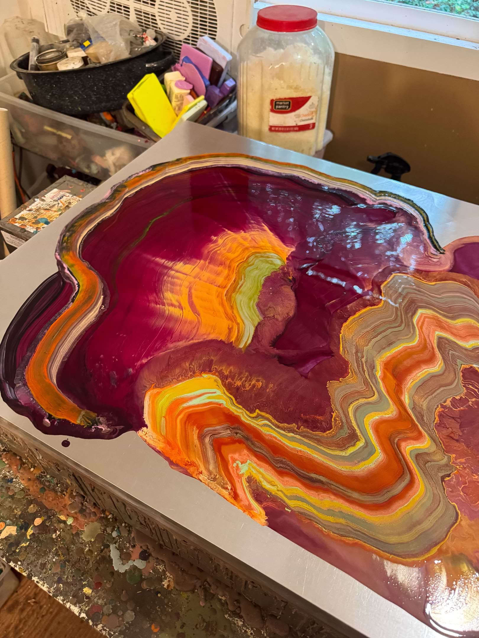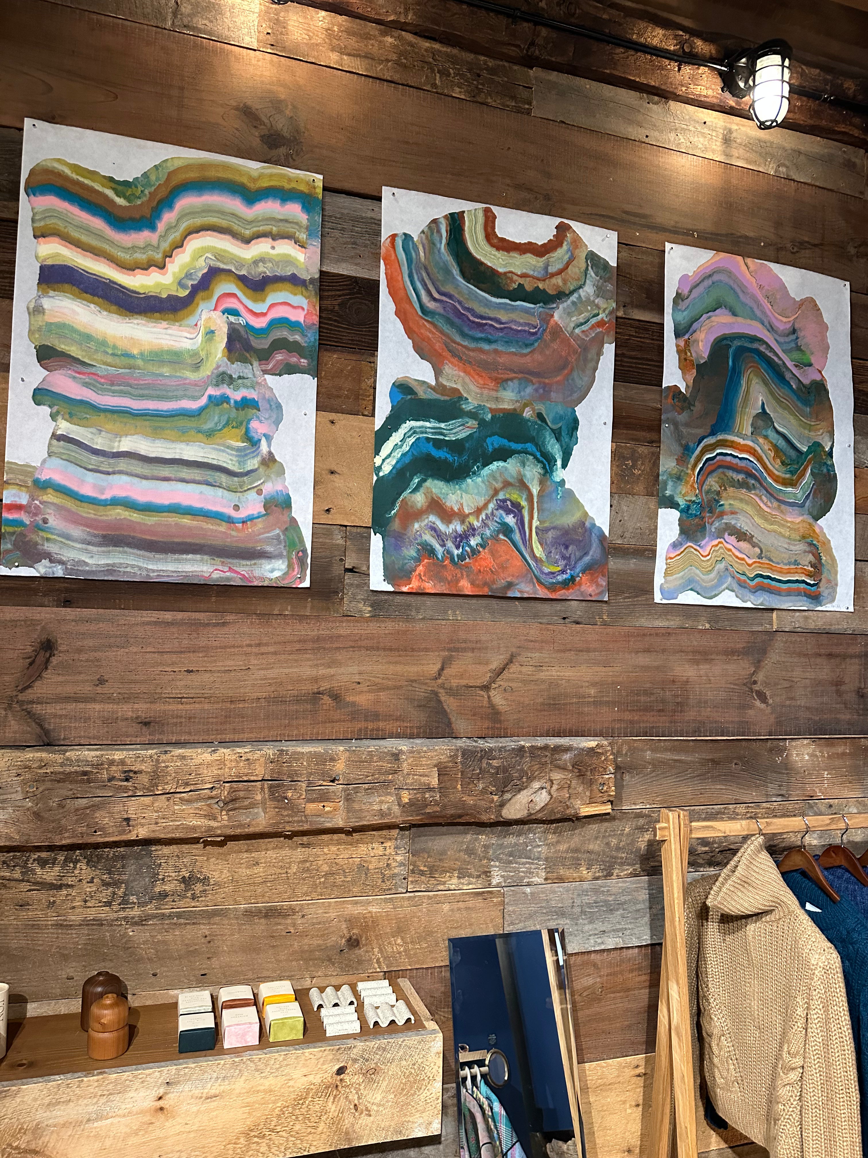 Laura’s work immediately drew me in. Seeing it displayed on Ravenwood's antique wood walls, I felt an emotional response to the colors- they touched me in the way I am touched by nature, deeply and profoundly. The shapes reminded me of agate and rocks, and the deep, natural tones held my attention and fascination. I found myself wanting to know more.
