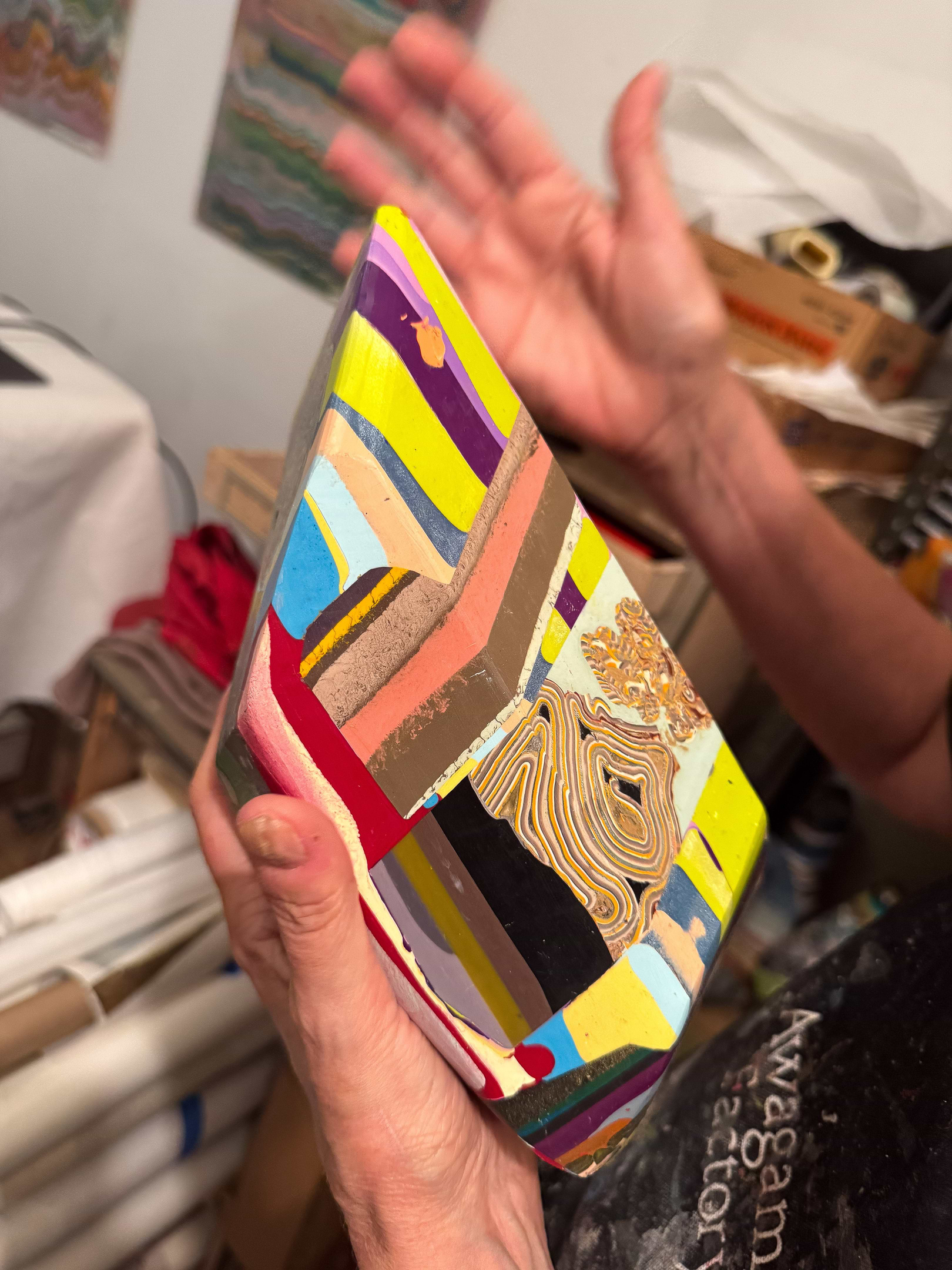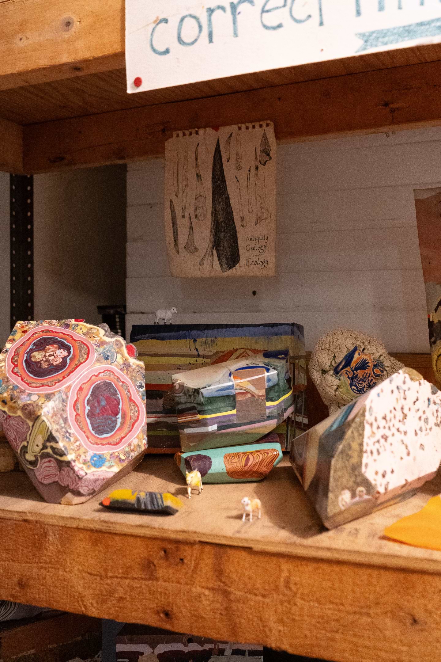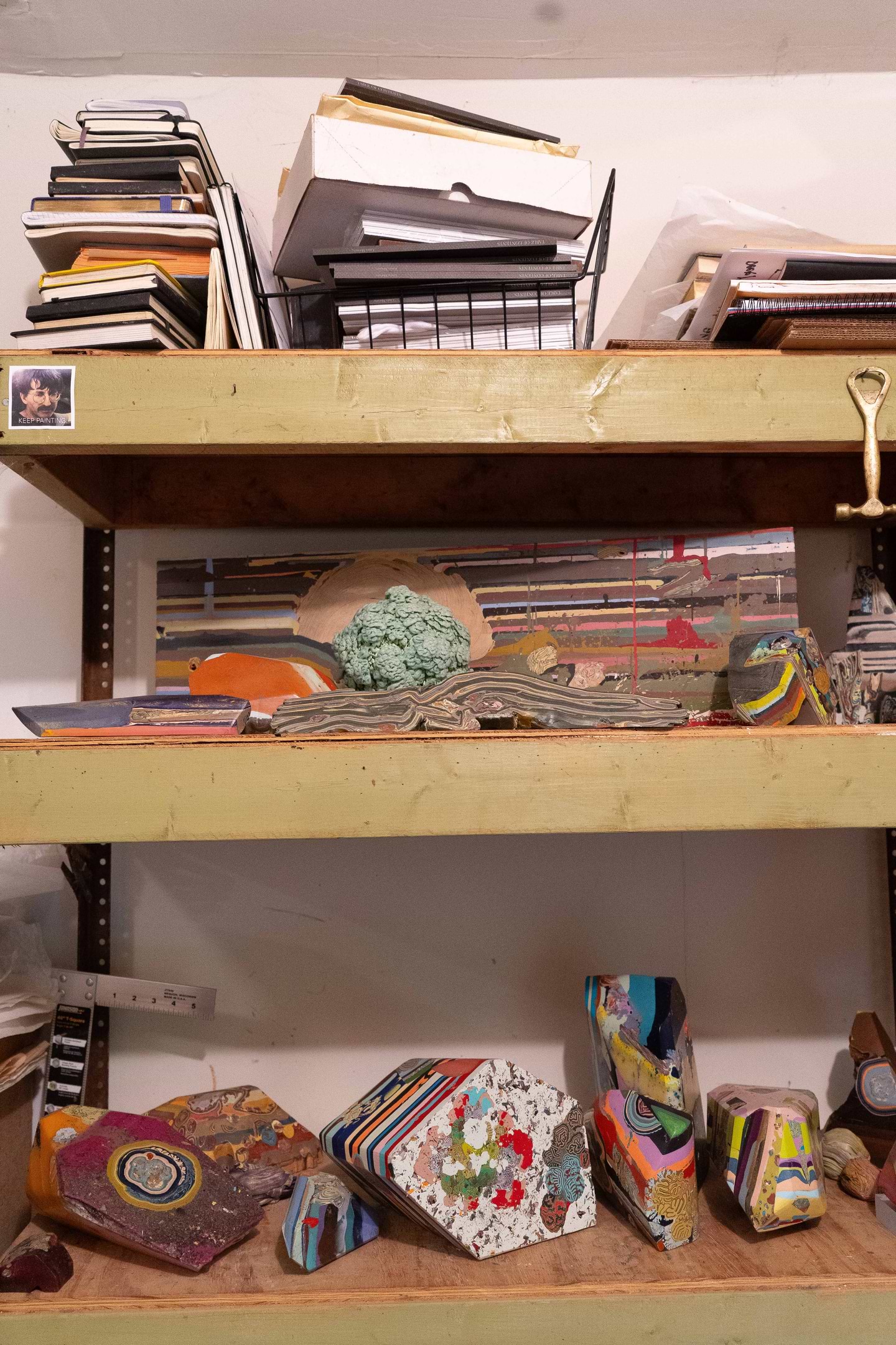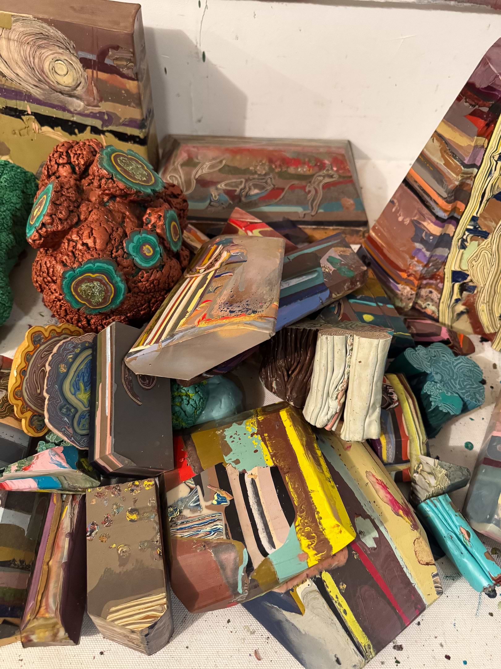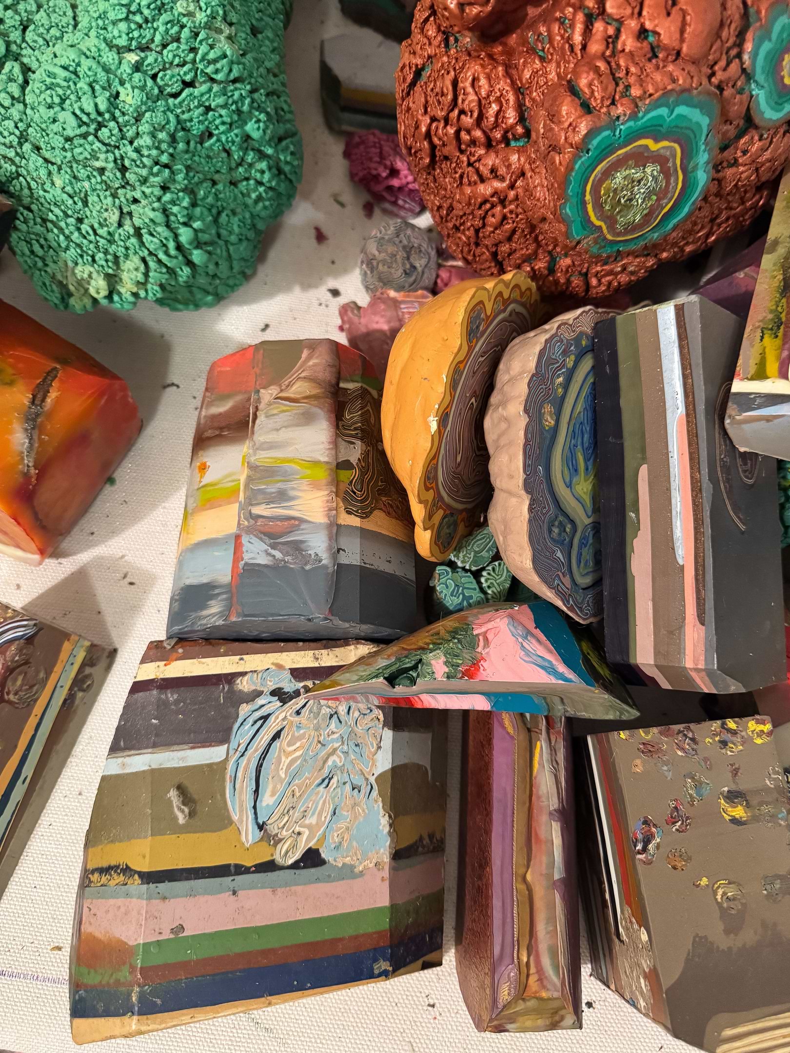 None of them look like 'paintings', but they are to me. There is a section of my studio that is kind of a cabinet of curiosities collected over time, so in a sense the objects are like journals for me because they contain embedded bits that tell me a story about passing time. But they're also experiments with color palettes. The objects only become articulated forms after lots of eroding, revealing what's buried in them, softening the edges, shaving and shaping.