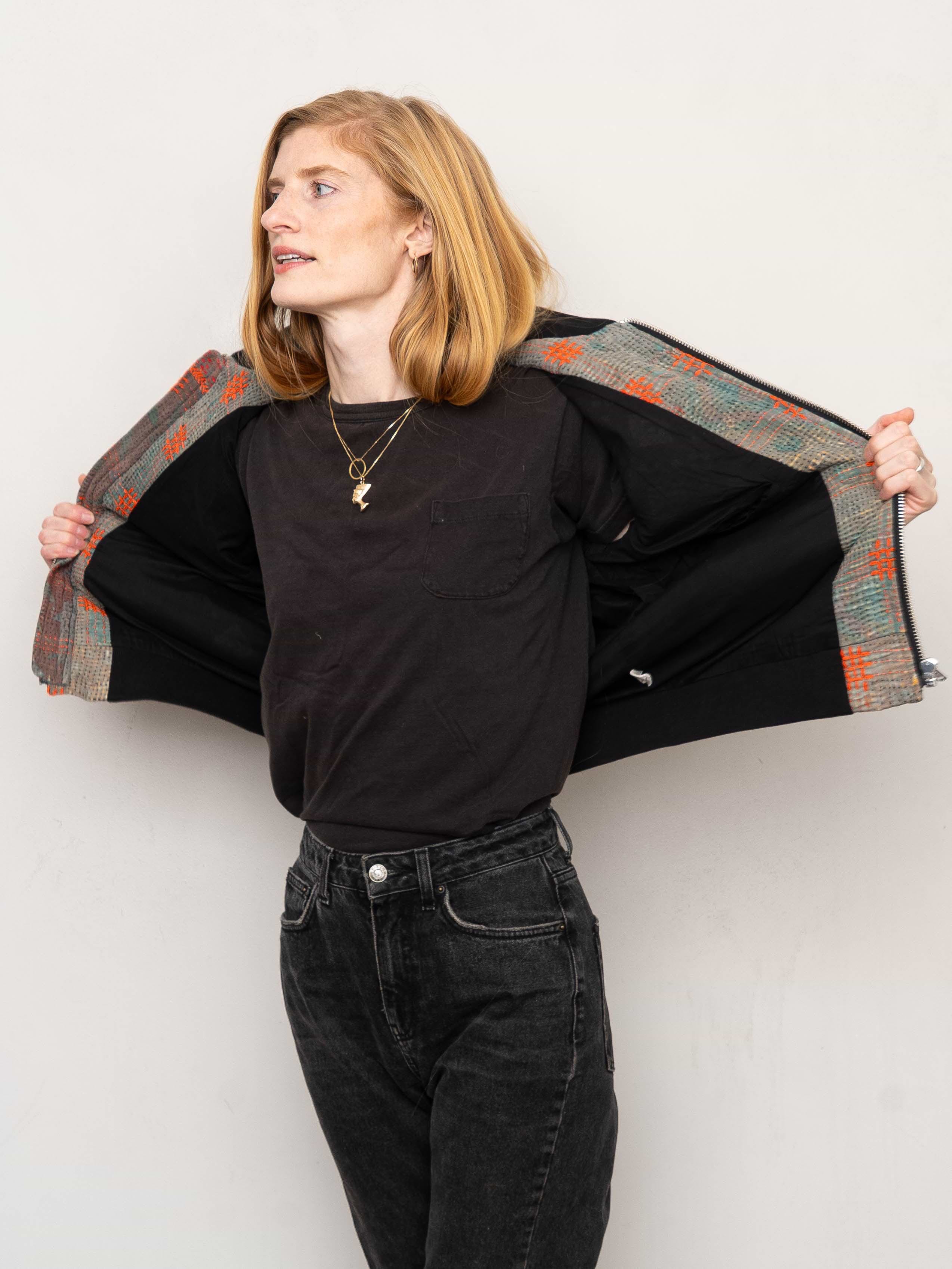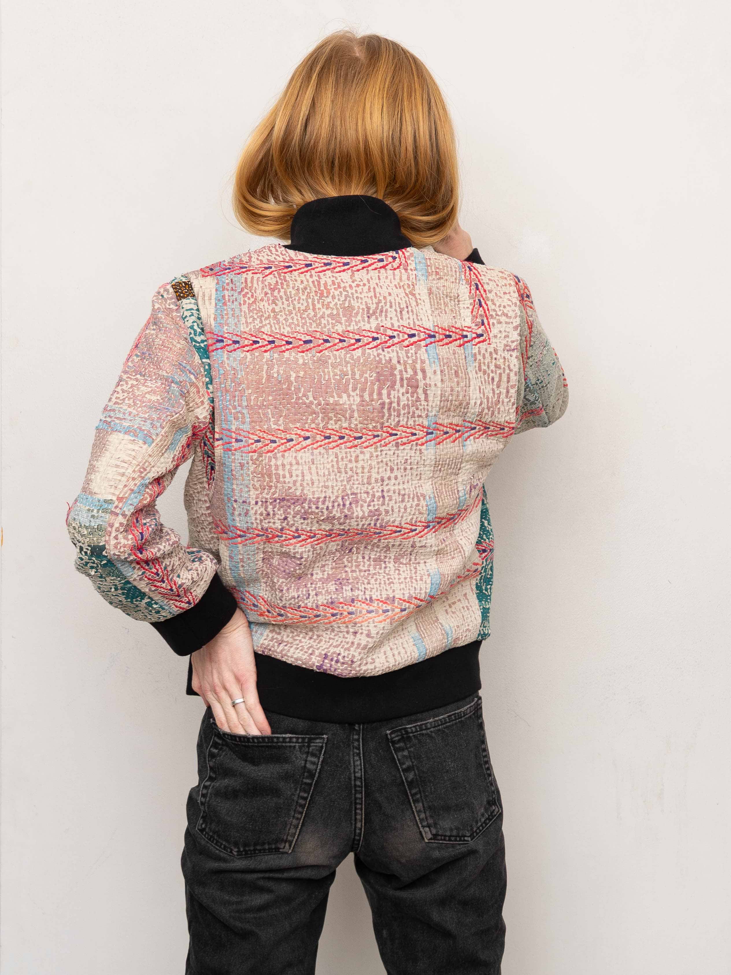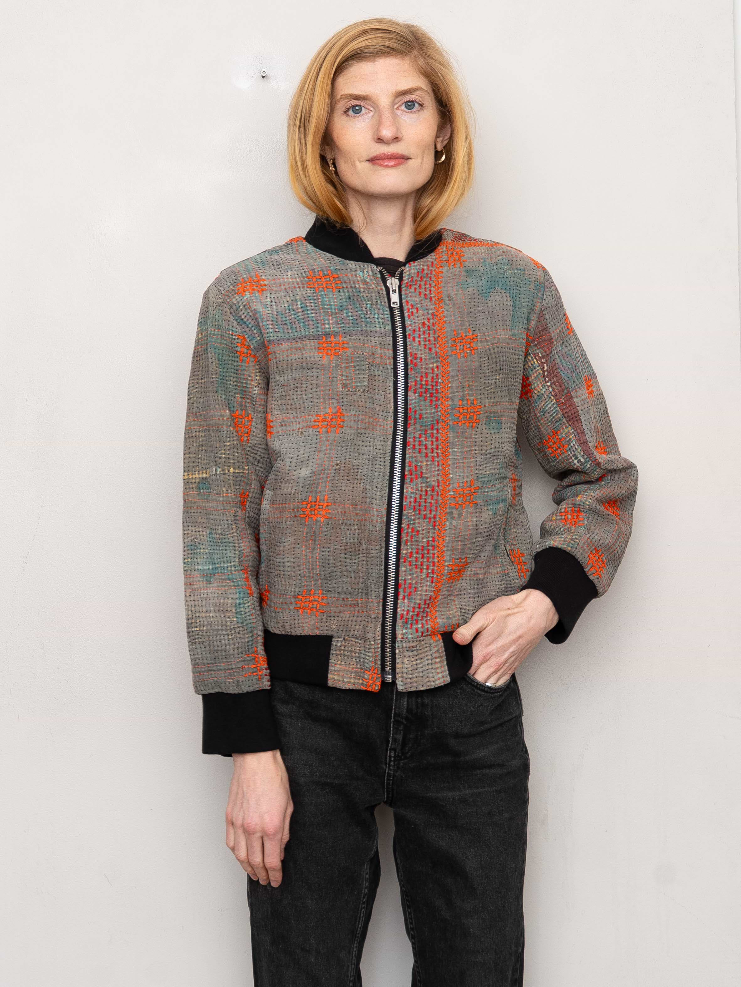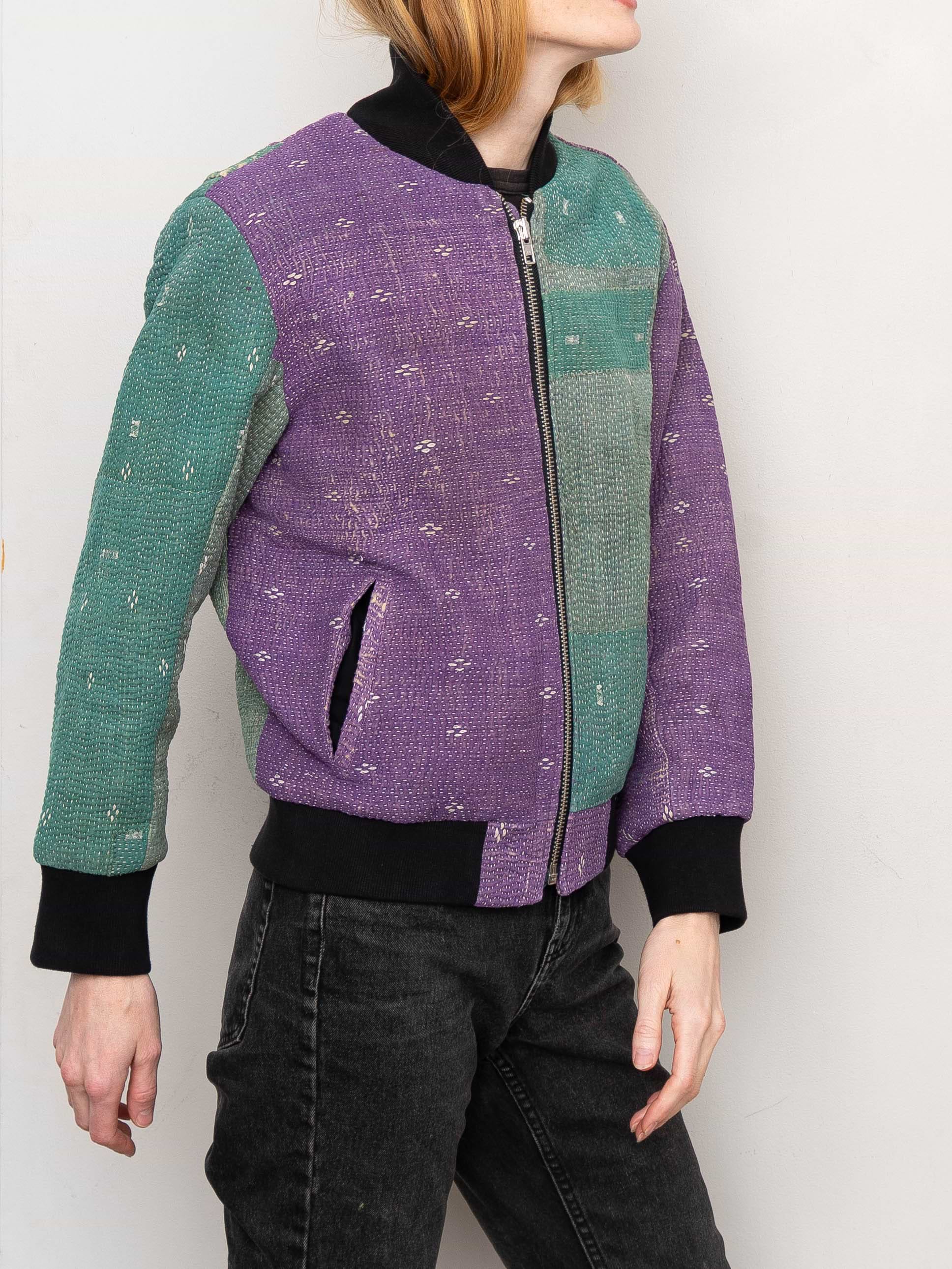 The quilting adds structure without heaviness, creating a piece that feels substantial yet breathable. Ribbed detailing and a relaxed fit give Veda its familiar bomber ease, while the textile itself tells a deeper story — one rooted in reuse, craftsmanship, and slow design.