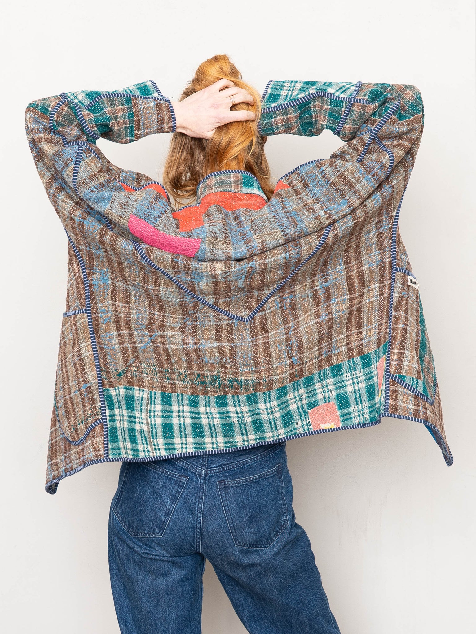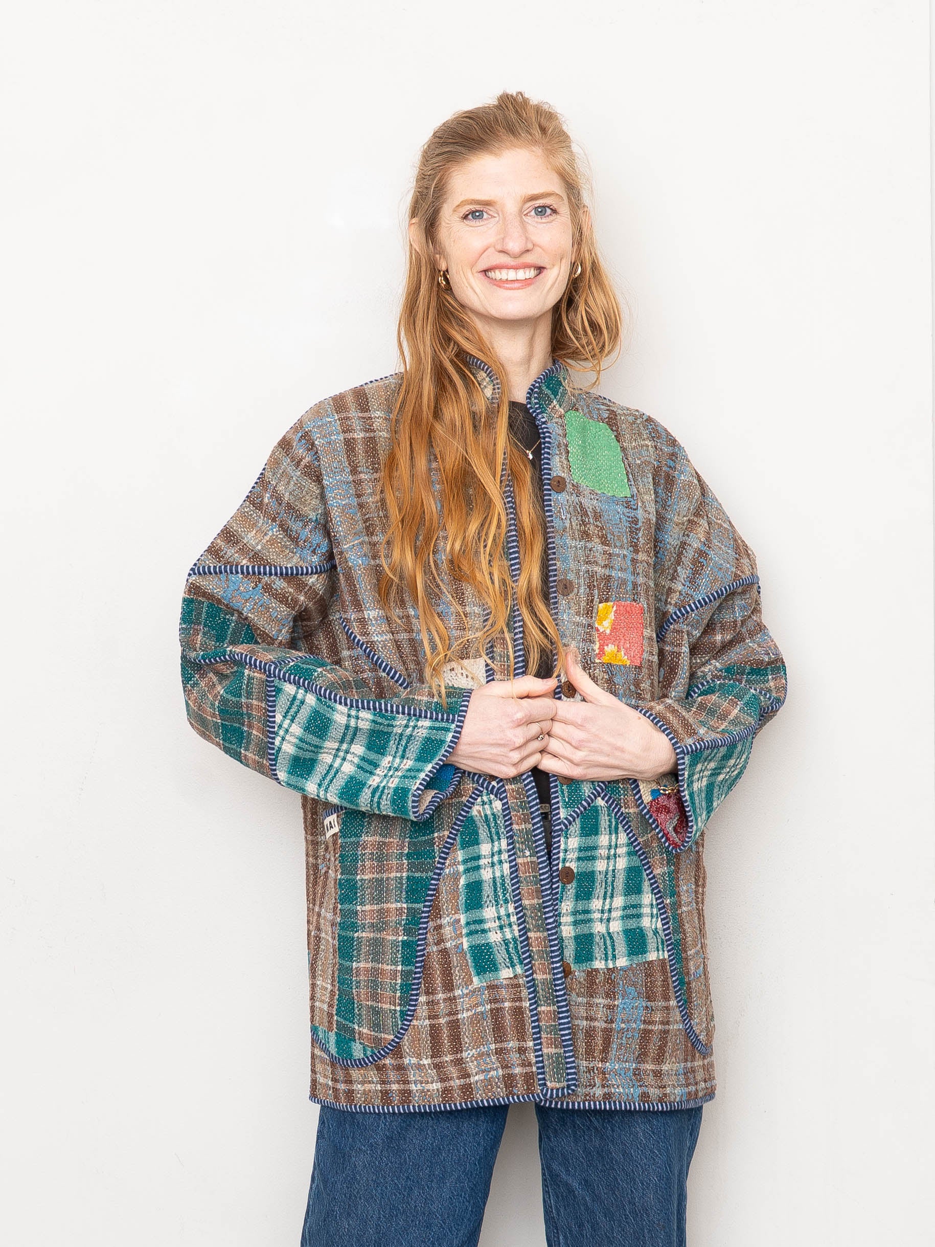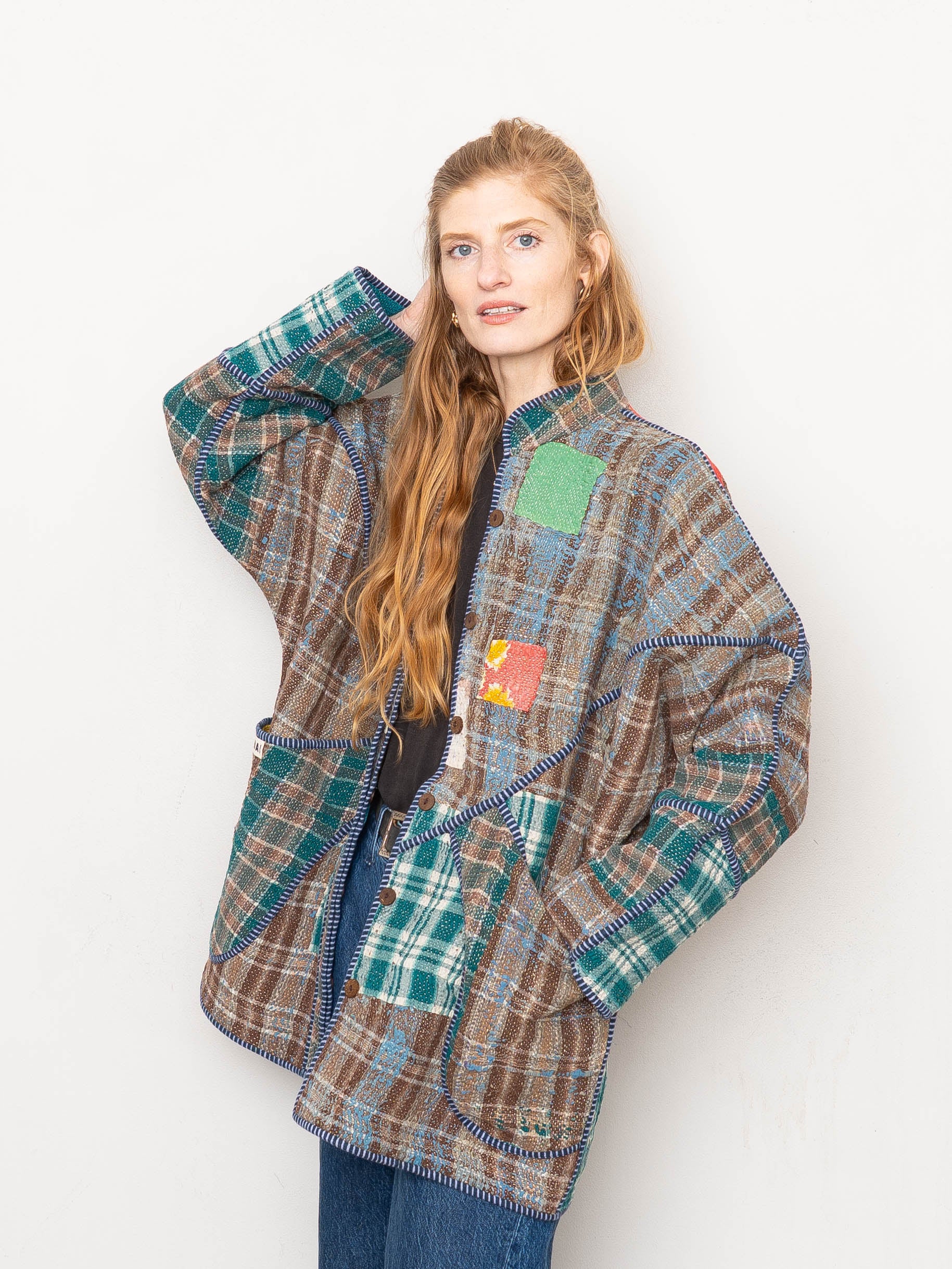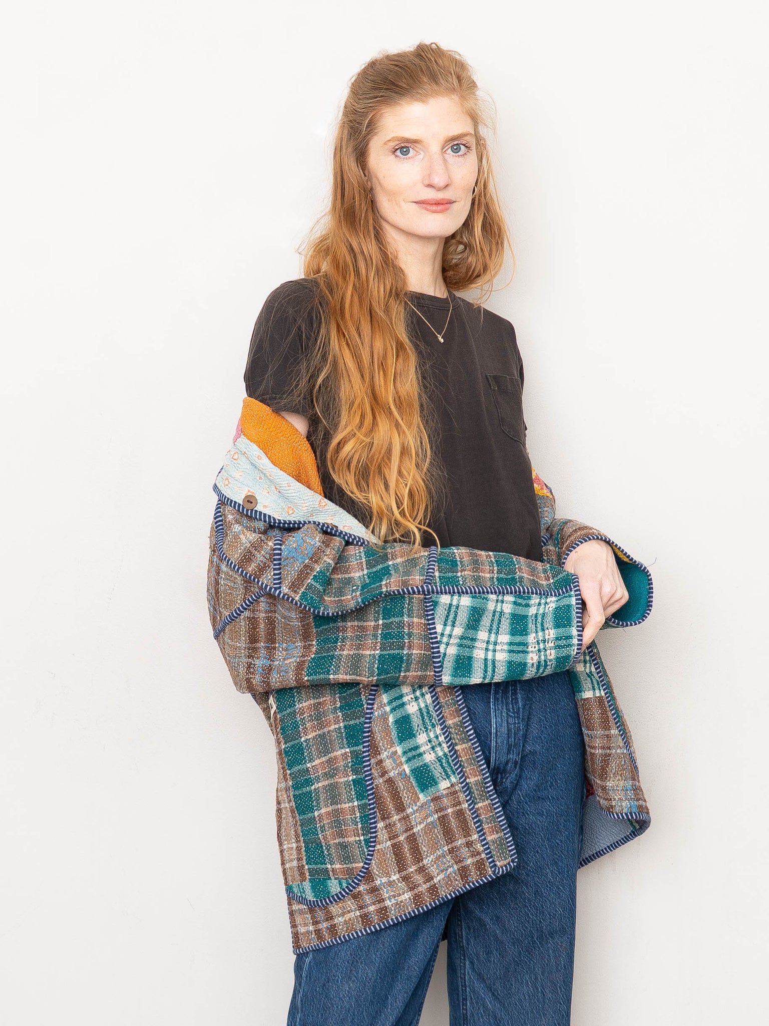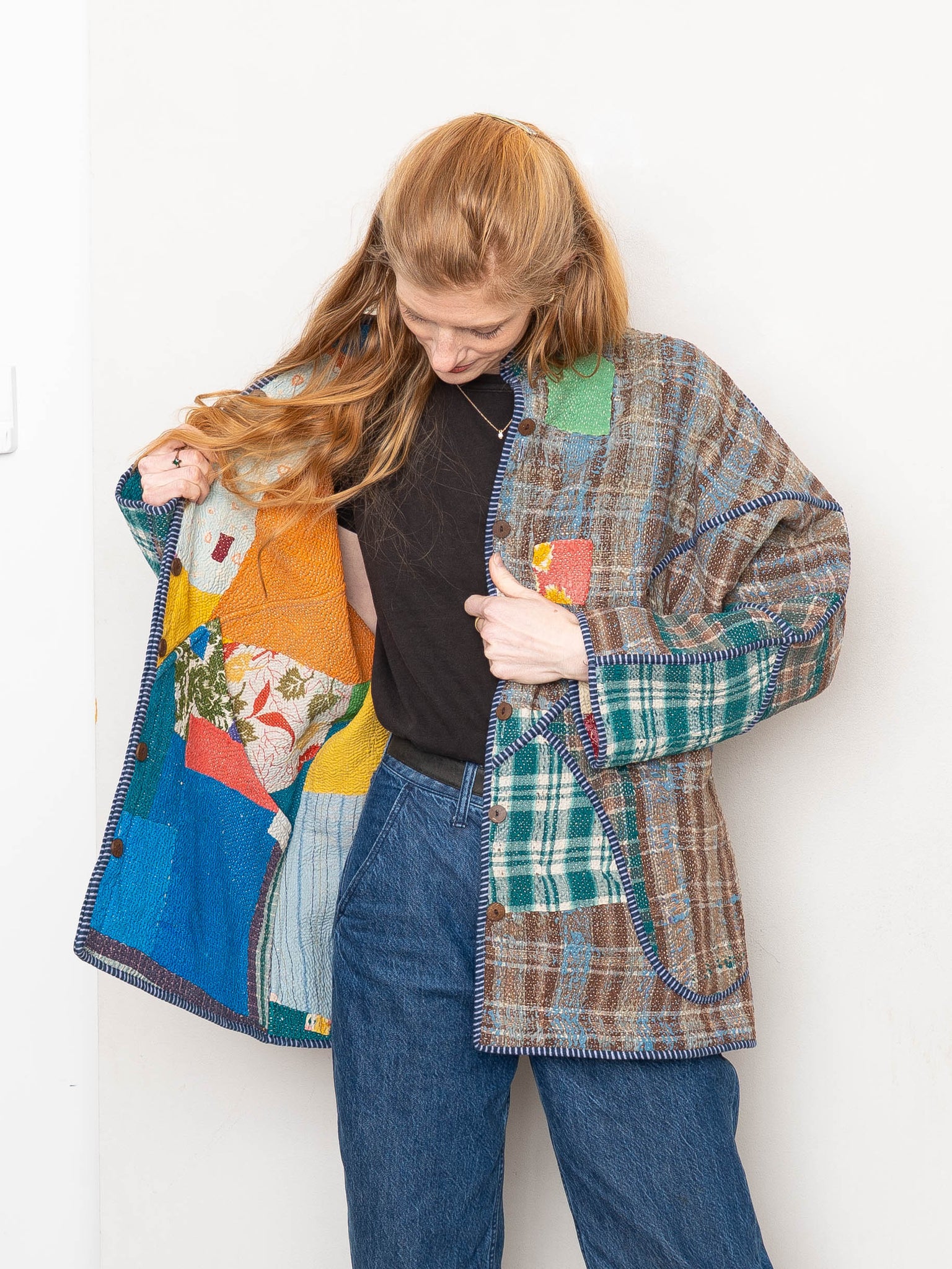 The Narmada Jacket is a relaxed, thigh-length style with an easy, oversized fit and generous patch pockets on both sides. Fully reversible and made from vintage Kantha quilts, each piece is completely one of a kind—no two are alike. Designed with thoughtful details like rollable sleeves, a mandarin collar, and coconut shell buttons on both sides for effortless wear.