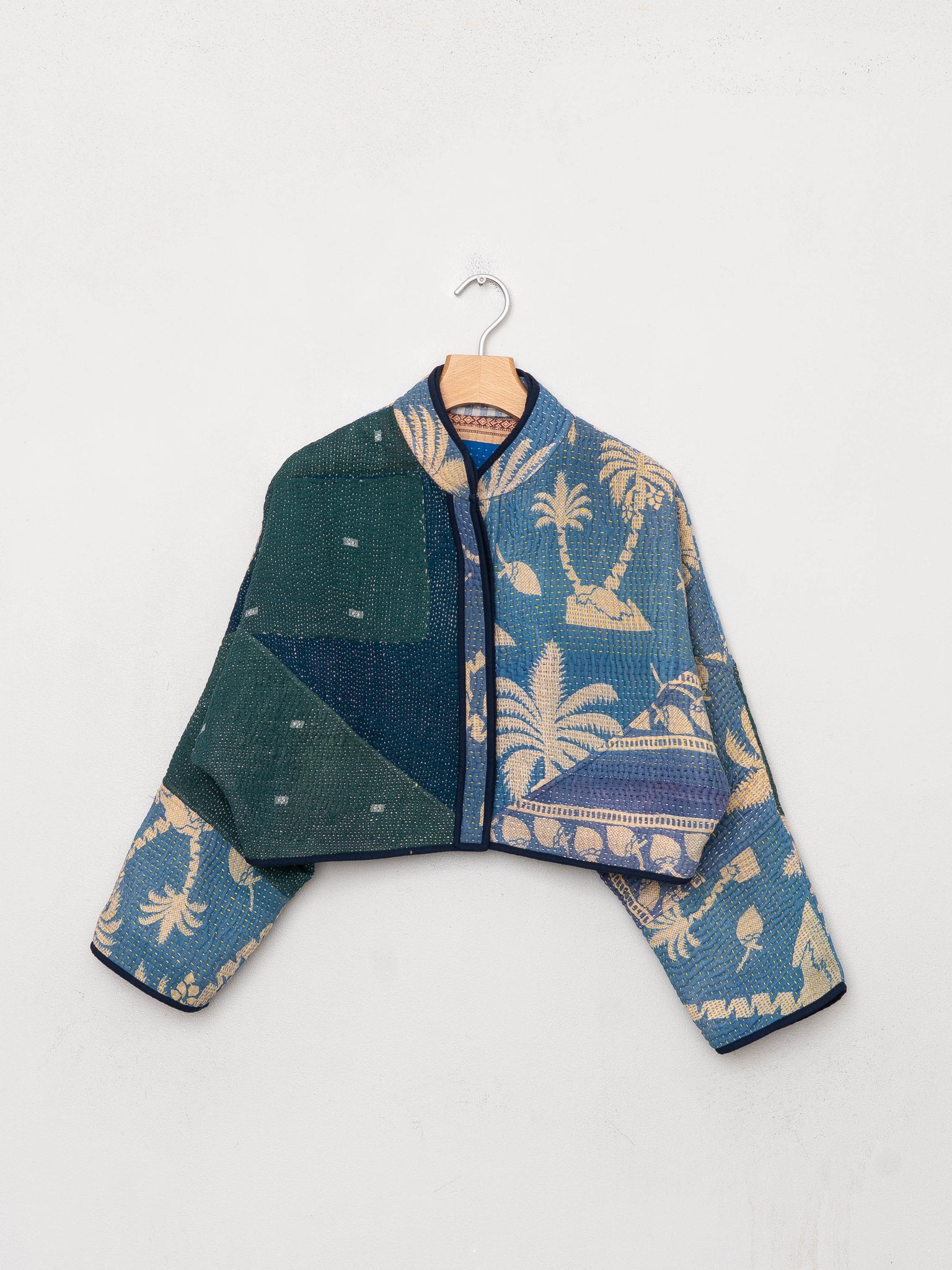 • The Kaira Jacket is a fully reversible cropped quilted jacket made from vintage Kantha quilts, each with its own stitching, layout, and patina (signs of age). Its boxy silhouette, mandarin collar, and rollable sleeves create a clean, modern shape that stands apart from mass-market cropped jacket styles.