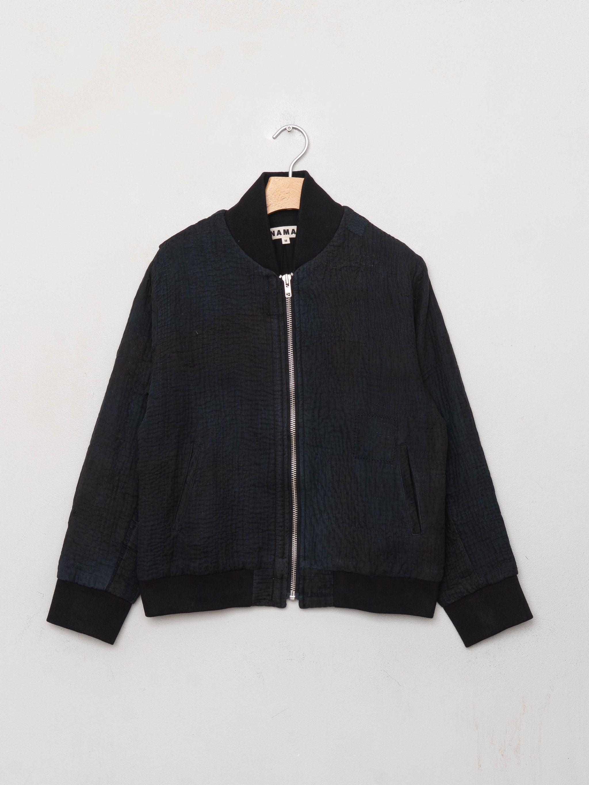 The Veda Quilted Bomber Jacket has a relaxed, easy fit, with the hem sitting at the high hip. It’s finished with a silver metal zipper, black cotton stretch collar and waistband, and thoughtfully placed side pockets. Inside, you’ll find cotton-voile lining and an interior pocket for essentials. Each piece is one of one.
