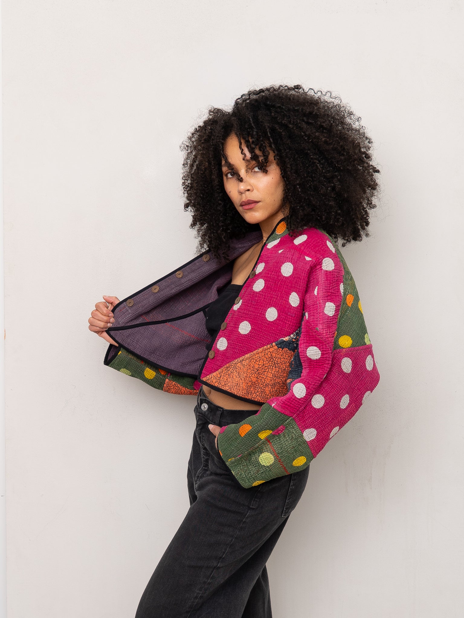The Kaira Cropped Jacket is a relaxed, cropped jacket with a boxy silhouette and easy, oversized fit. Fully reversible and made from vintage Kantha quilts, each piece is completely one of a kind—no two are alike. Designed with thoughtful details like coconut shell buttons on both sides, a mandarin collar, and rollable sleeves to reveal the contrast interior.