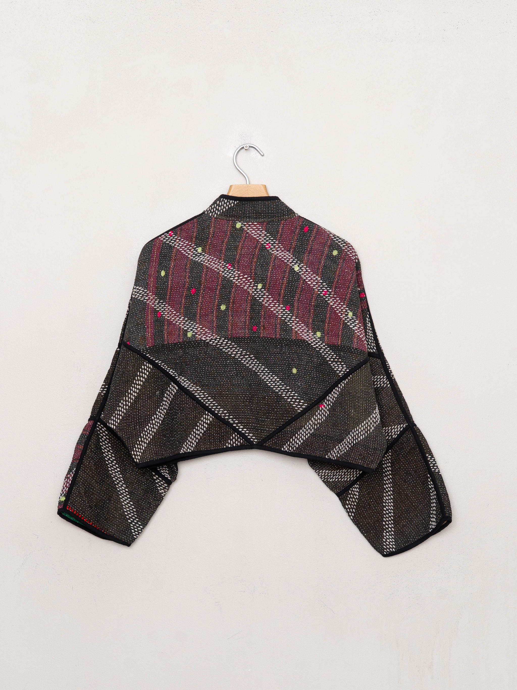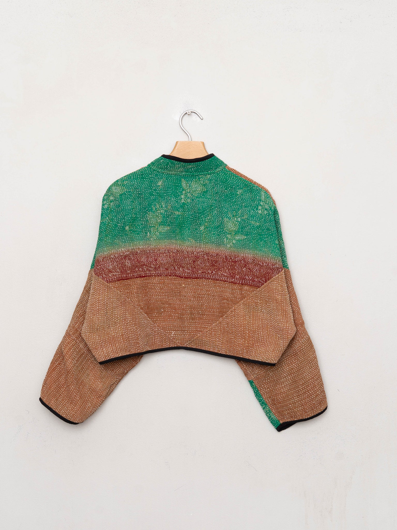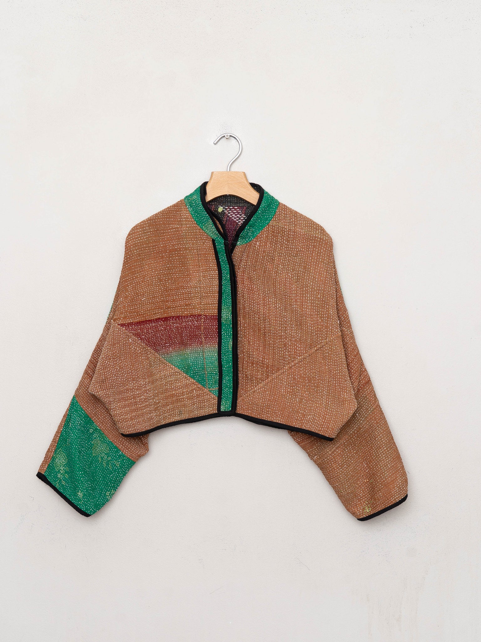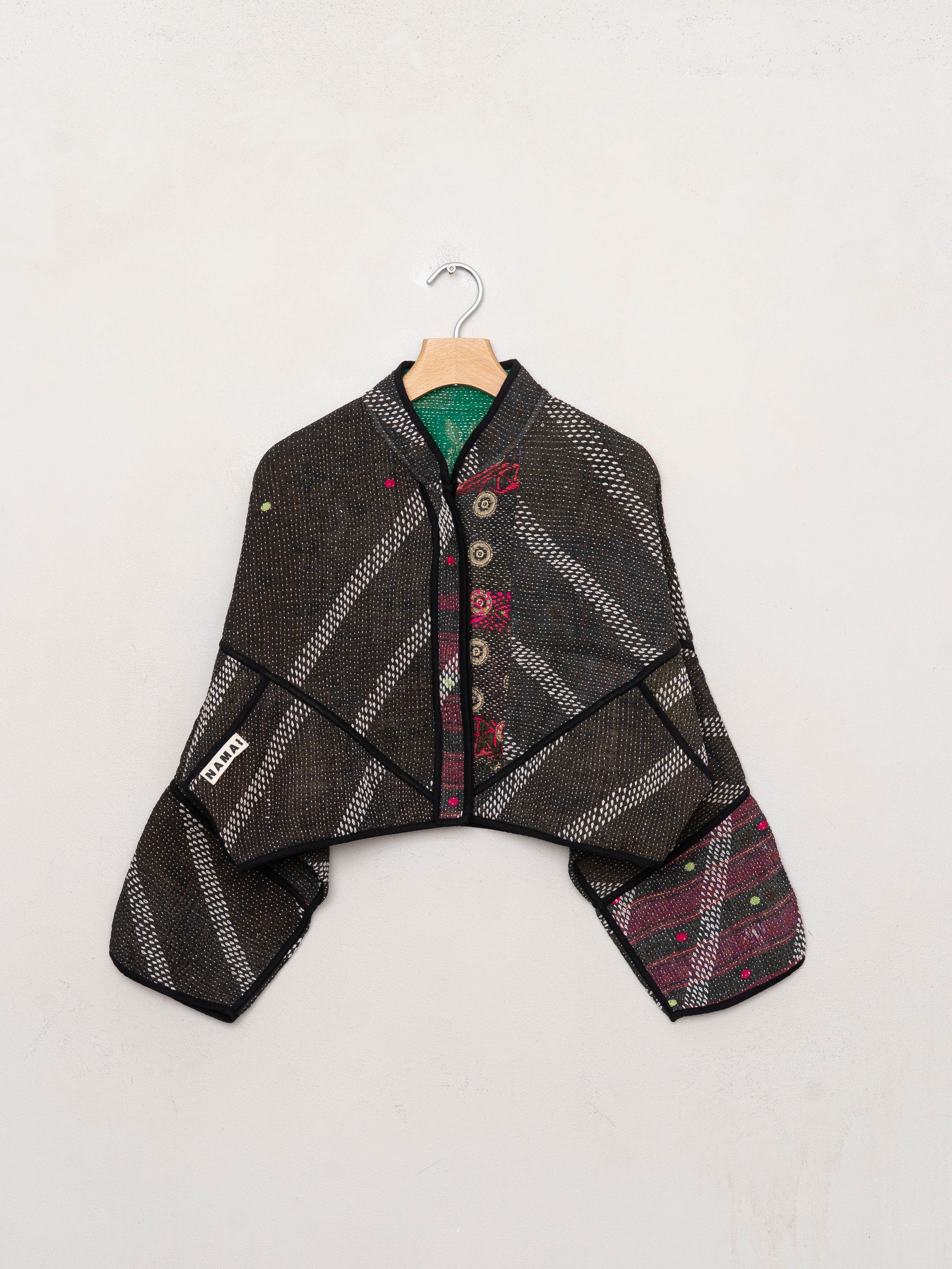 • The Kaira Jacket is a fully reversible cropped quilted jacket made from vintage Kantha quilts, each with its own stitching, layout, and patina (signs of age). Its boxy silhouette, mandarin collar, and rollable sleeves create a clean, modern shape that stands apart from mass-market cropped jacket styles.