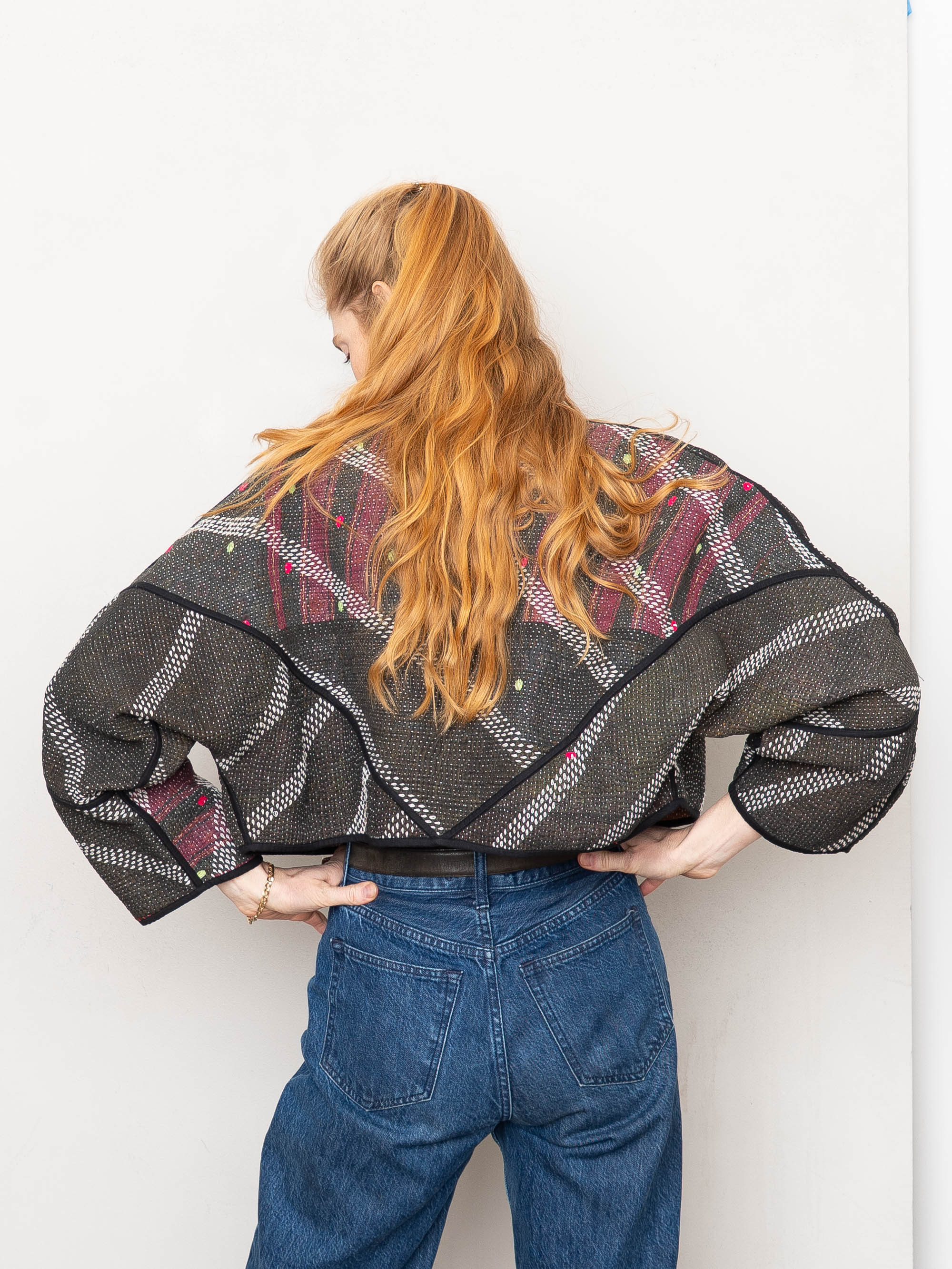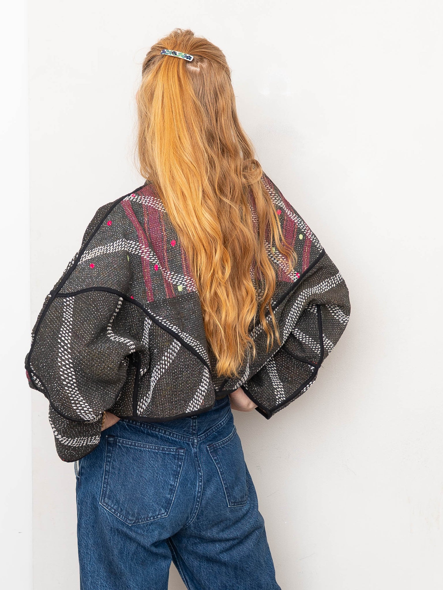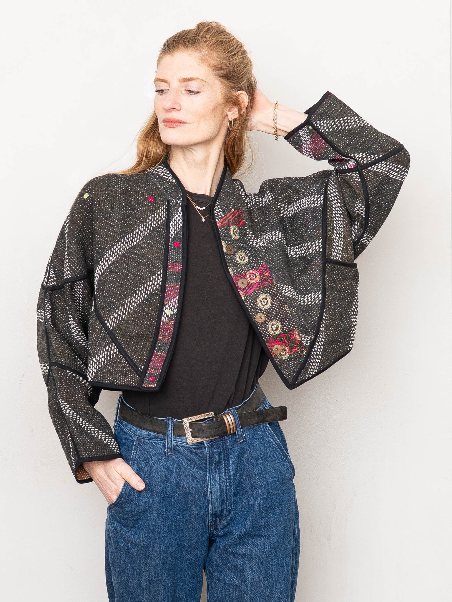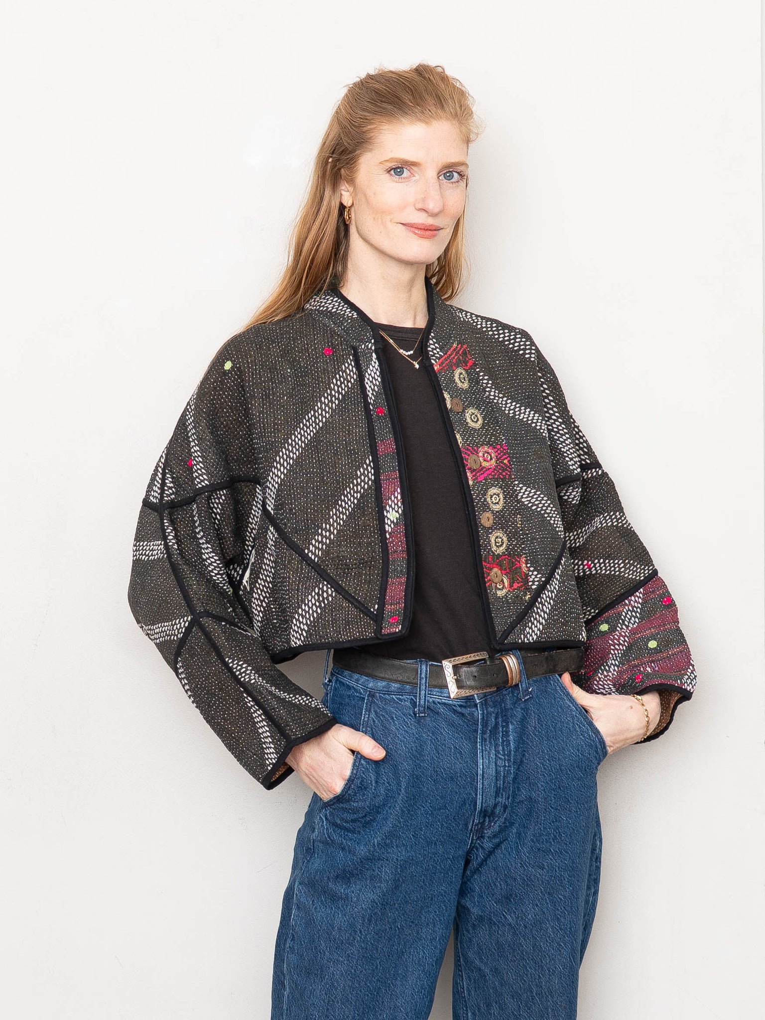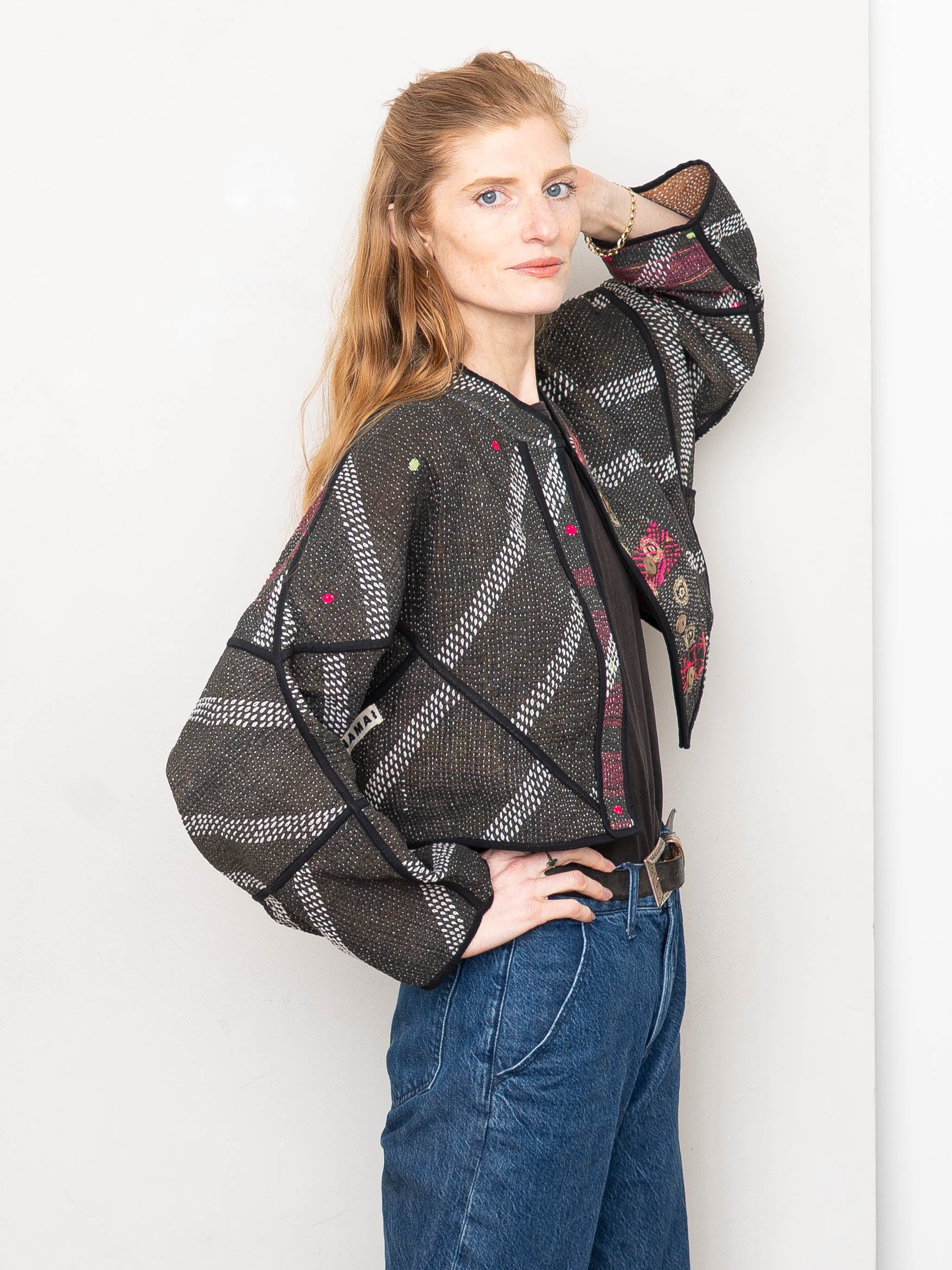 • The Kaira Jacket is a fully reversible cropped quilted jacket made from vintage Kantha quilts, each with its own stitching, layout, and patina (signs of age). Its boxy silhouette, mandarin collar, and rollable sleeves create a clean, modern shape that stands apart from mass-market cropped jacket styles.