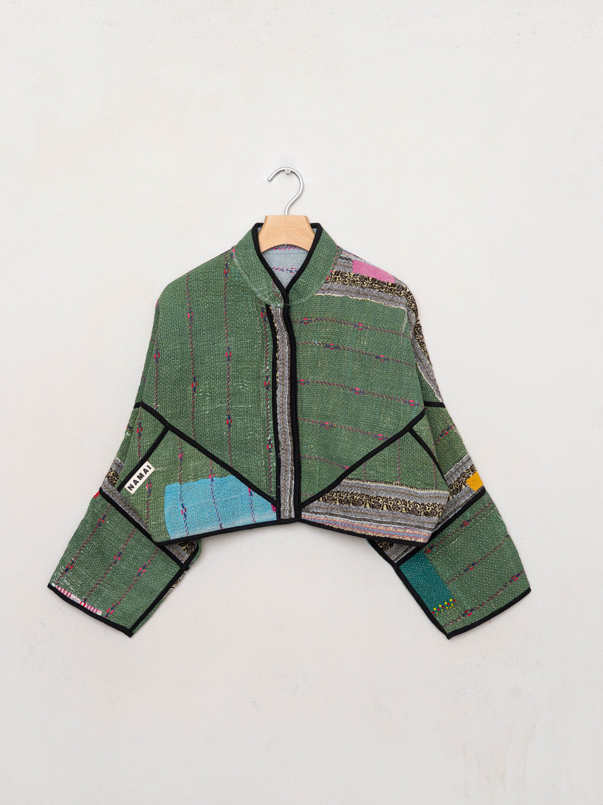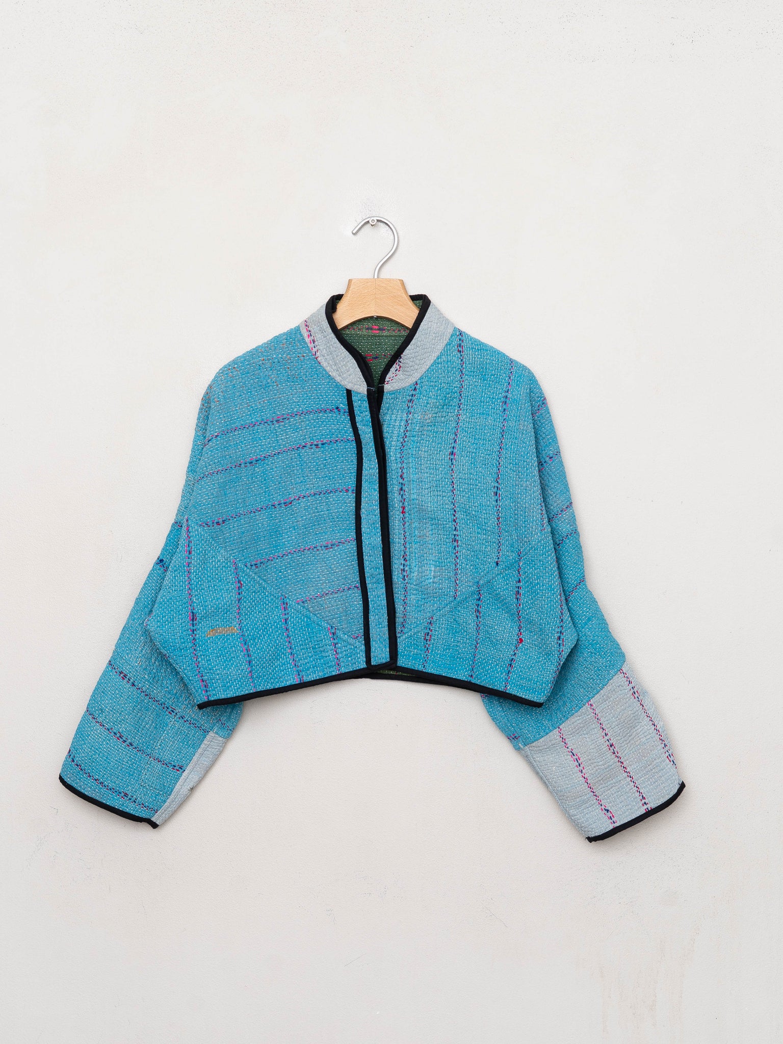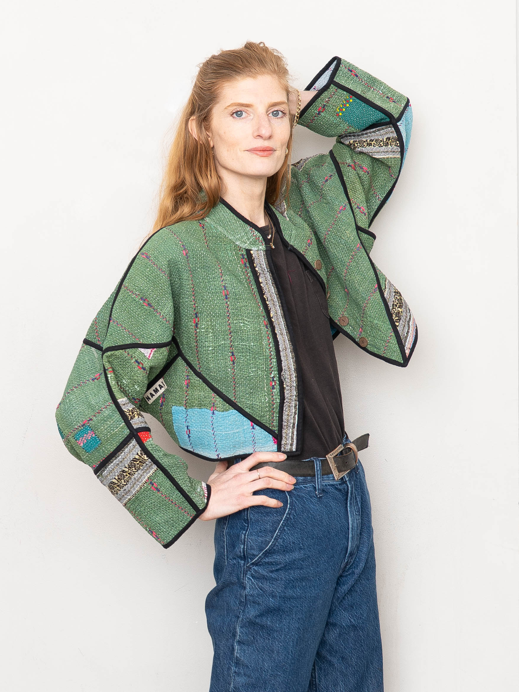 • The Kaira Jacket is a fully reversible cropped quilted jacket made from vintage Kantha quilts, each with its own stitching, layout, and patina (signs of age). Its boxy silhouette, mandarin collar, and rollable sleeves create a clean, modern shape that stands apart from mass-market cropped jacket styles.