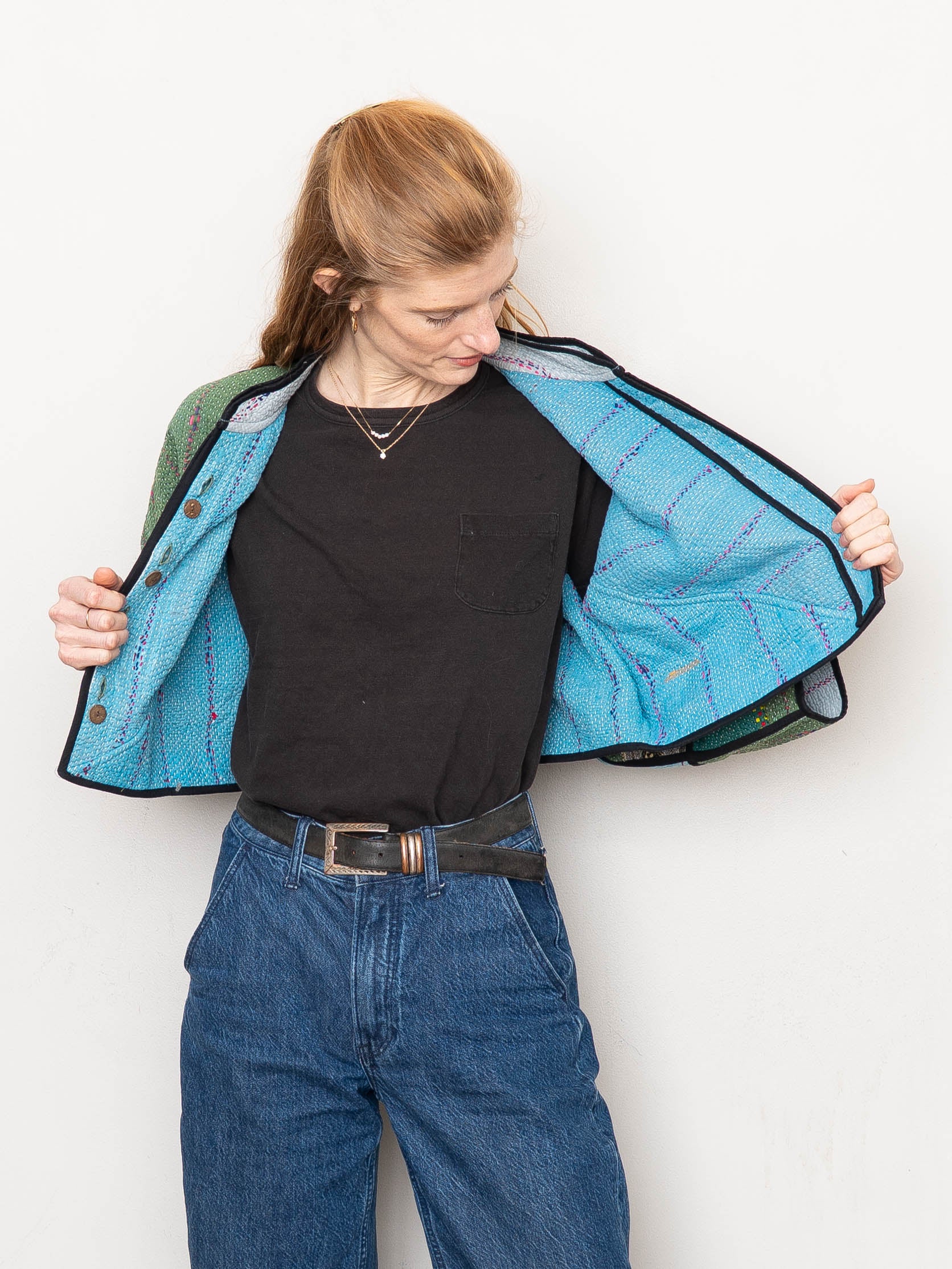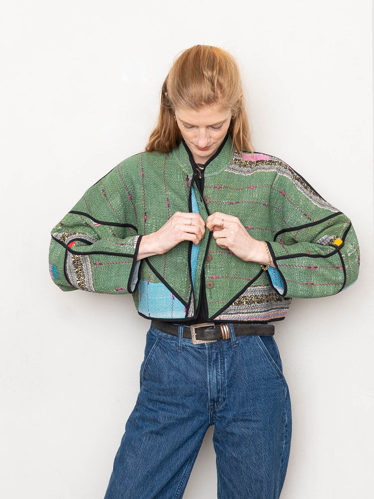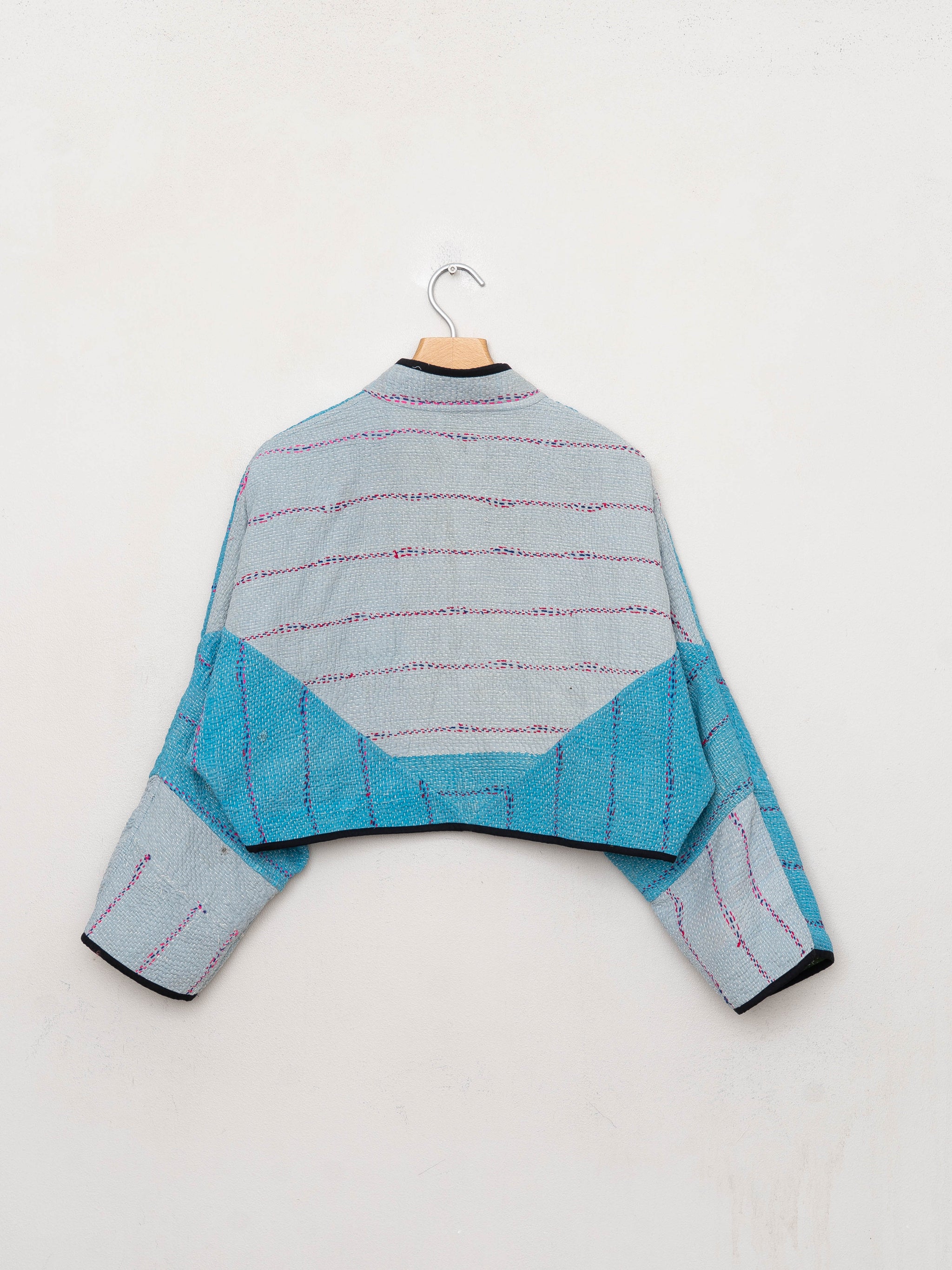 • The Kaira Jacket is a fully reversible cropped quilted jacket made from vintage Kantha quilts, each with its own stitching, layout, and patina (signs of age). Its boxy silhouette, mandarin collar, and rollable sleeves create a clean, modern shape that stands apart from mass-market cropped jacket styles.