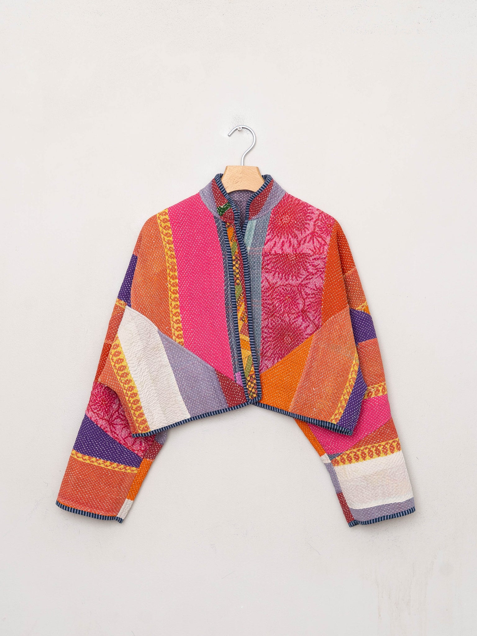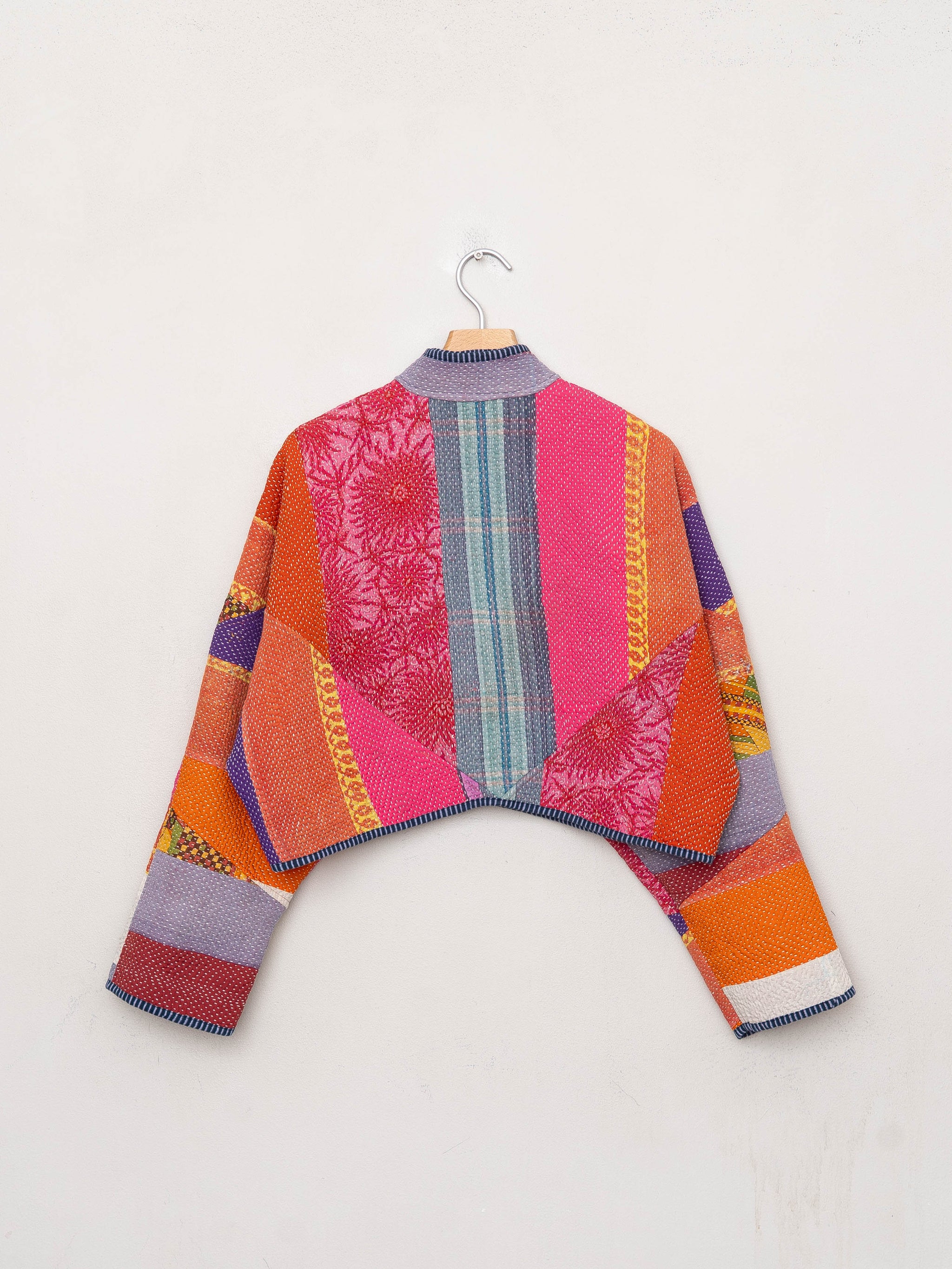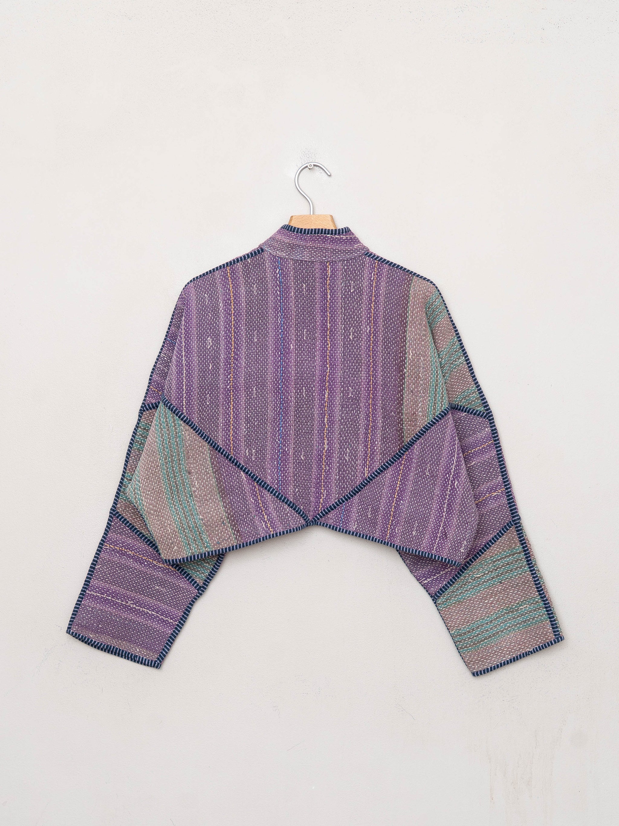 • The Kaira Jacket is a fully reversible cropped quilted jacket made from vintage Kantha quilts, each with its own stitching, layout, and patina (signs of age). Its boxy silhouette, mandarin collar, and rollable sleeves create a clean, modern shape that stands apart from mass-market cropped jacket styles.