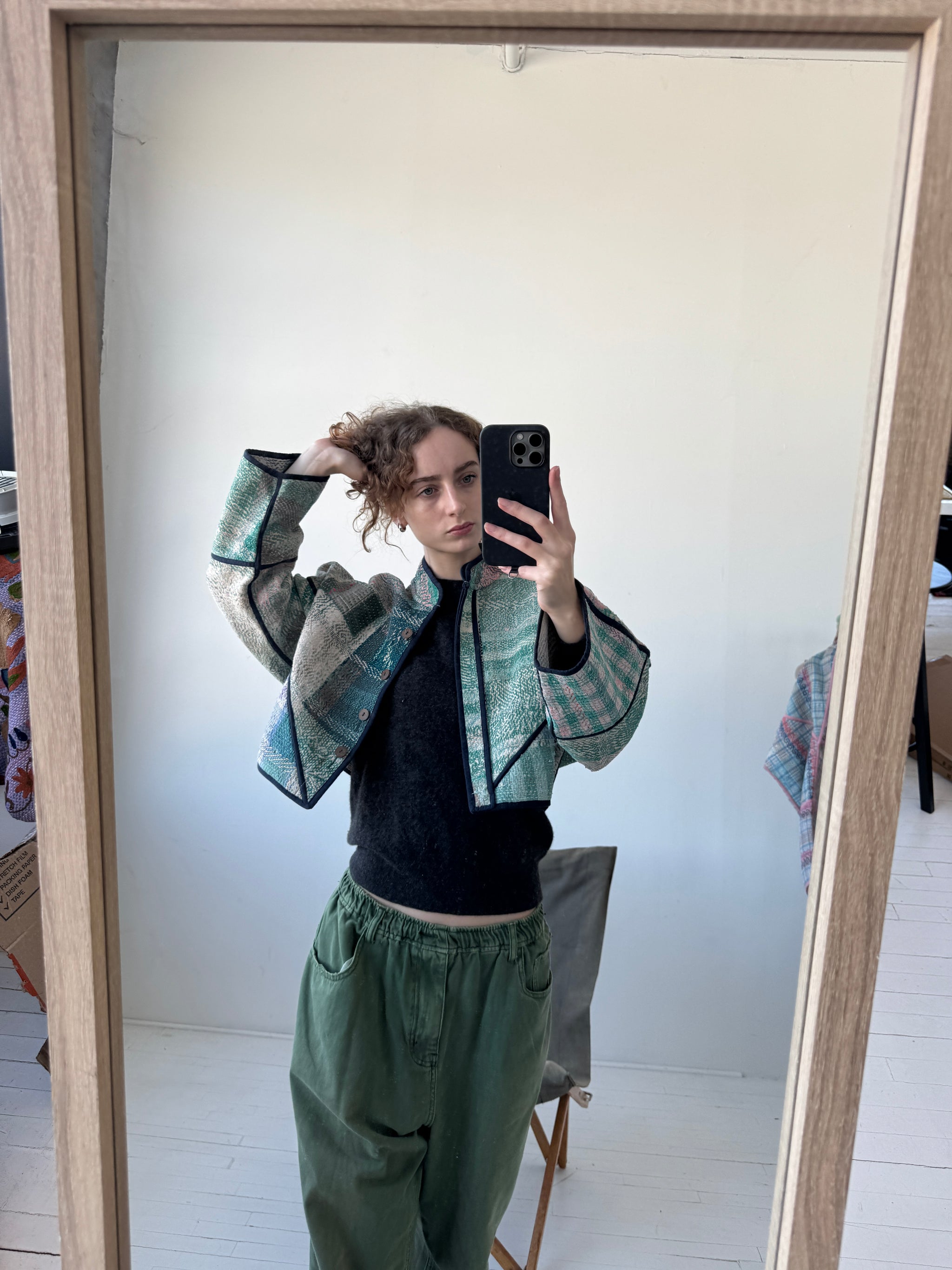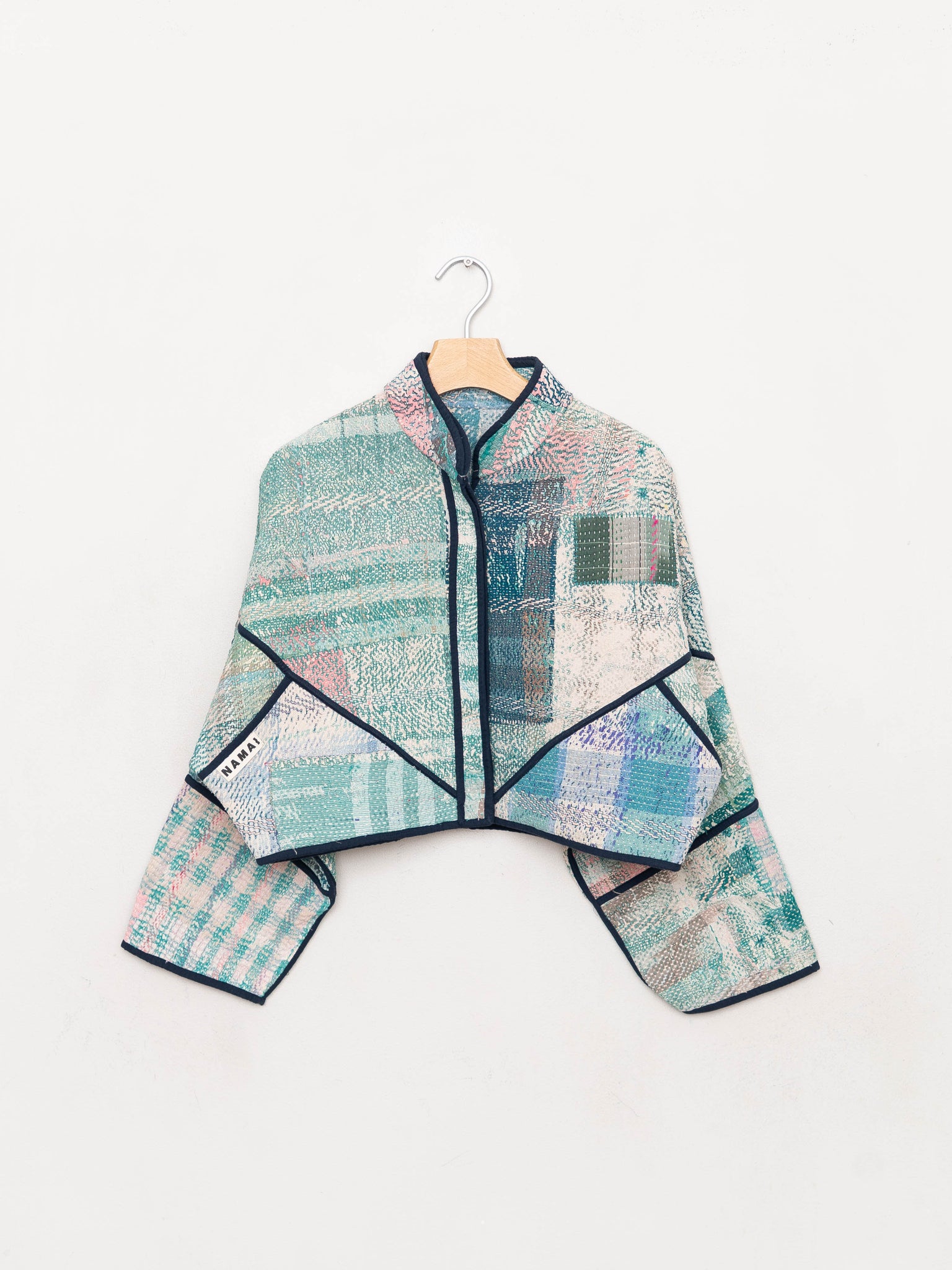 • The Kaira Jacket is a fully reversible cropped quilted jacket made from vintage Kantha quilts, each with its own stitching, layout, and patina (signs of age). Its boxy silhouette, mandarin collar, and rollable sleeves create a clean, modern shape that stands apart from mass-market cropped jacket styles.