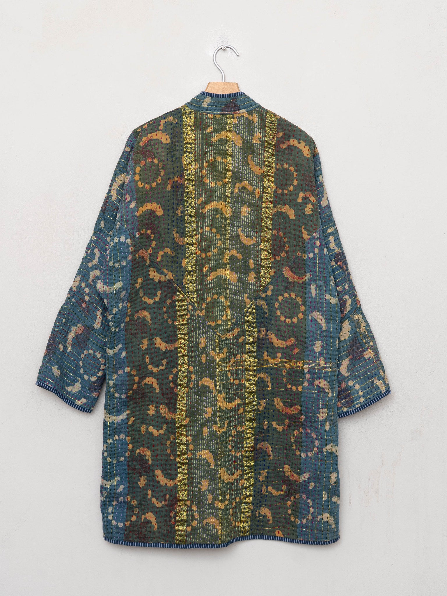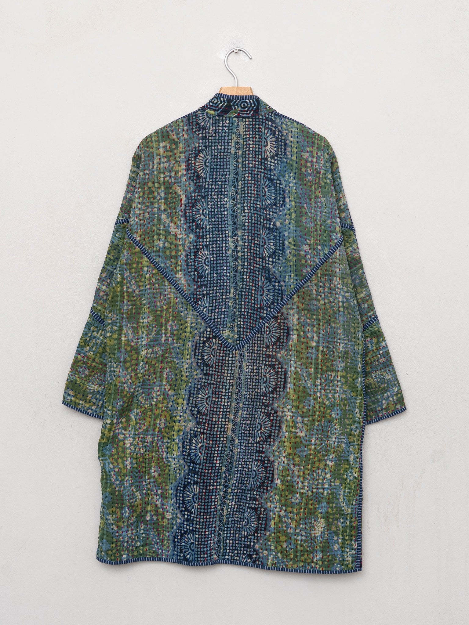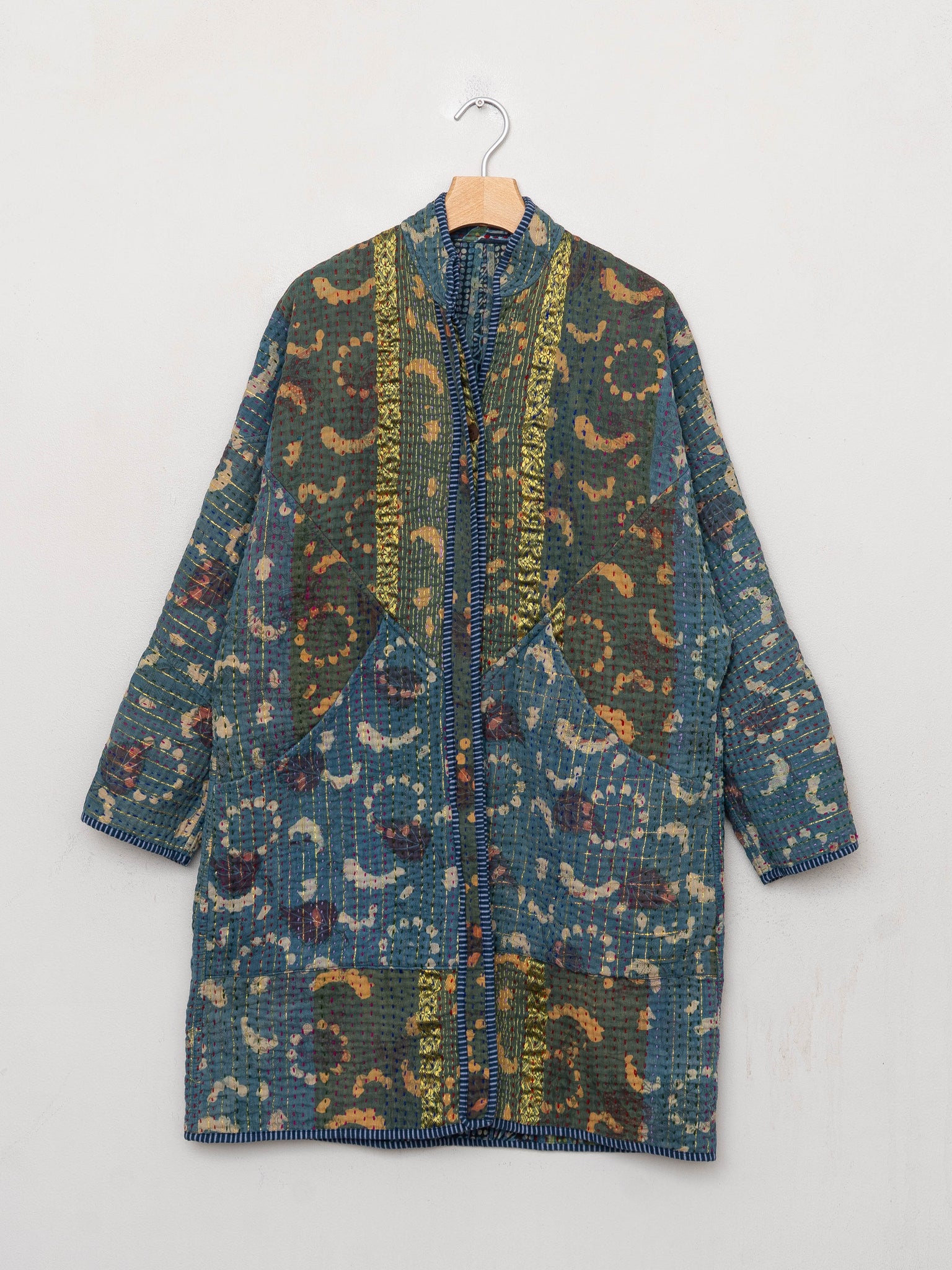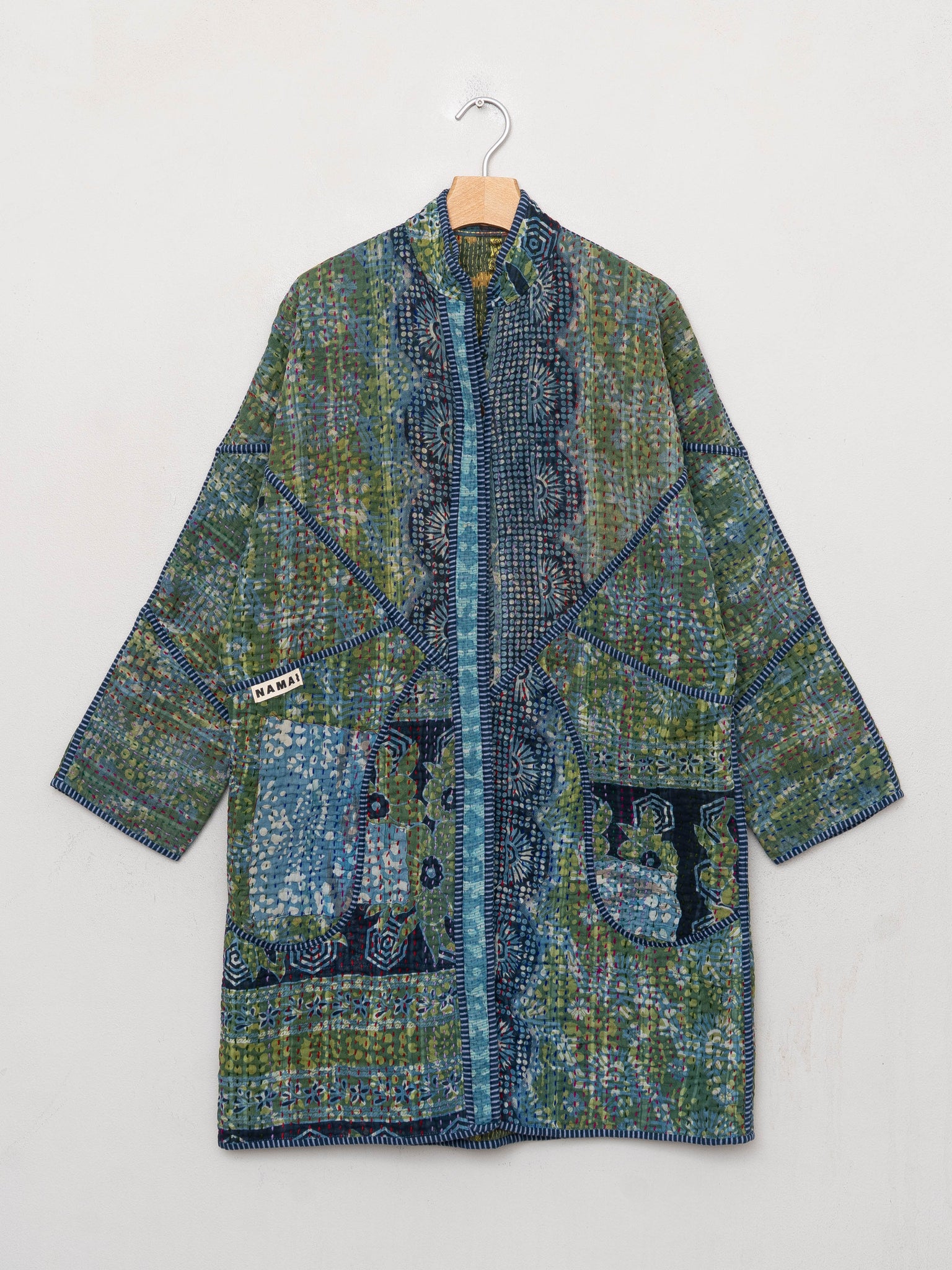 • The Sai Coat is a fully reversible long quilted jacket made from vintage Kantha quilts, finished with a double-sided collar stand, roomy pockets, and clean bias binding along the seams. Its longer silhouette offers a naturally expressive drape without feeling heavy.