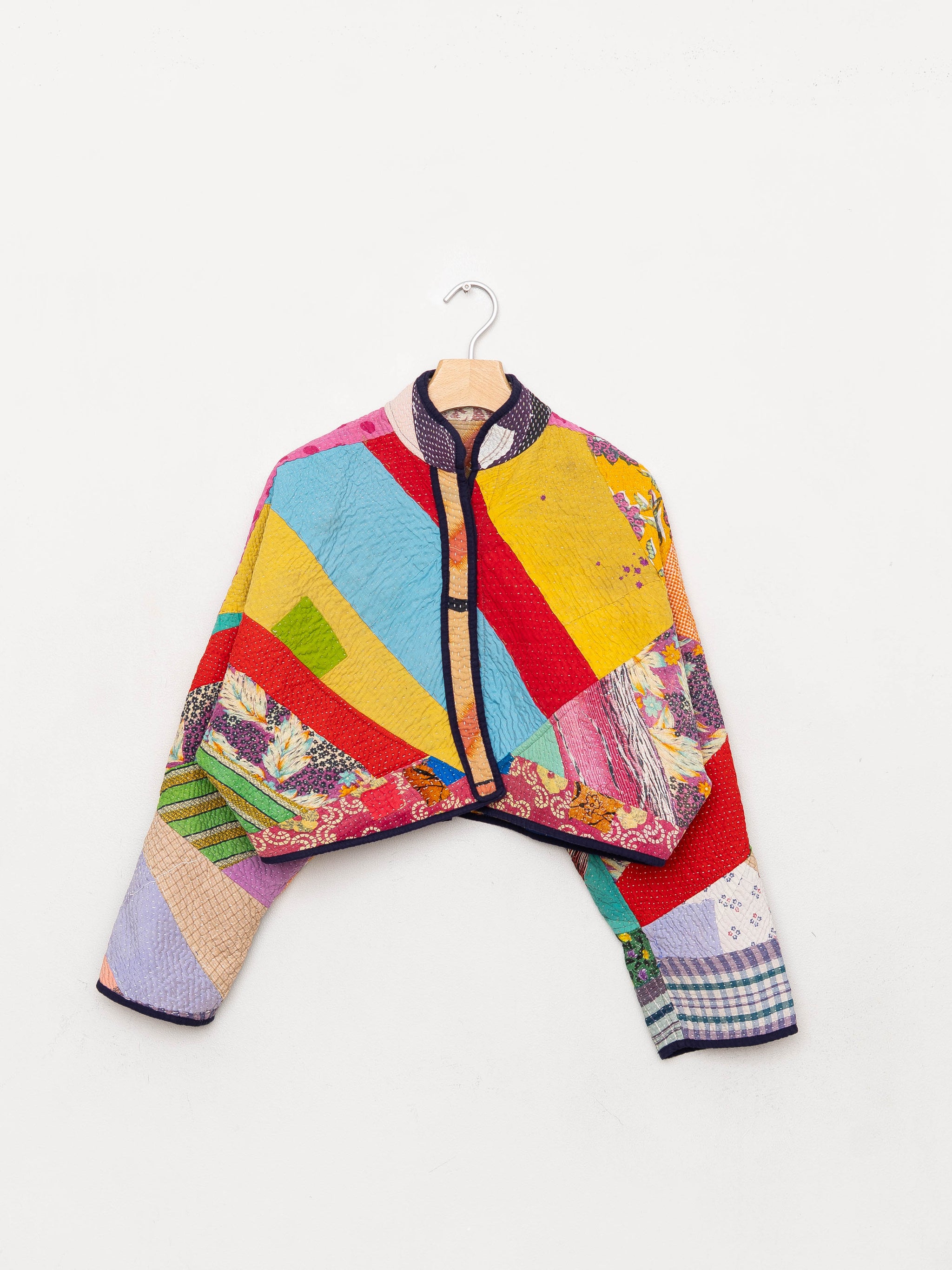 • The Kaira Jacket is a fully reversible cropped quilted jacket made from vintage Kantha quilts, each with its own stitching, layout, and patina (signs of age). Its boxy silhouette, mandarin collar, and rollable sleeves create a clean, modern shape that stands apart from mass-market cropped jacket styles.