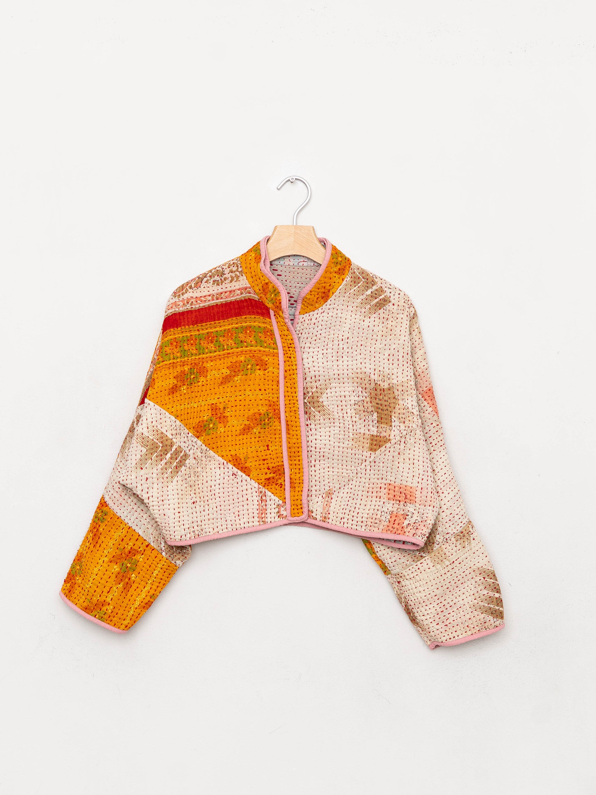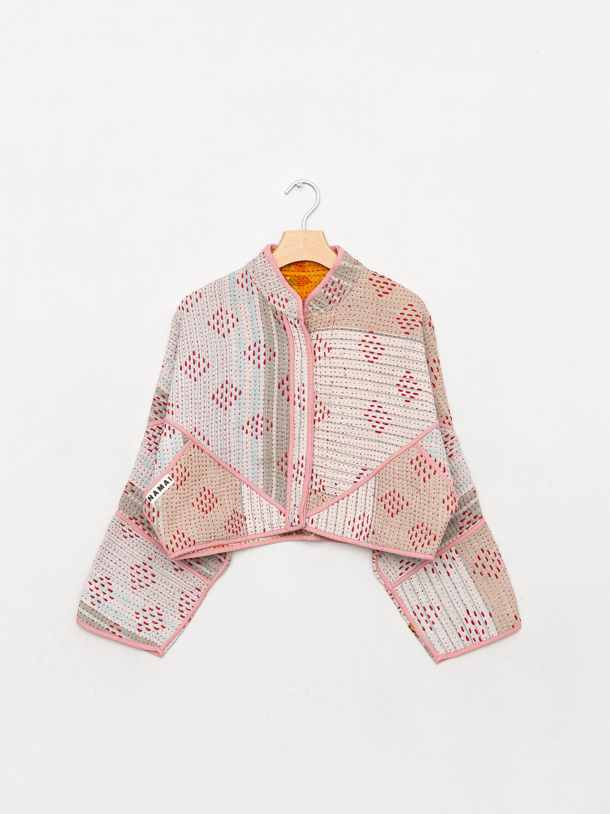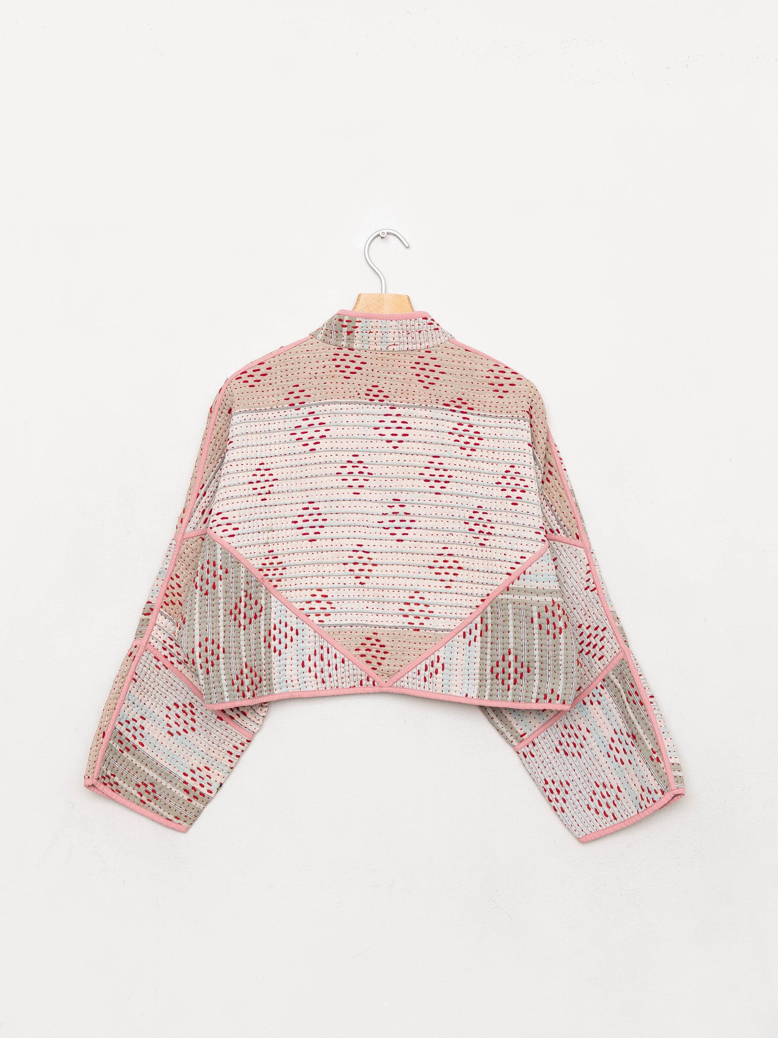 • The Kaira Jacket is a fully reversible cropped quilted jacket made from vintage Kantha quilts, each with its own stitching, layout, and patina (signs of age). Its boxy silhouette, mandarin collar, and rollable sleeves create a clean, modern shape that stands apart from mass-market cropped jacket styles.