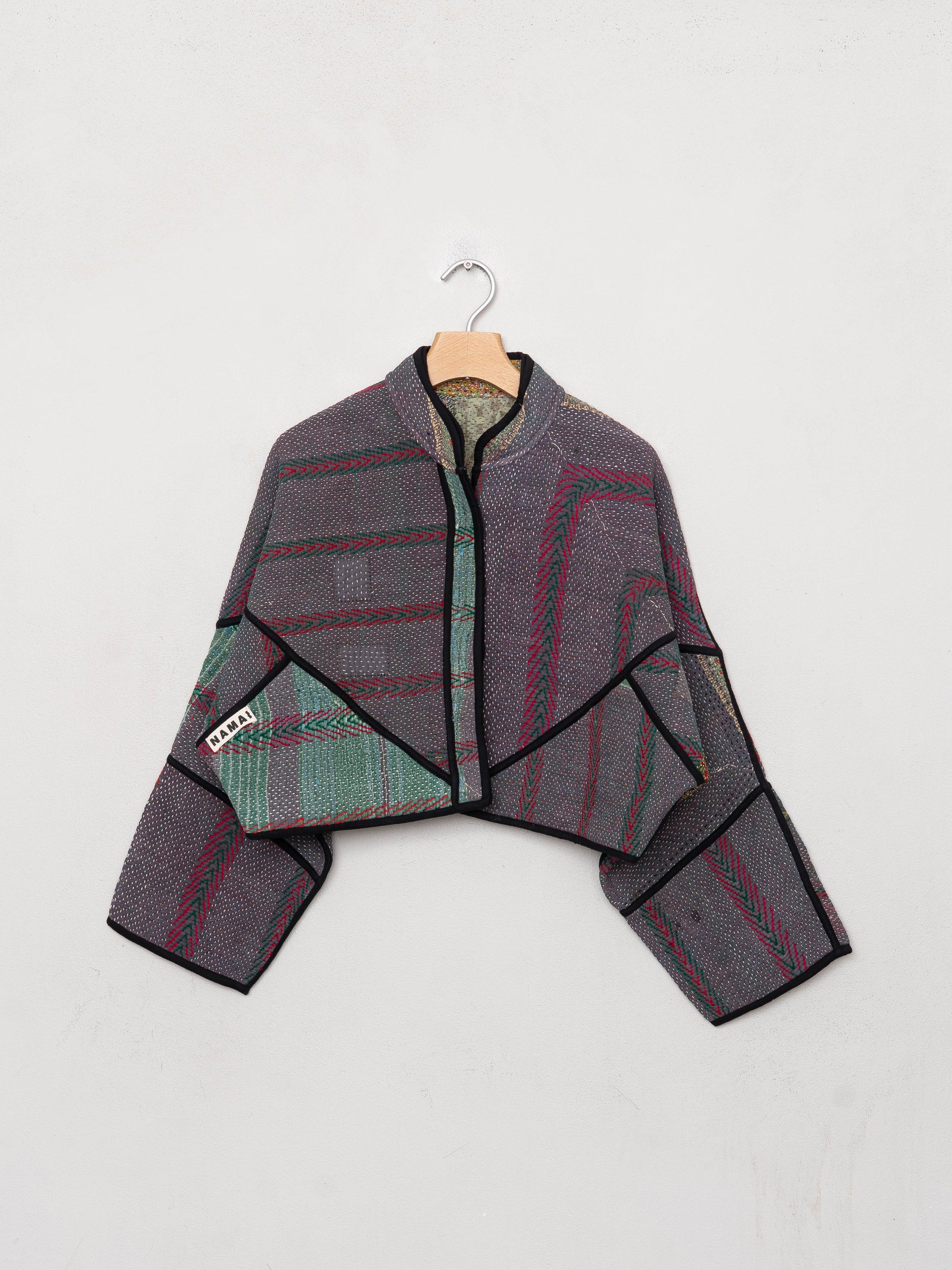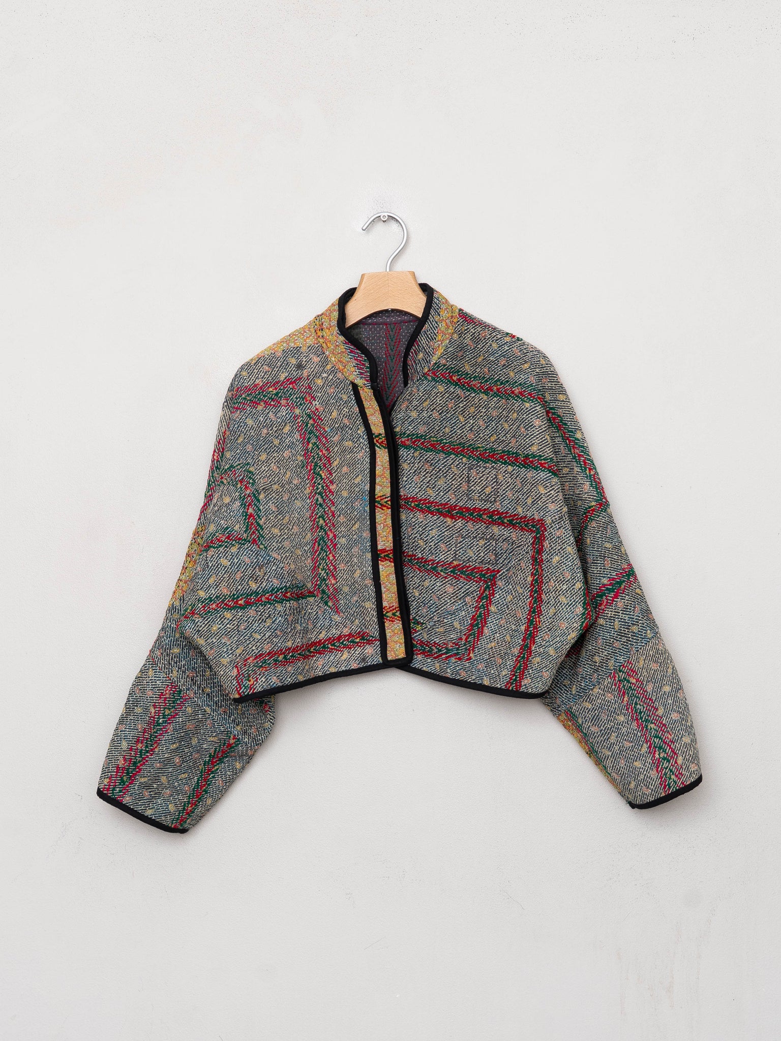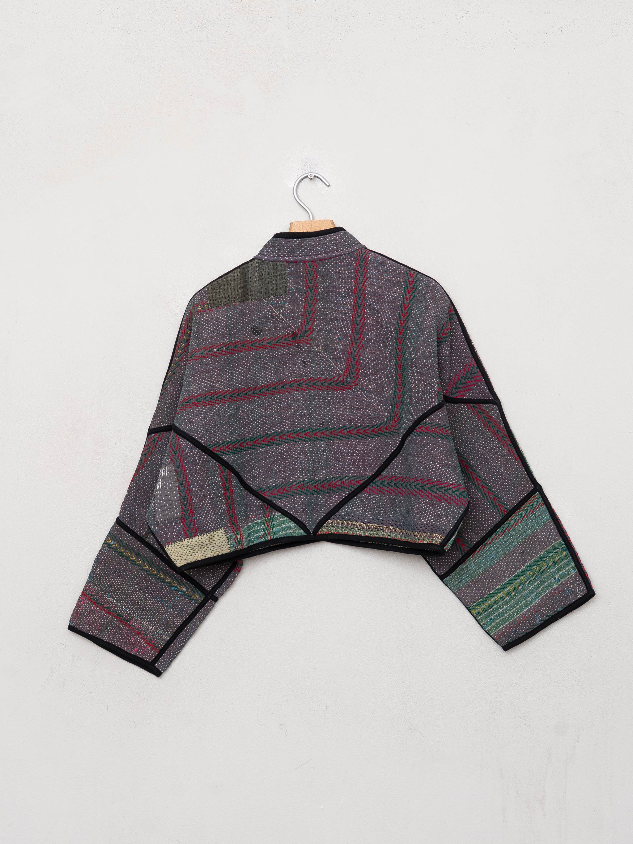 • The Kaira Jacket is a fully reversible cropped quilted jacket made from vintage Kantha quilts, each with its own stitching, layout, and patina (signs of age). Its boxy silhouette, mandarin collar, and rollable sleeves create a clean, modern shape that stands apart from mass-market cropped jacket styles.