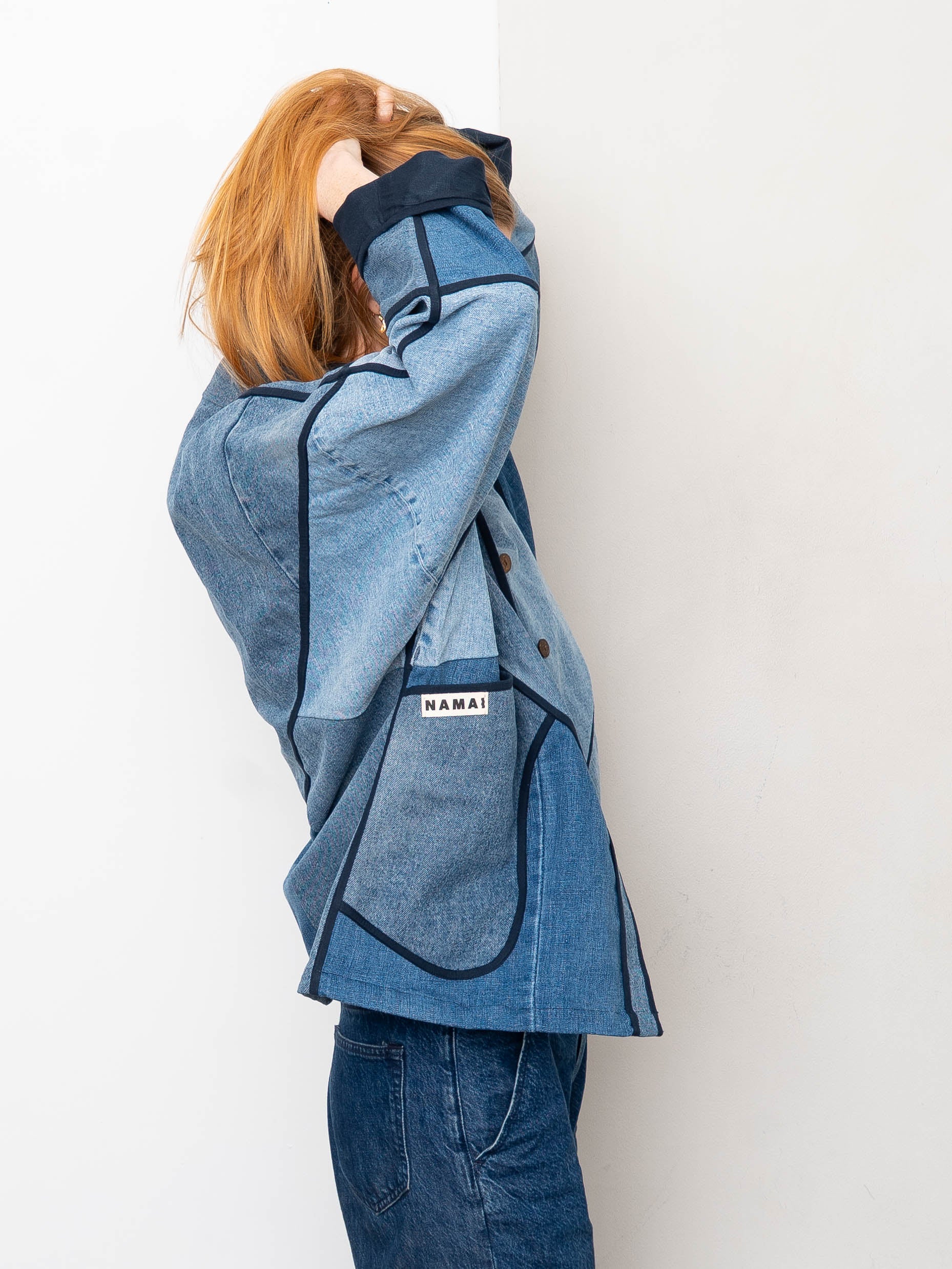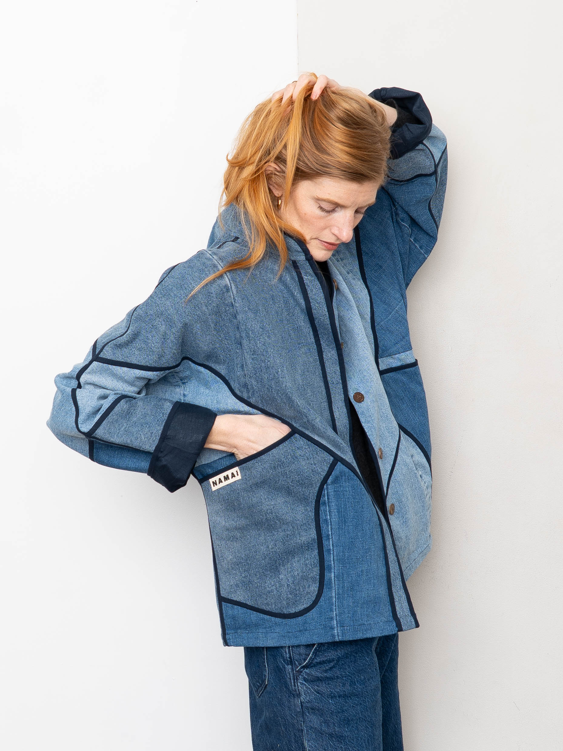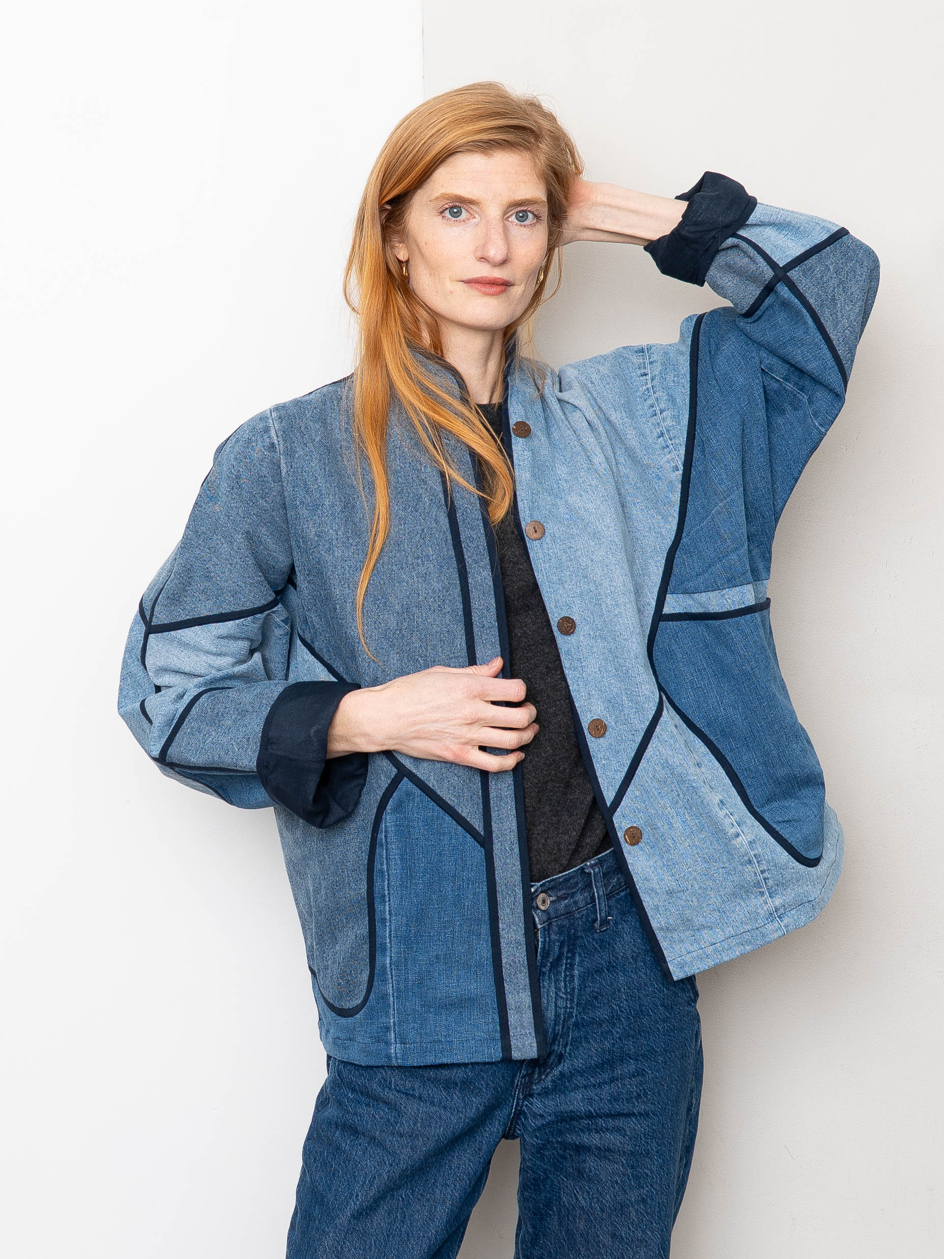 The Ladhiya Denim Jacket has a relaxed fit with a hem that sits just below the hip. It’s available in three sizes and fully lined in soft cotton. Made from upcycled denim jeans, each piece is completely one of a kind—no two are alike. Designed with thoughtful details like rollable sleeves, a mandarin collar, and coconut shell buttons for effortless wear.