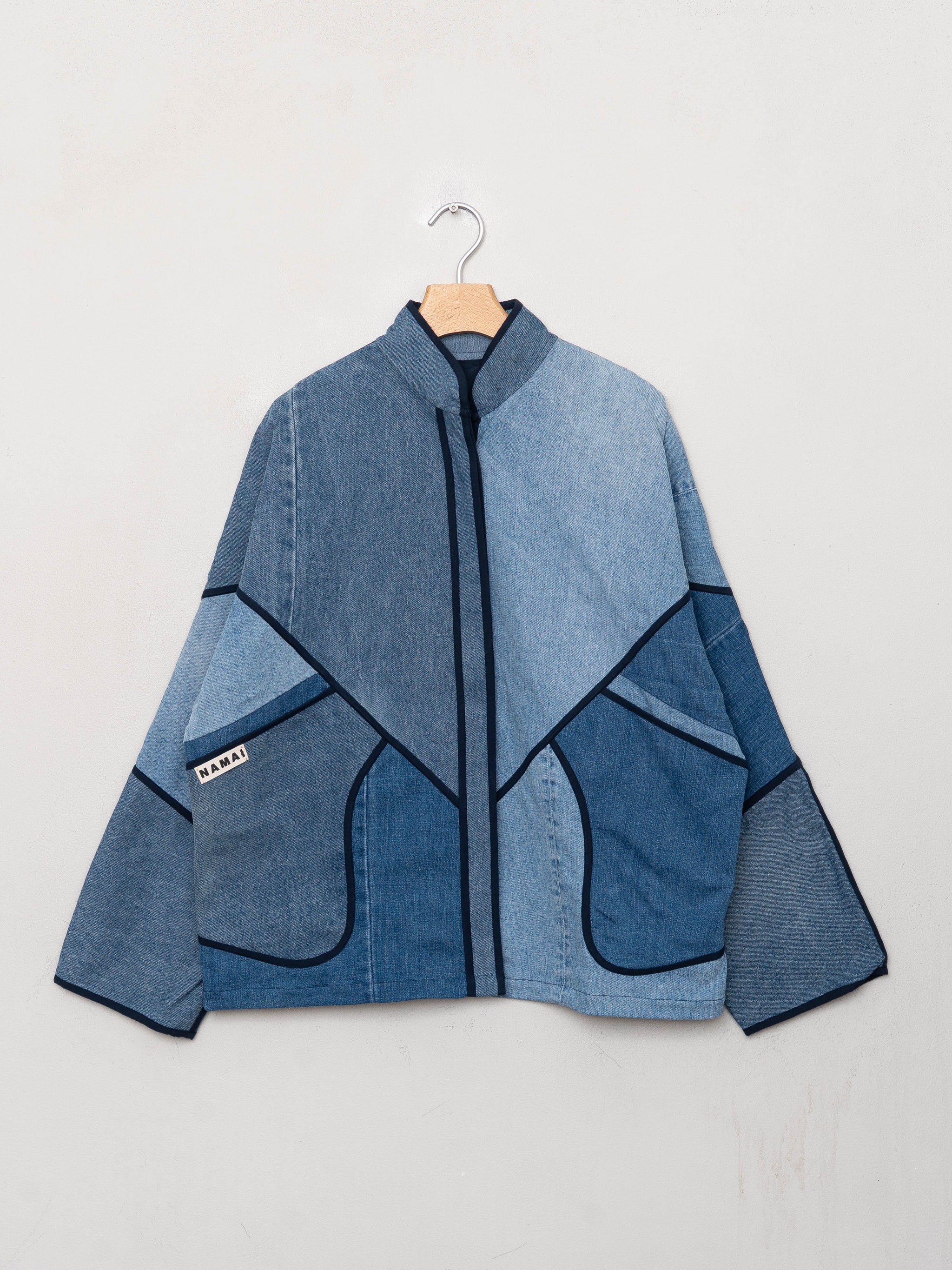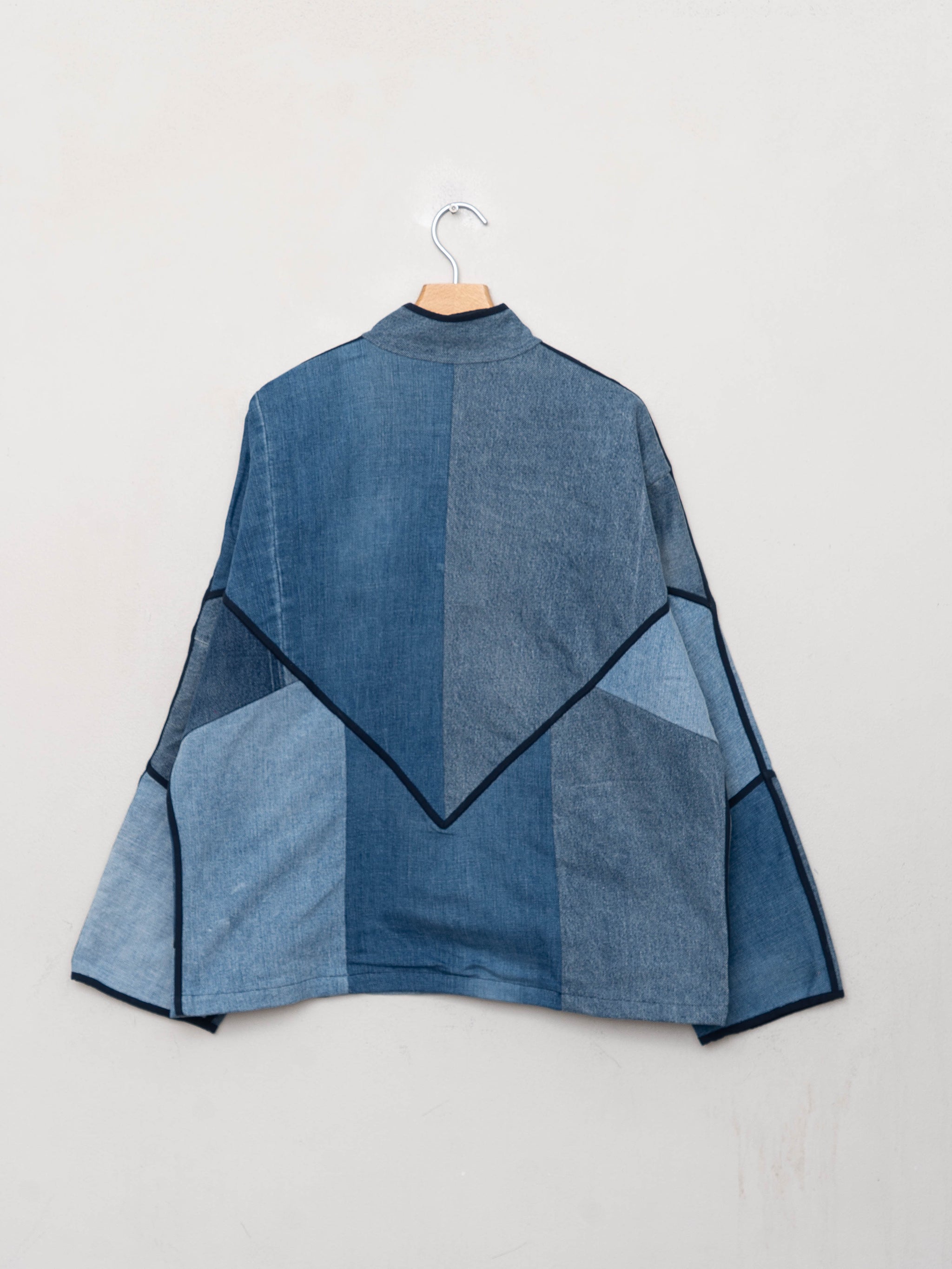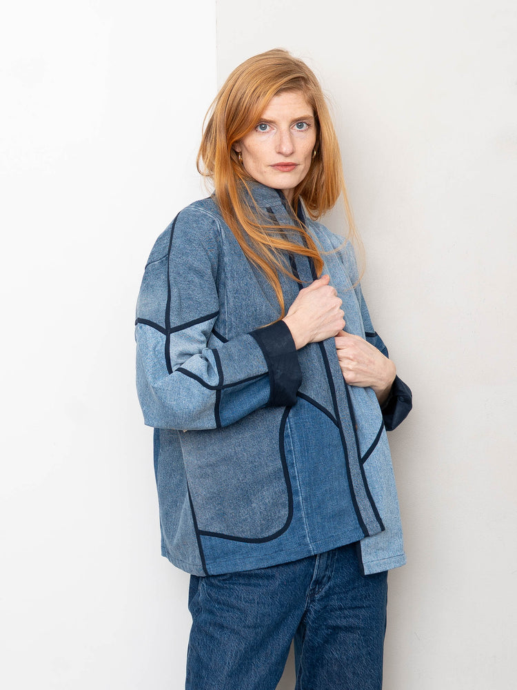 The Ladhiya Denim Jacket has a relaxed fit with a hem that sits just below the hip. It’s available in three sizes and fully lined in soft cotton. Made from upcycled denim jeans, each piece is completely one of a kind—no two are alike. Designed with thoughtful details like rollable sleeves, a mandarin collar, and coconut shell buttons for effortless wear.