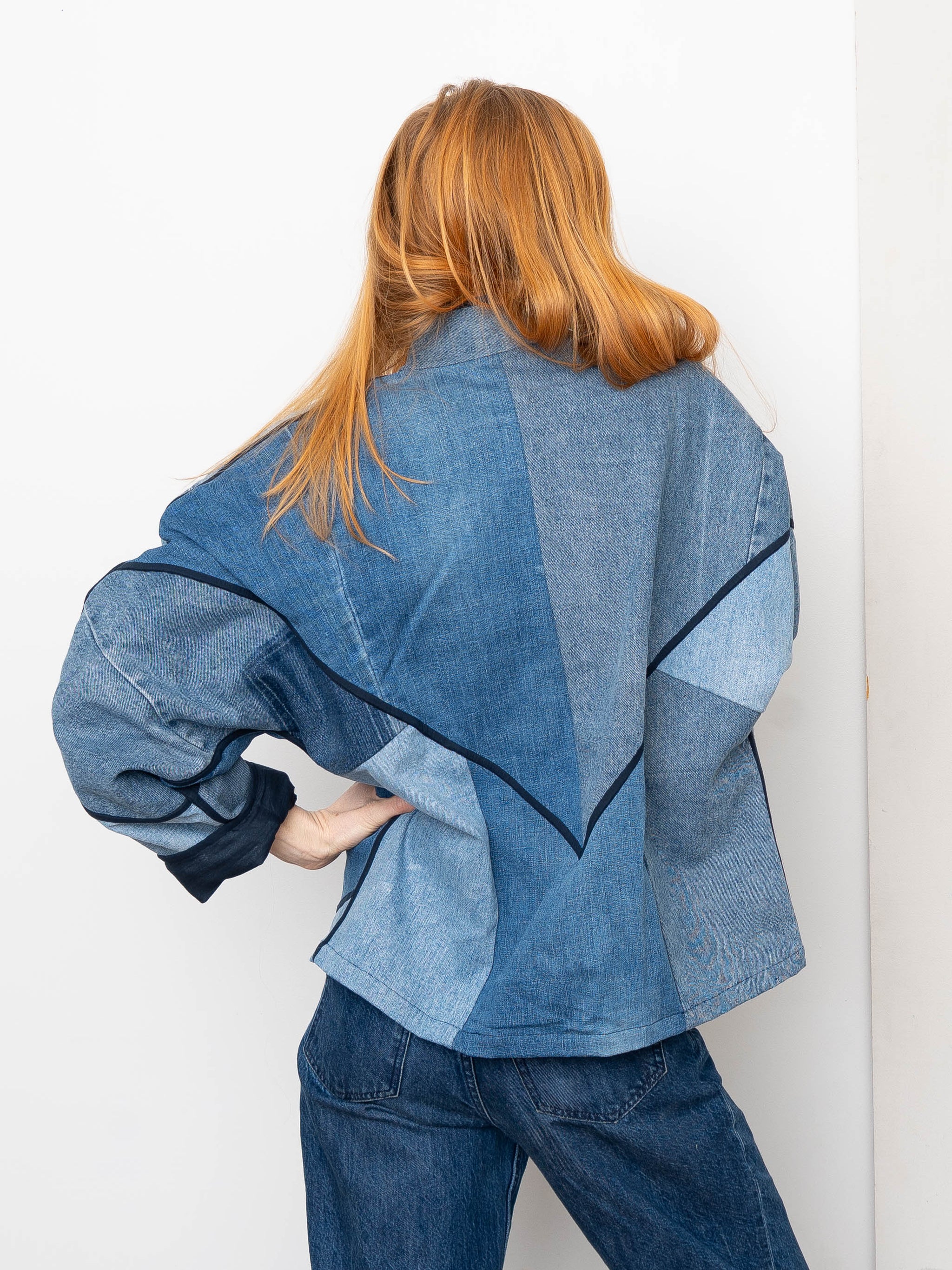 A ONE OF A KIND DENIM JACKET. CRAFTED FROM UPCYCLED JEANS.