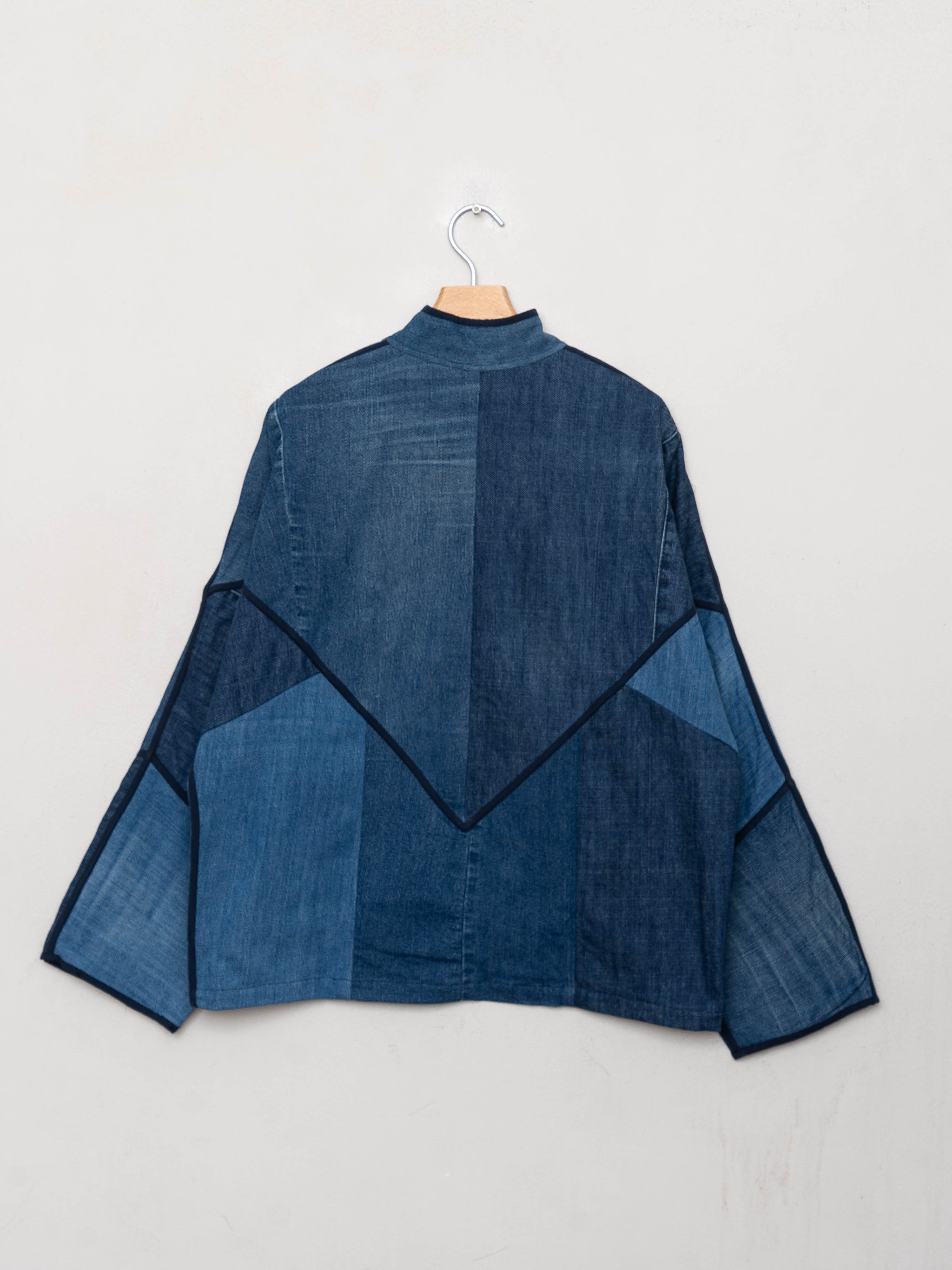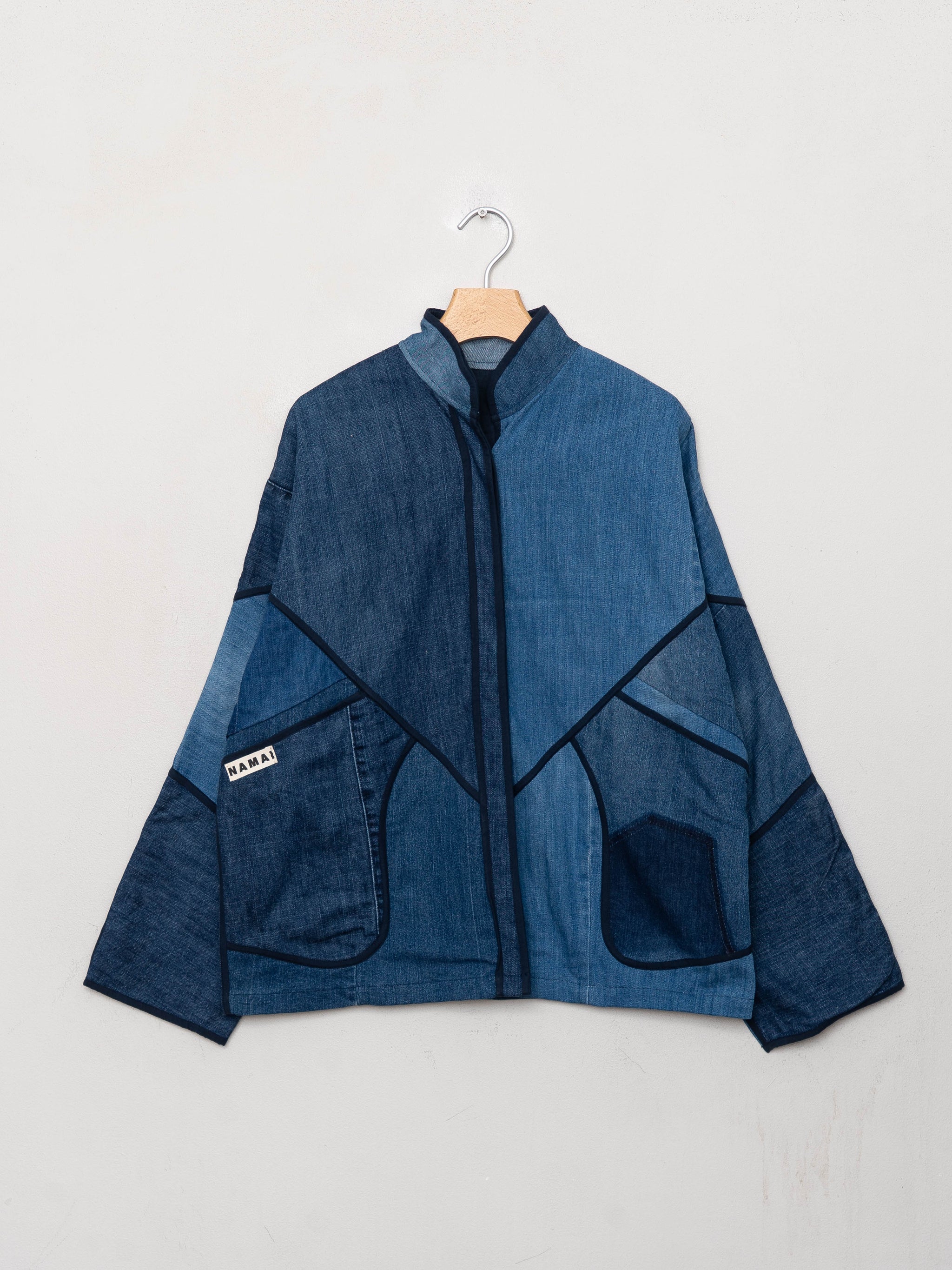 The Ladhiya Denim Jacket has a relaxed fit with a hem that sits just below the hip. It’s available in three sizes and fully lined in soft cotton. Made from upcycled denim jeans, each piece is completely one of a kind—no two are alike. Designed with thoughtful details like rollable sleeves, a mandarin collar, and coconut shell buttons for effortless wear.