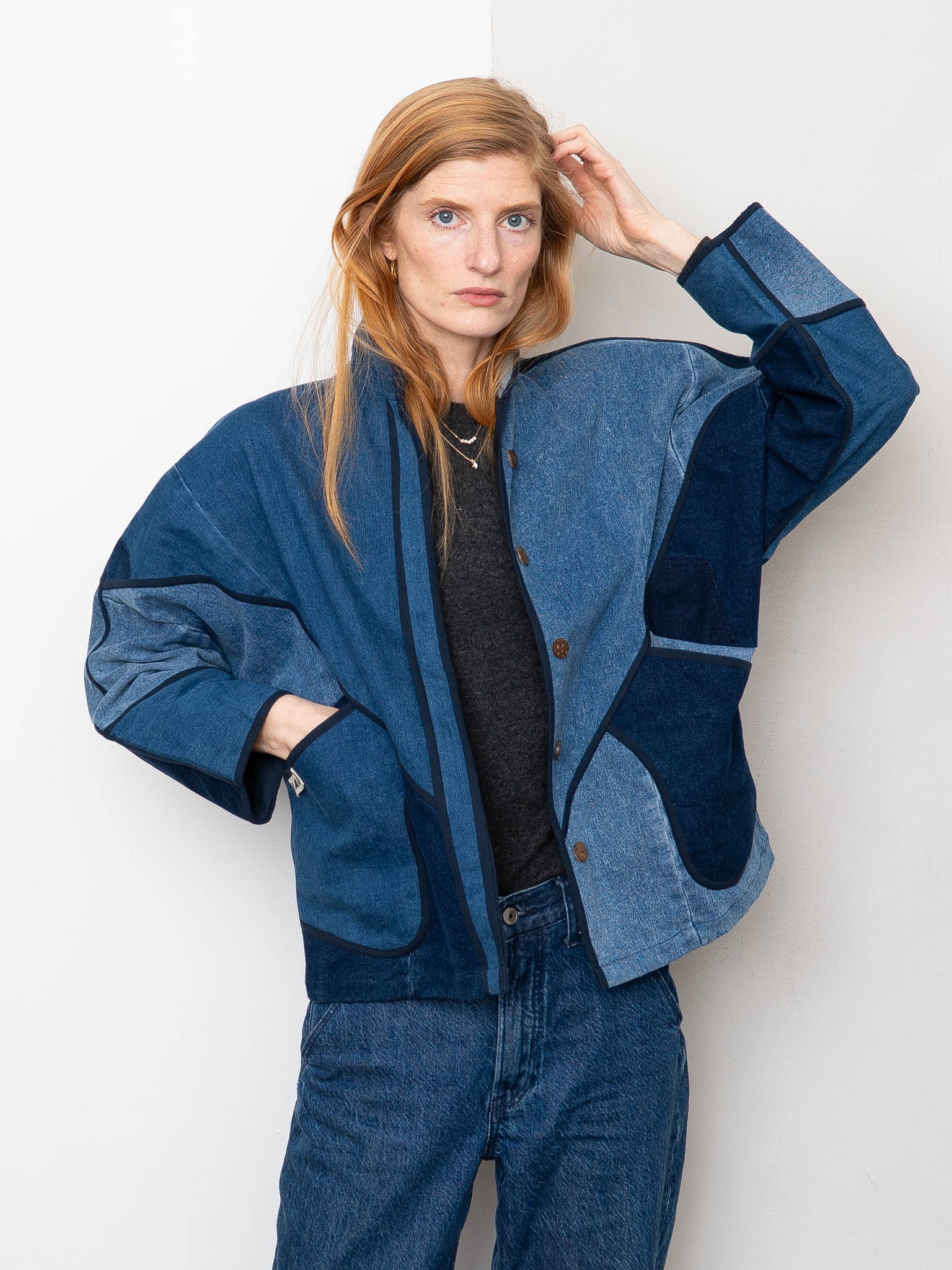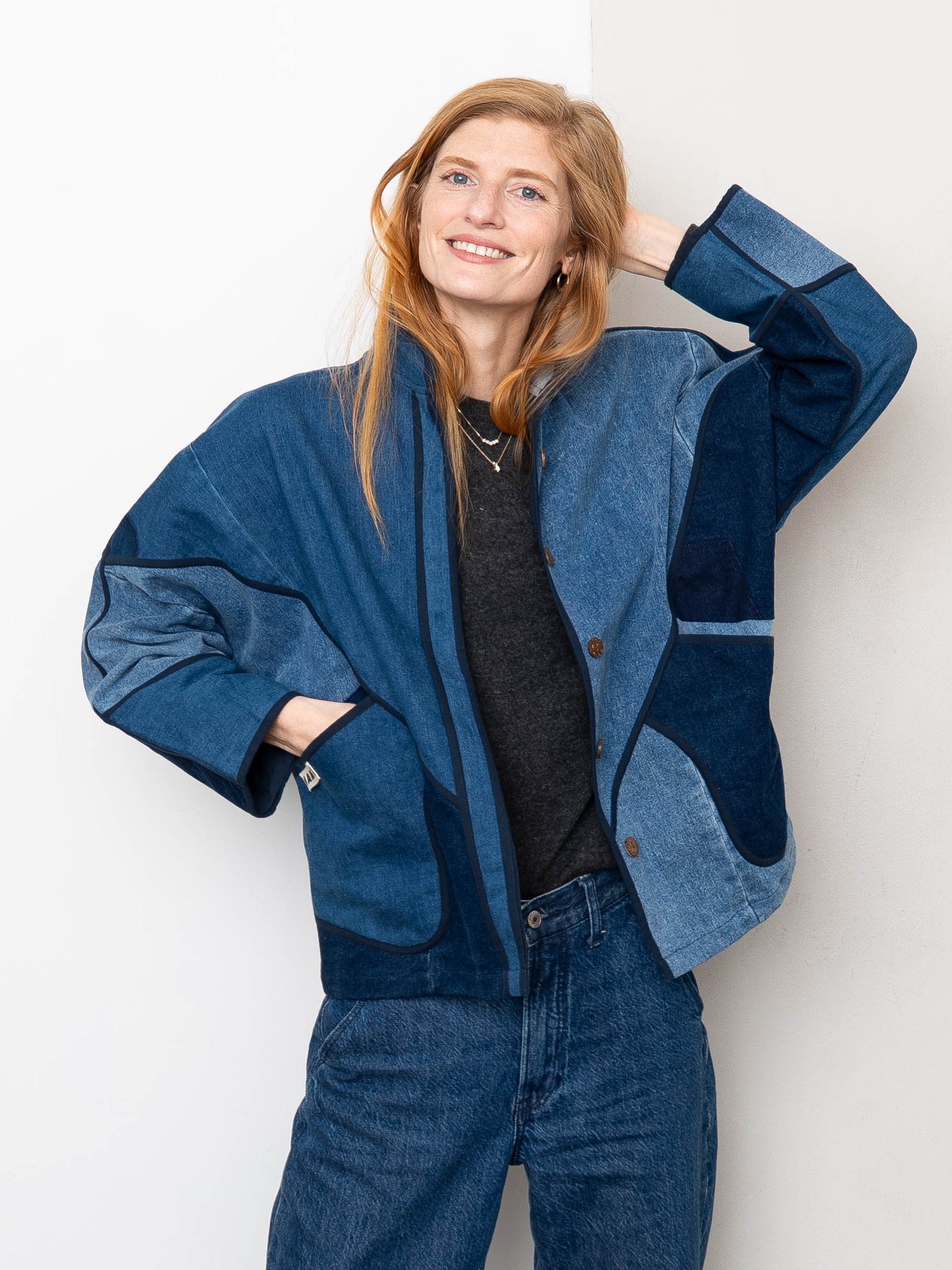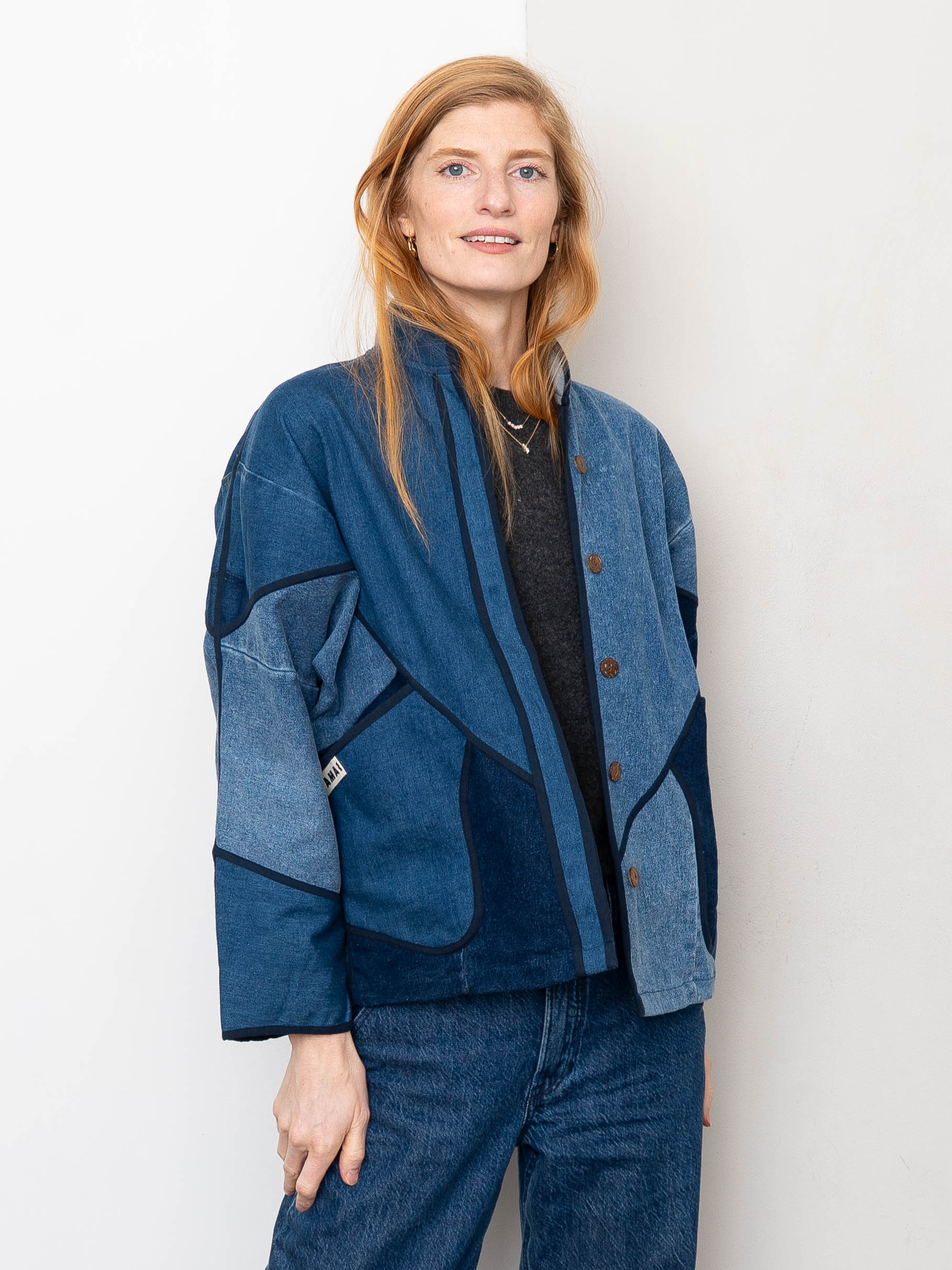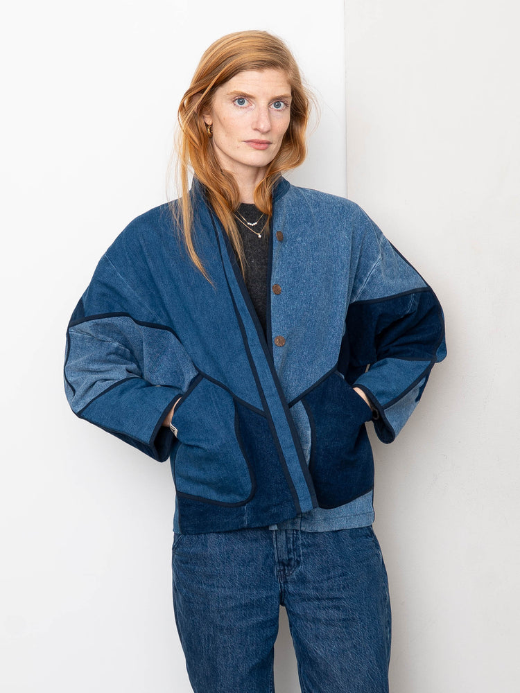 The Ladhiya Denim Jacket has a relaxed fit with a hem that sits just below the hip. It’s available in three sizes and fully lined in soft cotton. Made from upcycled denim jeans, each piece is completely one of a kind—no two are alike. Designed with thoughtful details like rollable sleeves, a mandarin collar, and coconut shell buttons for effortless wear.