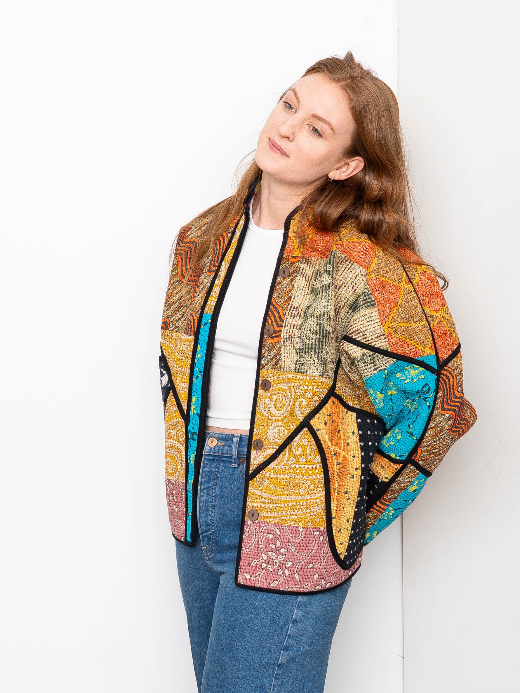 Clean bias binding, rollable sleeves, and coconut shell buttons add everyday practicality, while the one-of-one construction offers individuality you won’t find in mass-produced women’s quilted jackets or printed patchwork jacket styles.