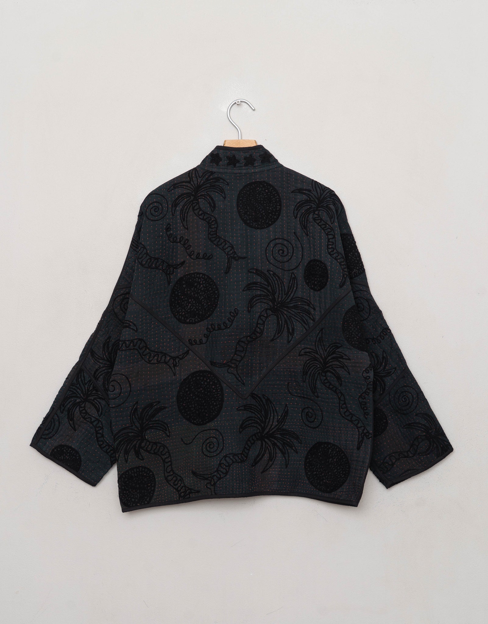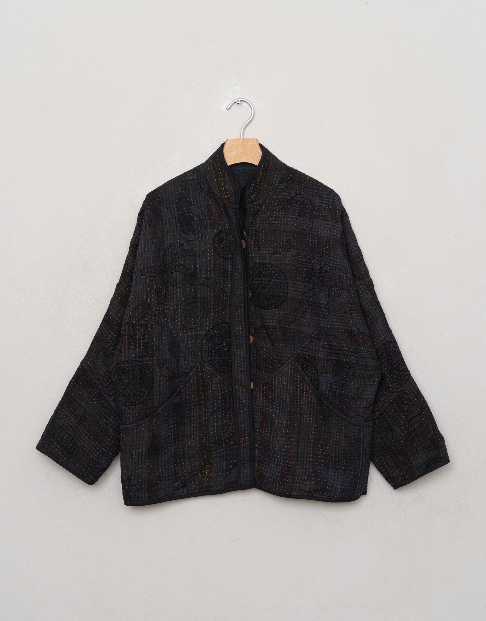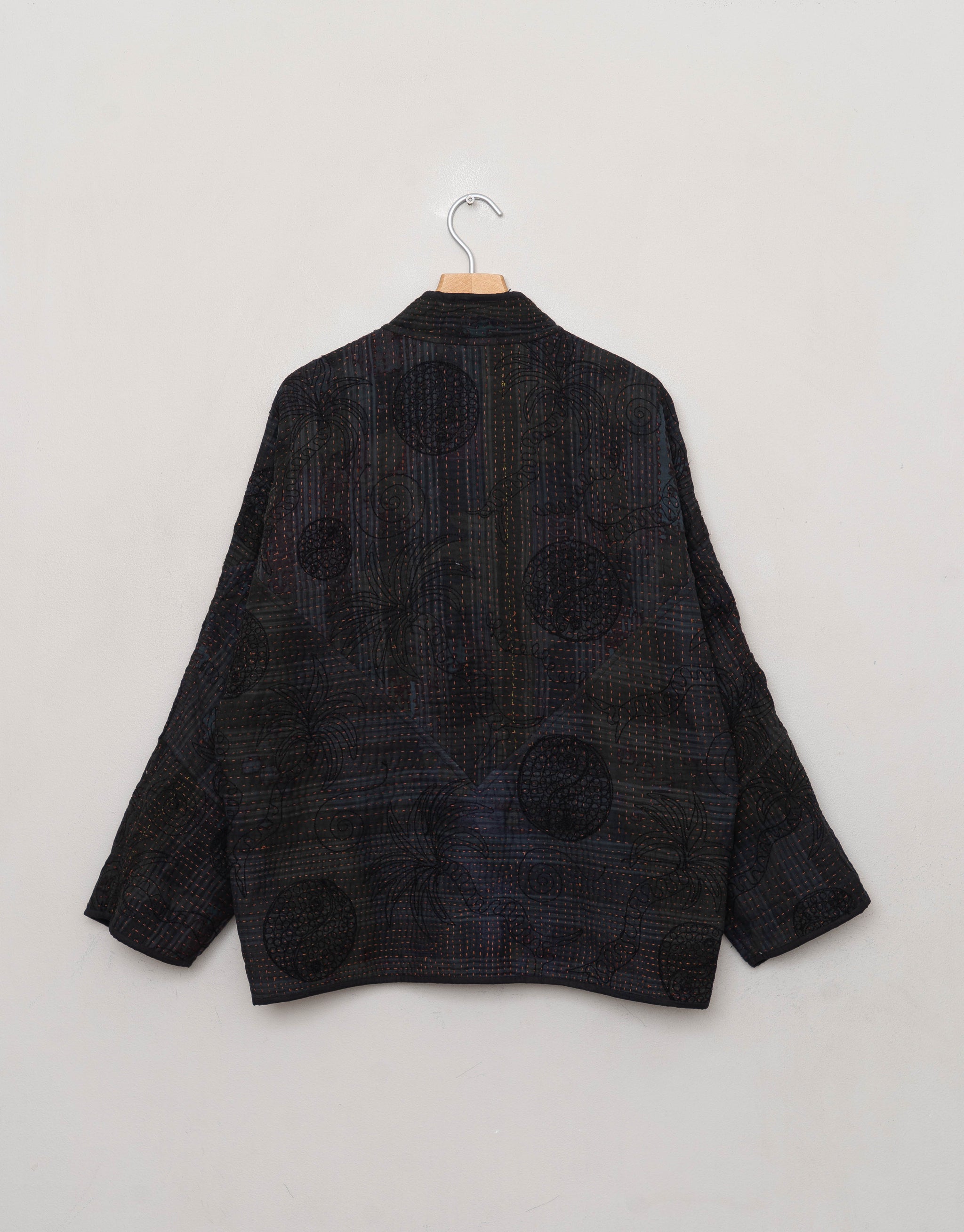 Our Suzani jackets are made from a repurposed Suzani Kantha quilt—vintage cotton stitched with colorful wool embroidery in a flowing chain-stitch style.