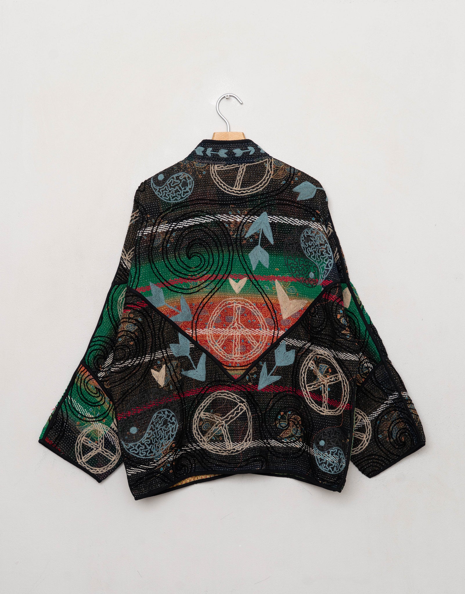 Our Suzani jackets are made from a repurposed Suzani Kantha quilt—vintage cotton stitched with colorful wool embroidery in a flowing chain-stitch style.