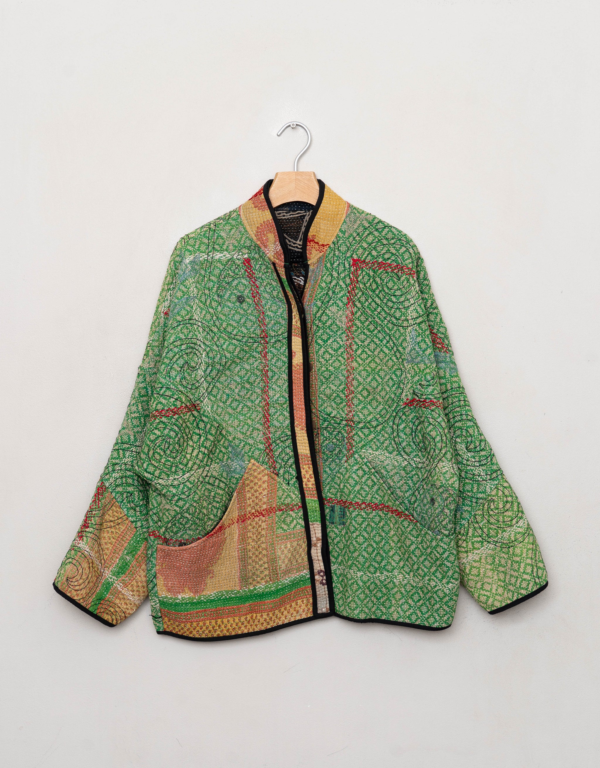 • The Ladhiya Jacket is fully reversible, with finished interiors and functional pockets on both sides — giving you two distinct jackets in one. Each piece is made from a vintage Kantha quilt hand-stitched decades ago, so no two jackets share the same layout, stitching, or color story.