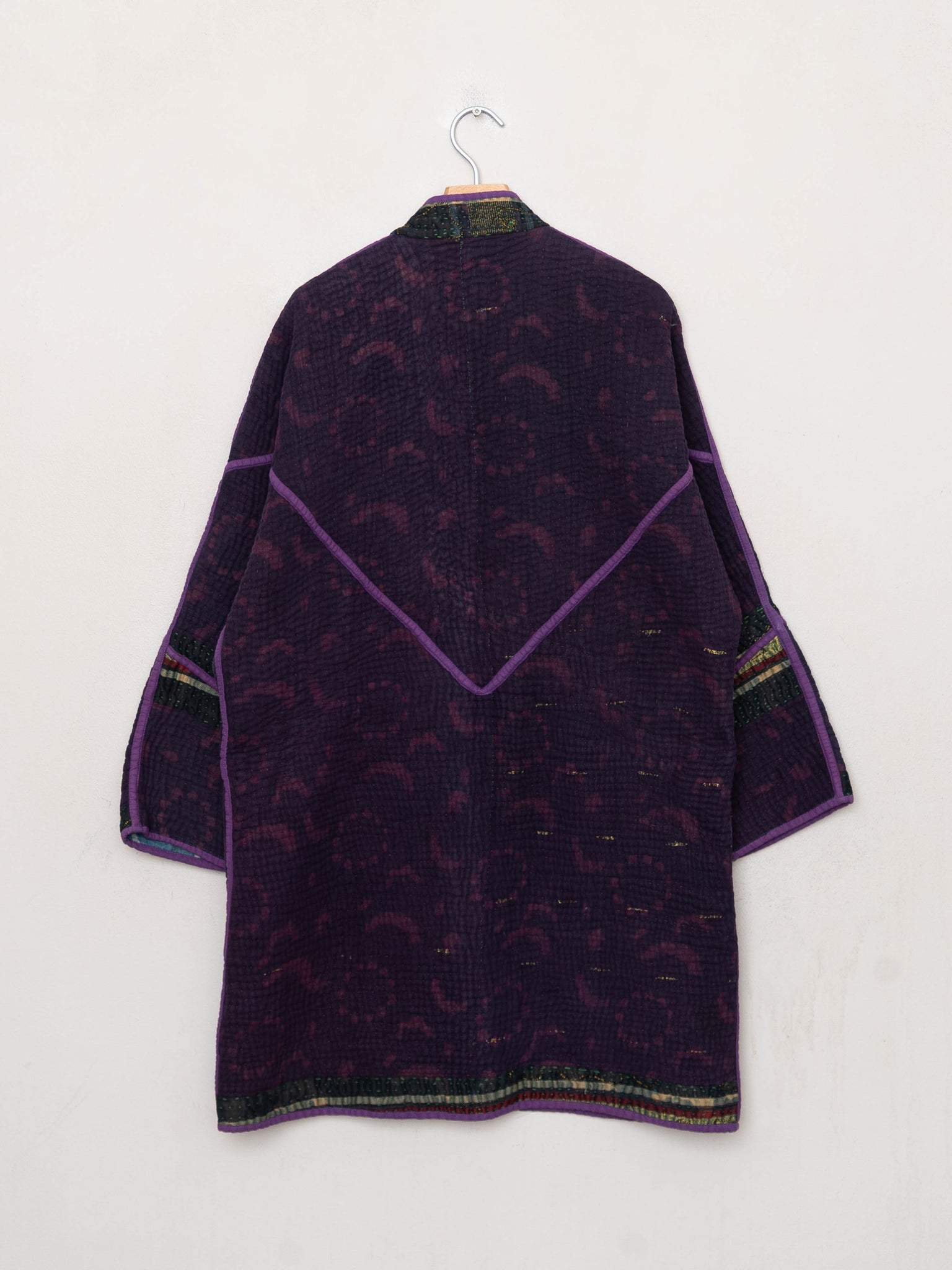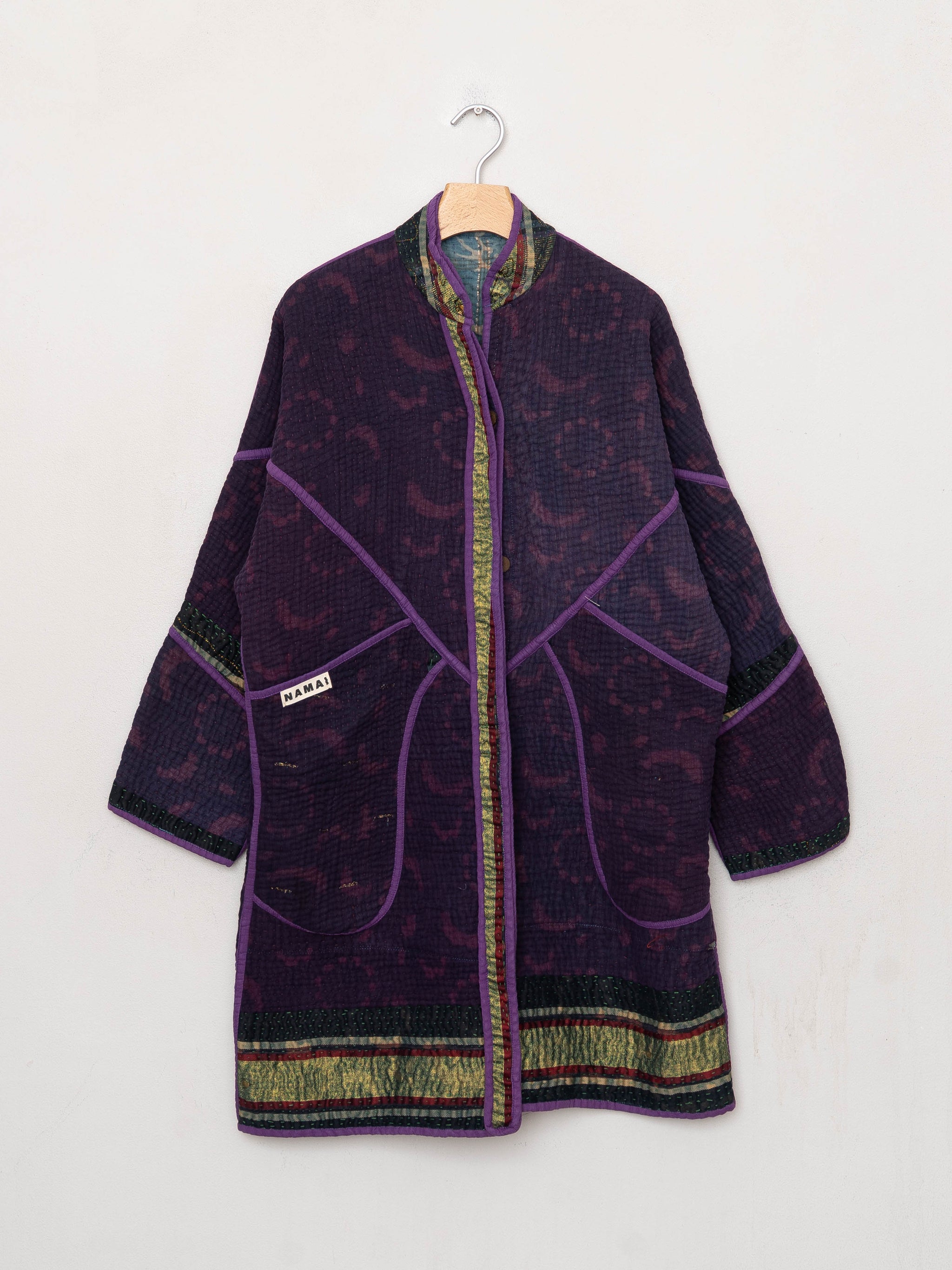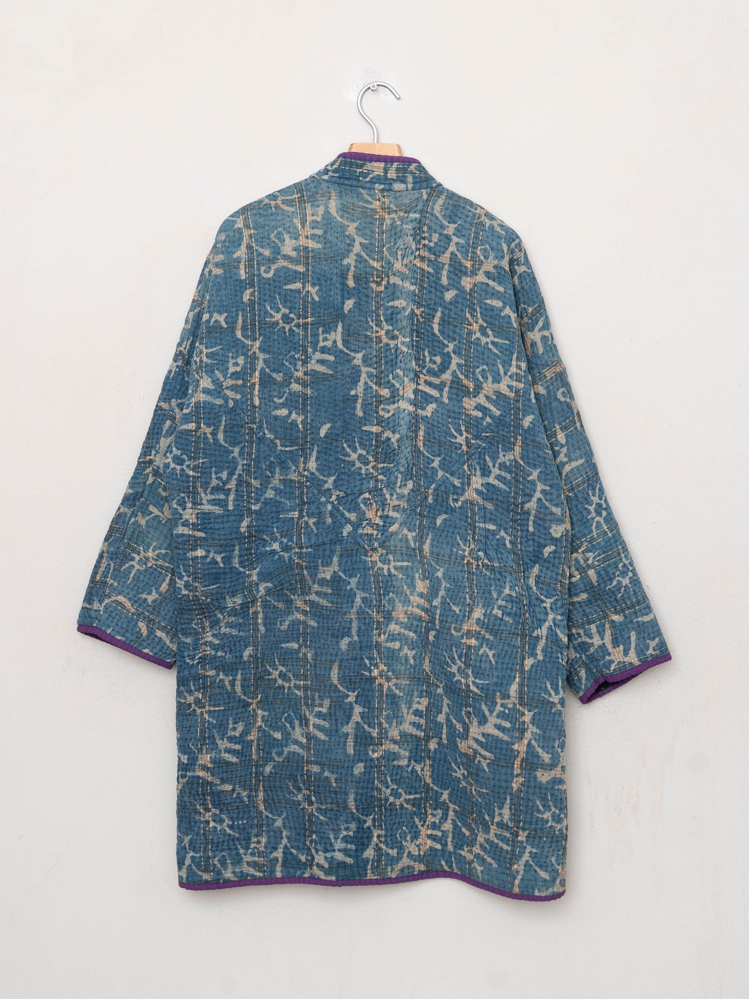 • The Sai Coat is a fully reversible long quilted jacket made from vintage Kantha quilts, finished with a double-sided collar stand, roomy pockets, and clean bias binding along the seams. Its longer silhouette offers a naturally expressive drape without feeling heavy.