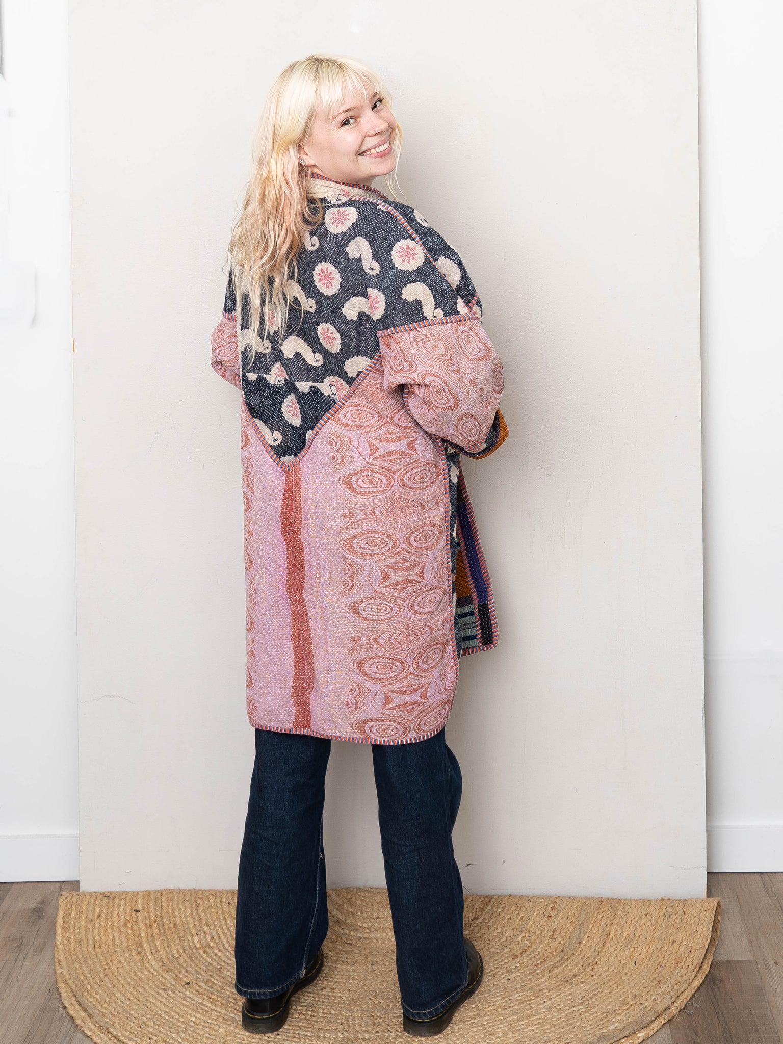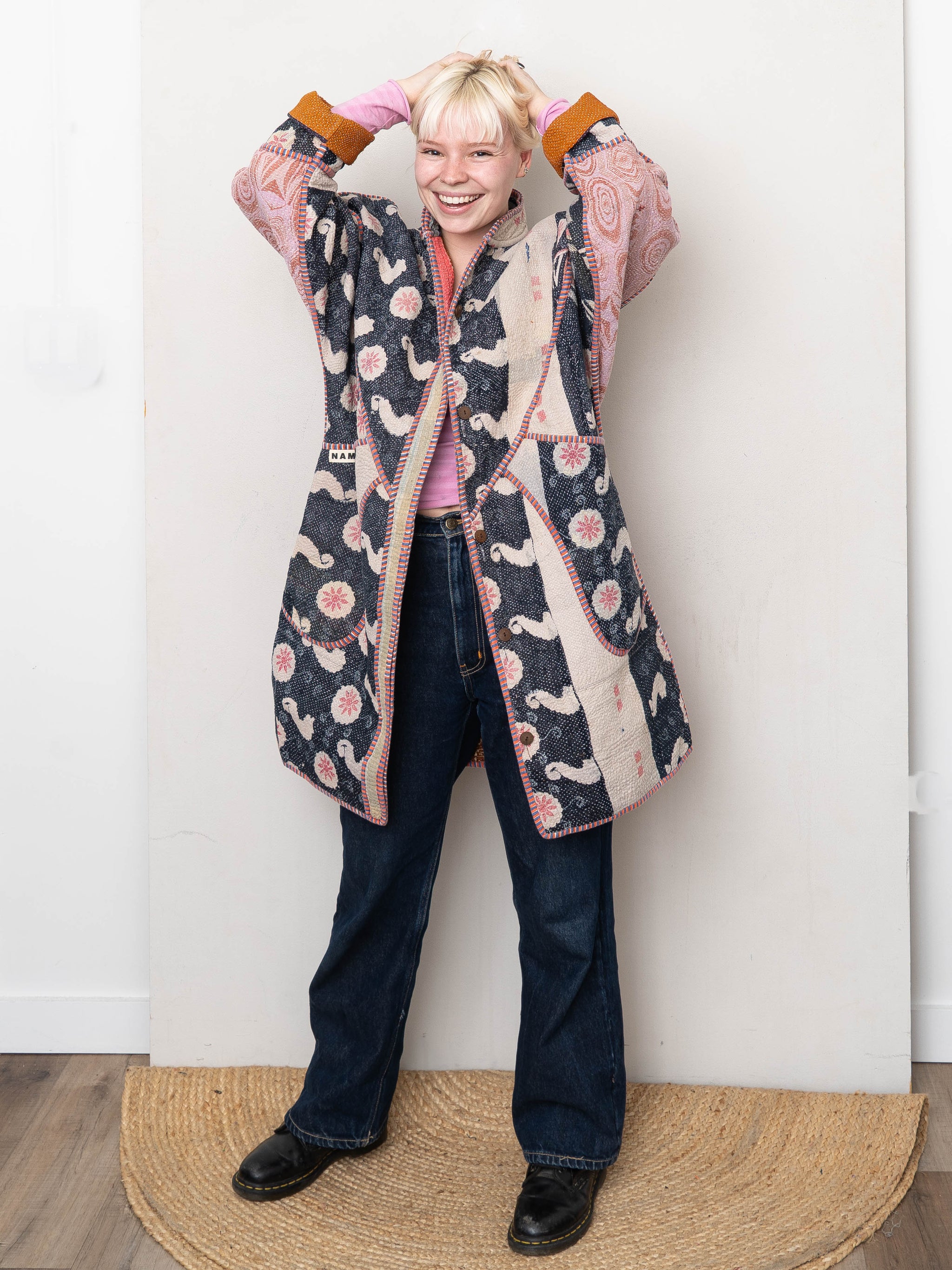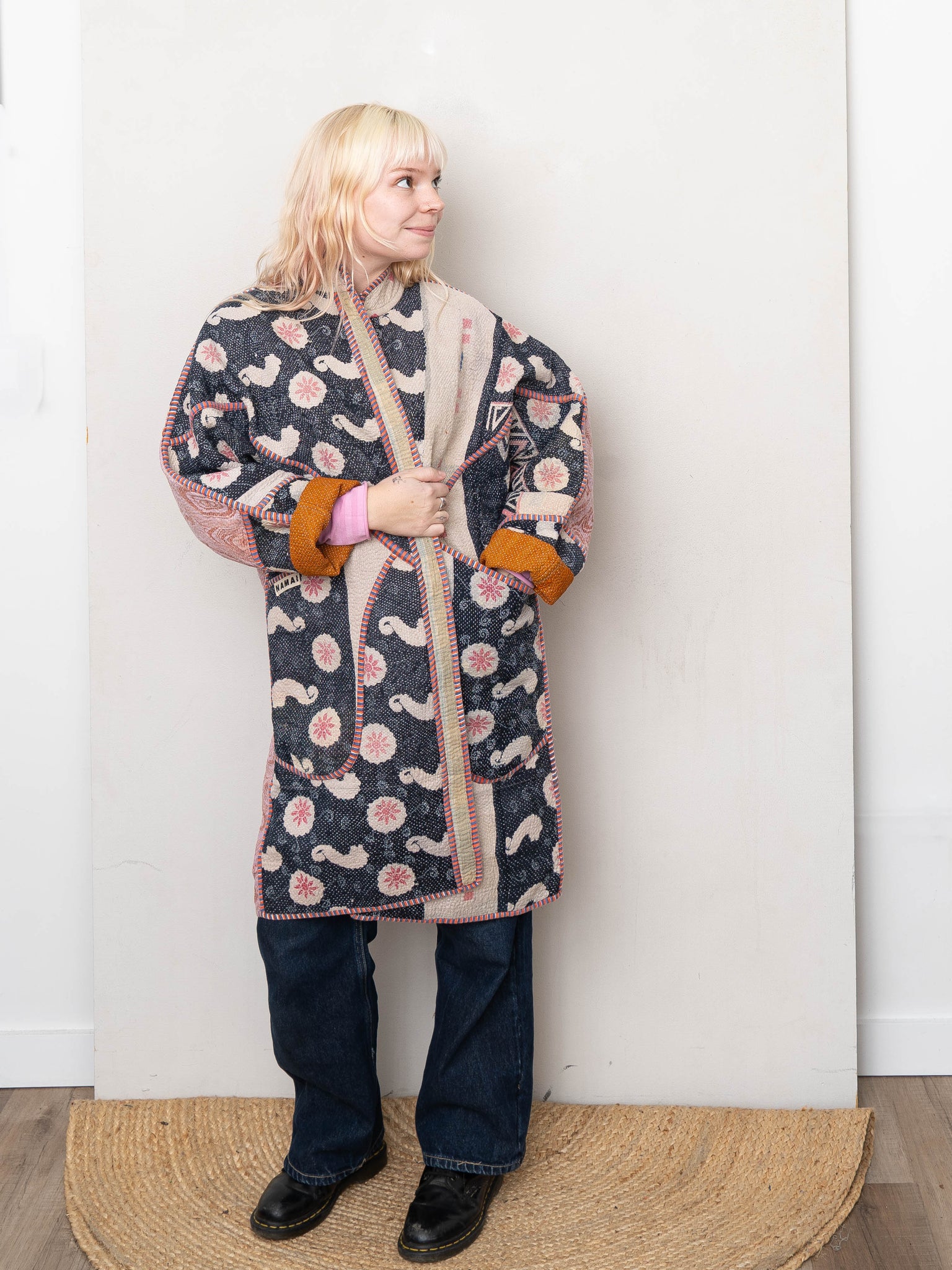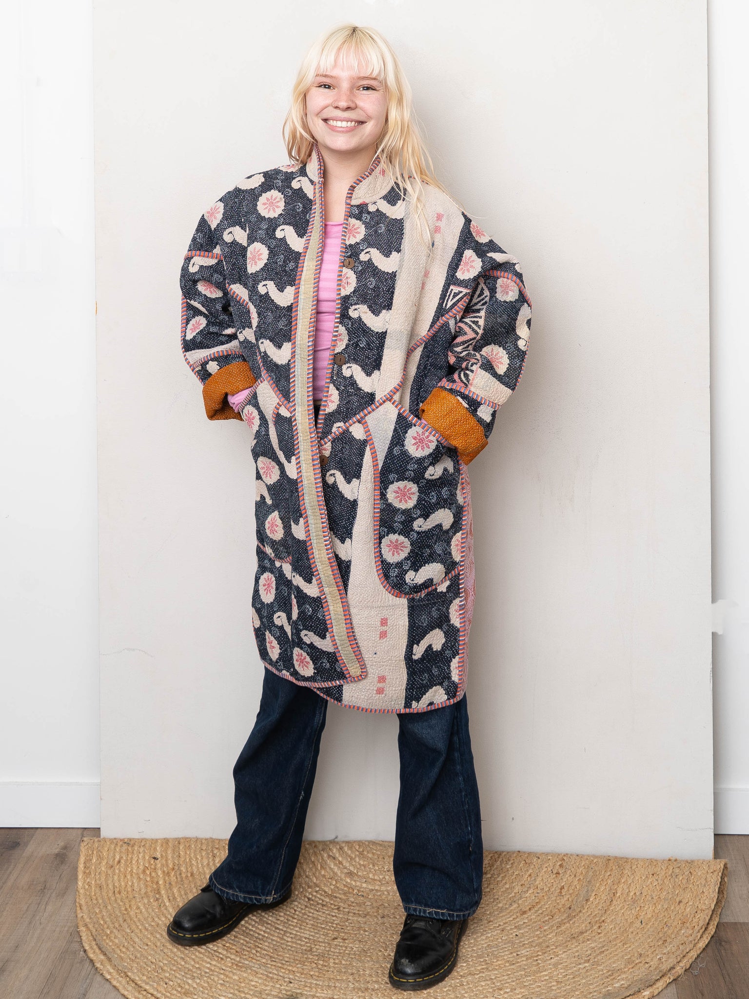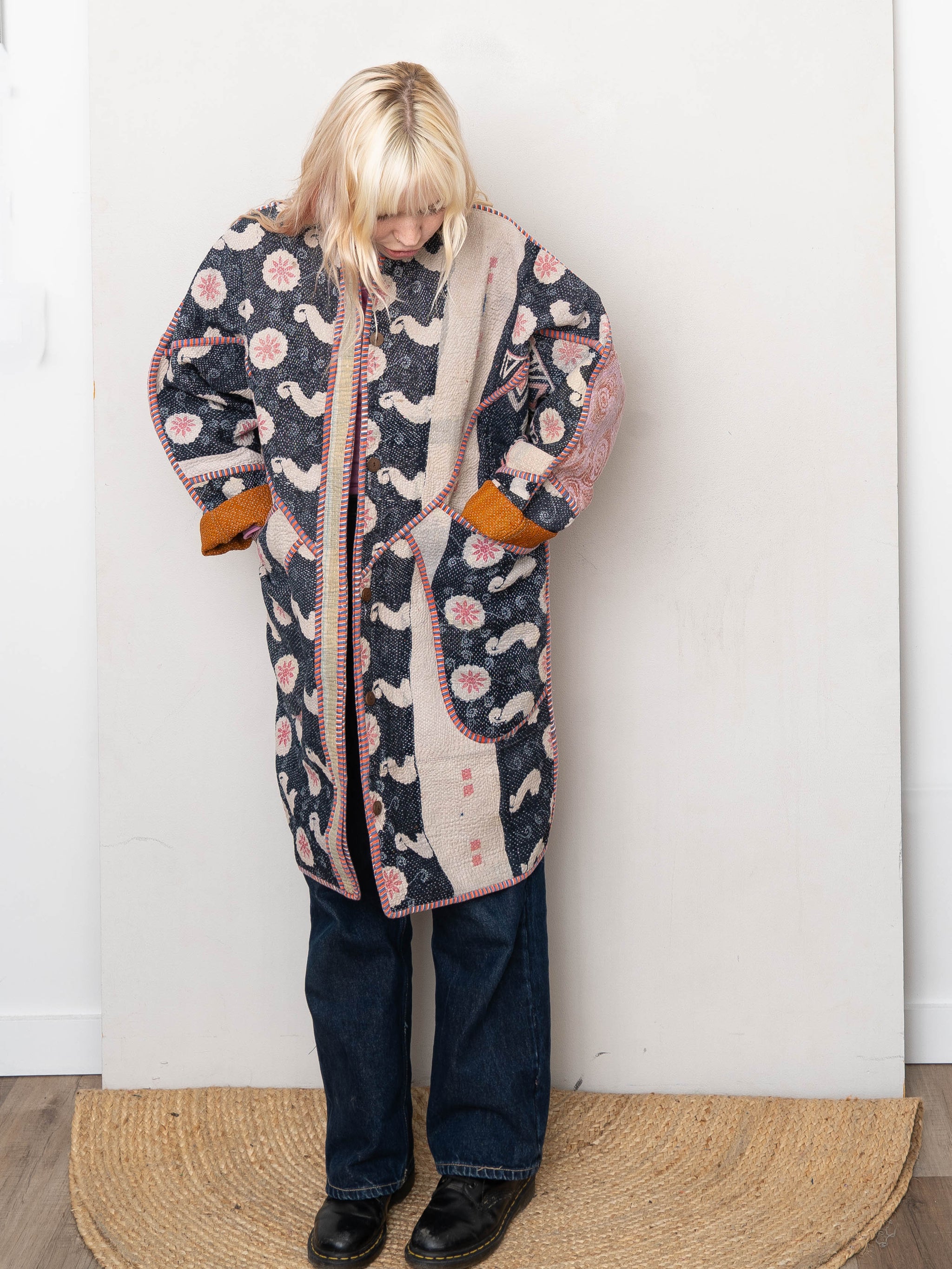 • The Sai Coat is a fully reversible long quilted jacket made from vintage Kantha quilts, finished with a double-sided collar stand, roomy pockets, and clean bias binding along the seams. Its longer silhouette offers a naturally expressive drape without feeling heavy.