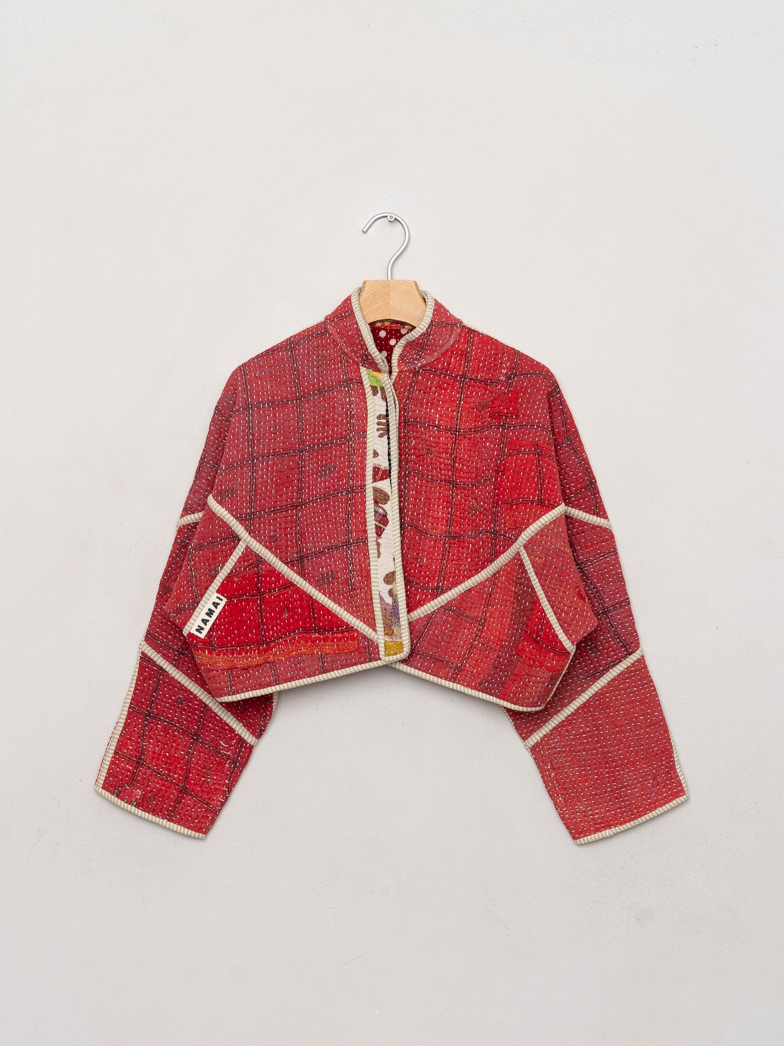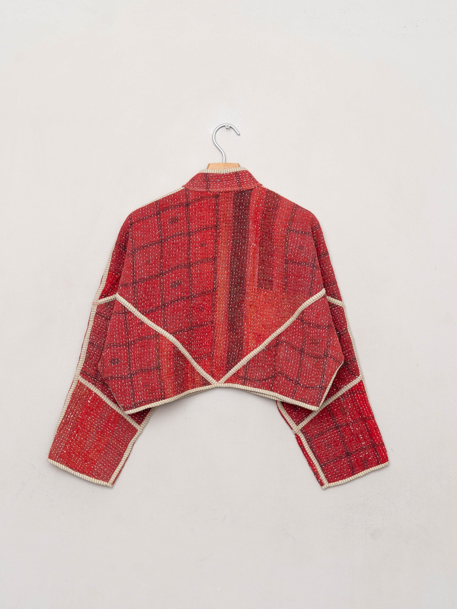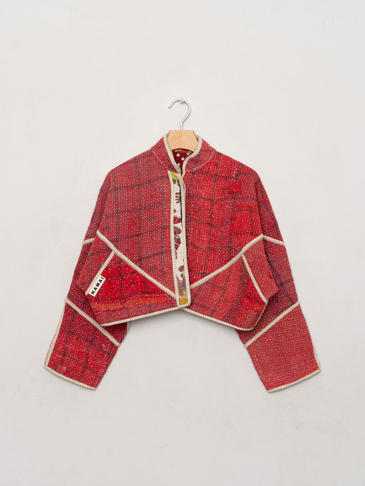 • The Kaira Jacket is a fully reversible cropped quilted jacket made from vintage Kantha quilts, each with its own stitching, layout, and patina (signs of age). Its boxy silhouette, mandarin collar, and rollable sleeves create a clean, modern shape that stands apart from mass-market cropped jacket styles.