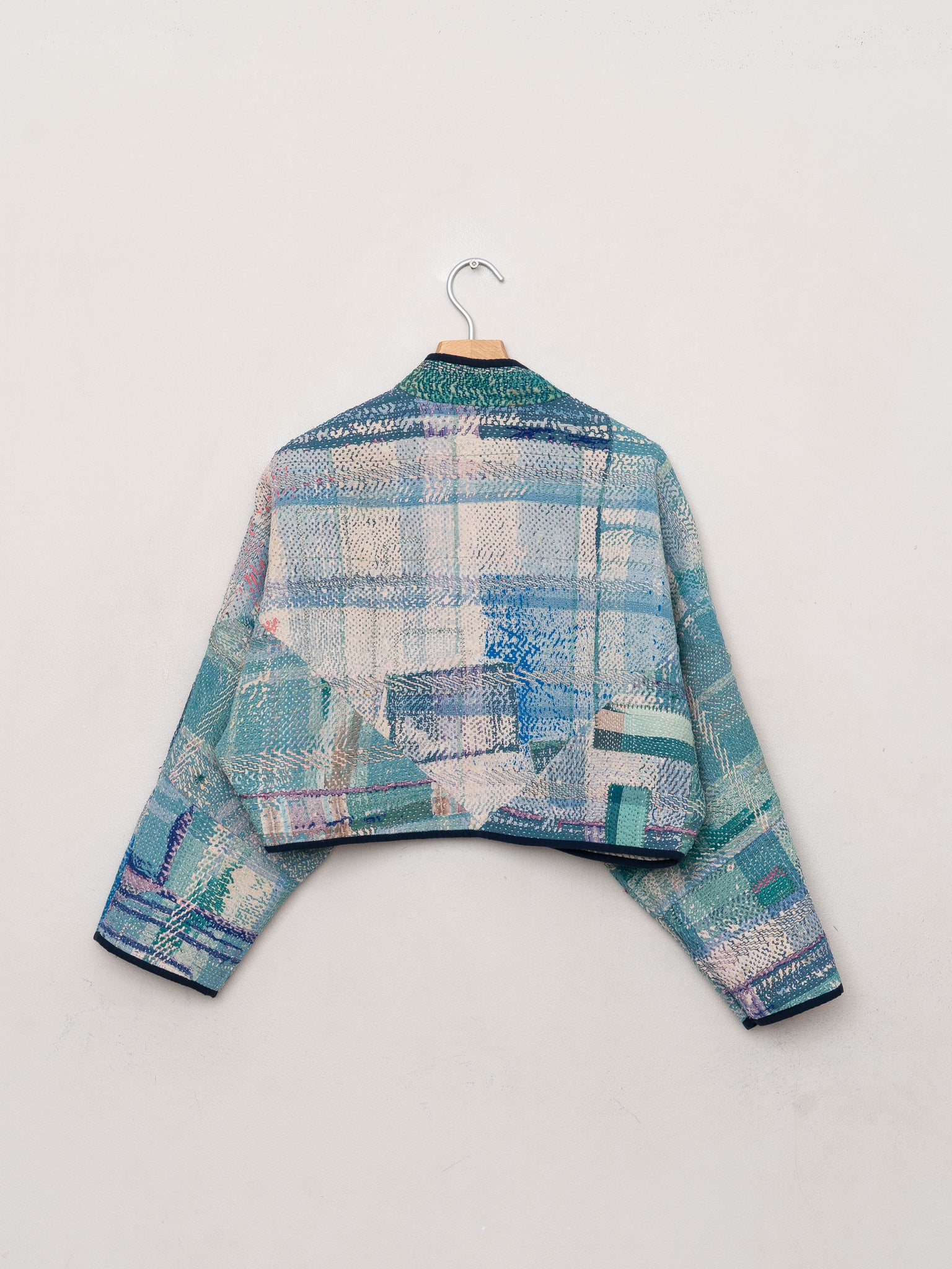 • The Kaira Jacket is a fully reversible cropped quilted jacket made from vintage Kantha quilts, each with its own stitching, layout, and patina (signs of age). Its boxy silhouette, mandarin collar, and rollable sleeves create a clean, modern shape that stands apart from mass-market cropped jacket styles.