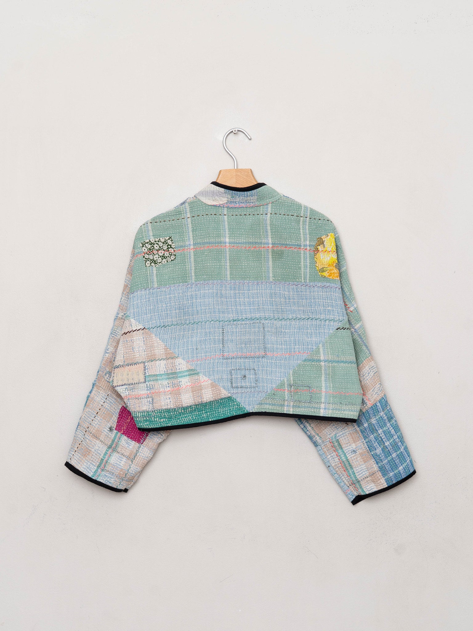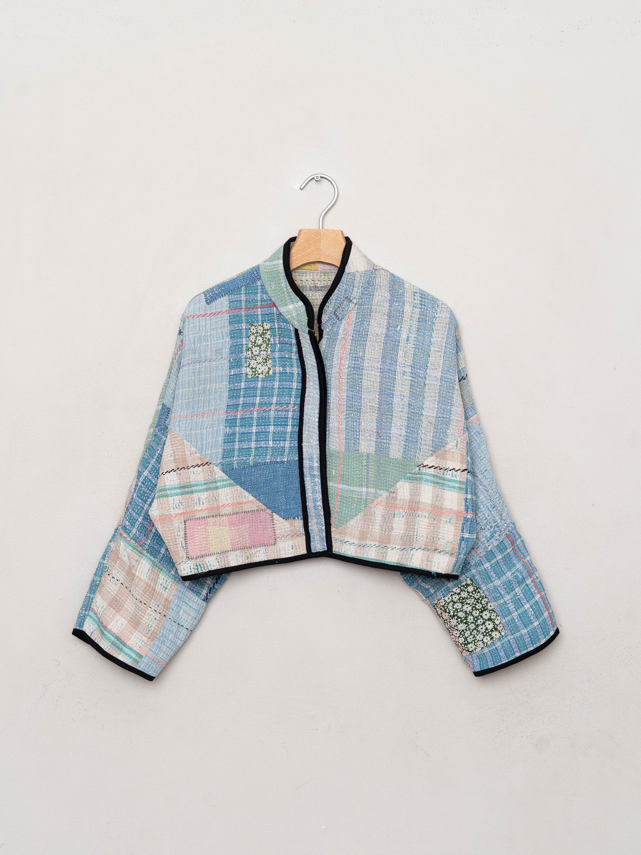 • The Kaira Jacket is a fully reversible cropped quilted jacket made from vintage Kantha quilts, each with its own stitching, layout, and patina (signs of age). Its boxy silhouette, mandarin collar, and rollable sleeves create a clean, modern shape that stands apart from mass-market cropped jacket styles.