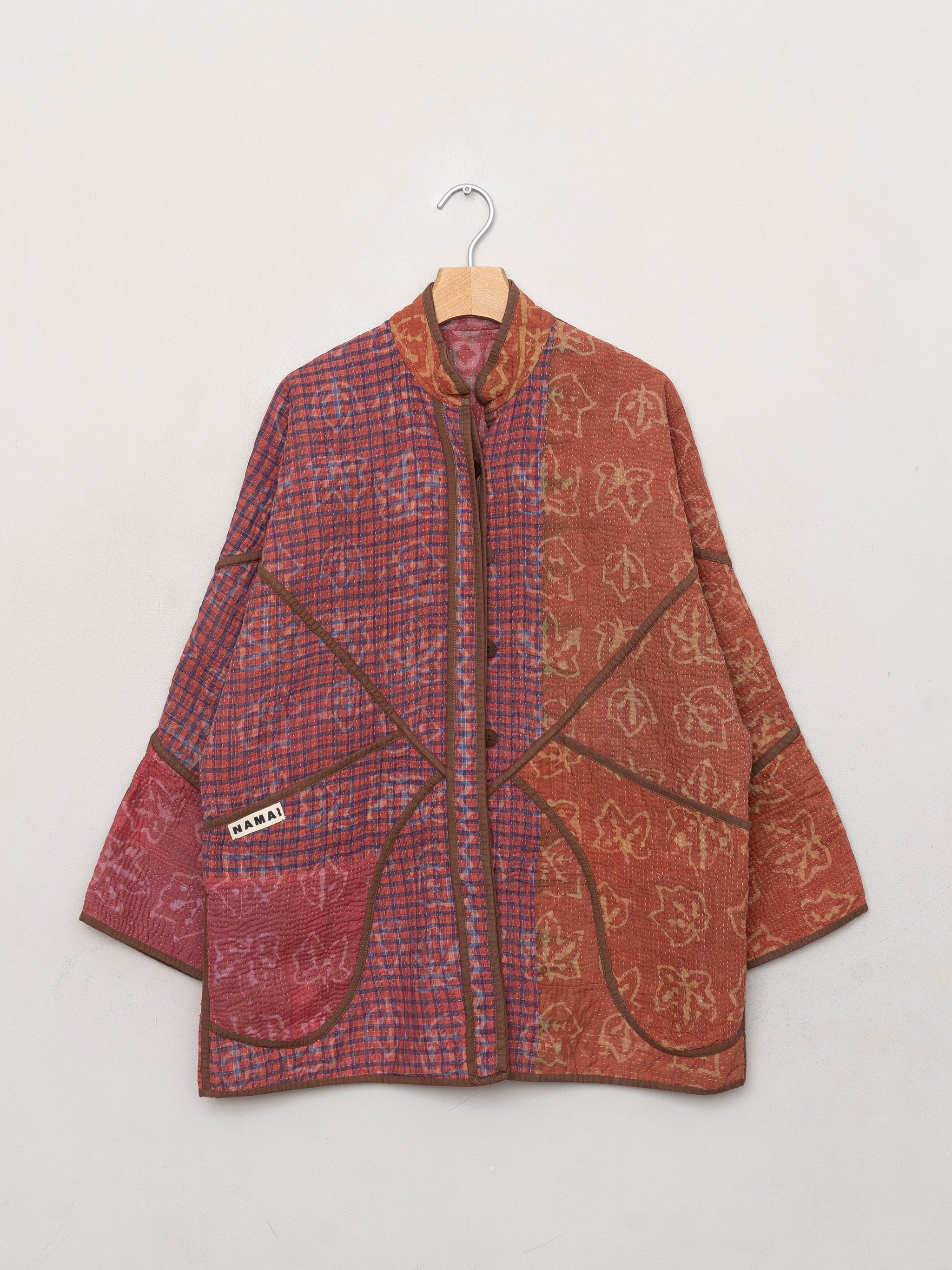 The Narmada Jacket is a relaxed, thigh-length style with an easy, oversized fit and generous patch pockets on both sides. Fully reversible and made from vintage Kantha quilts, each piece is completely one of a kind—no two are alike. Designed with thoughtful details like rollable sleeves, a mandarin collar, and coconut shell buttons on both sides for effortless wear.