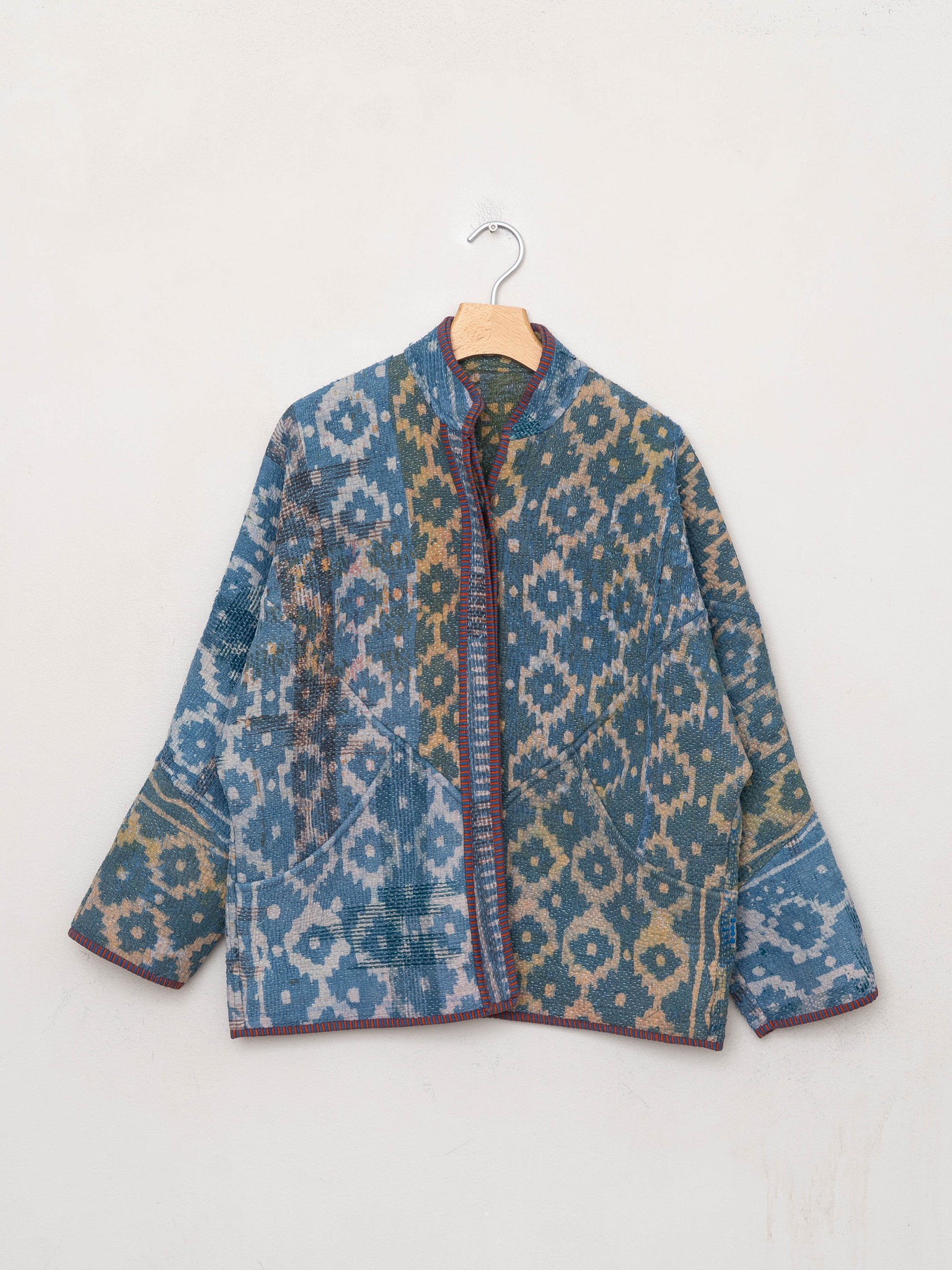 This Jacket features mud resist motifs dyed with plant based dyes over the Vintage Kantha textiles.