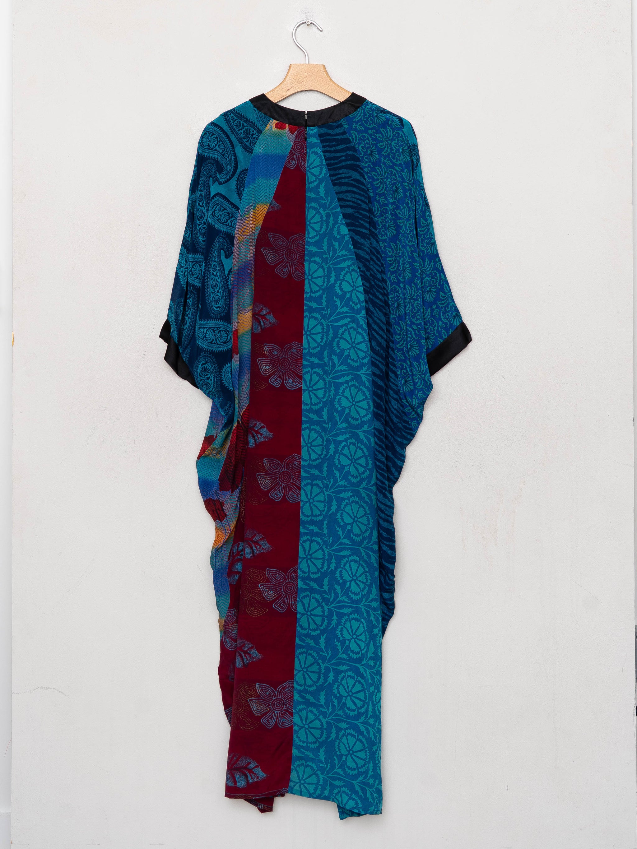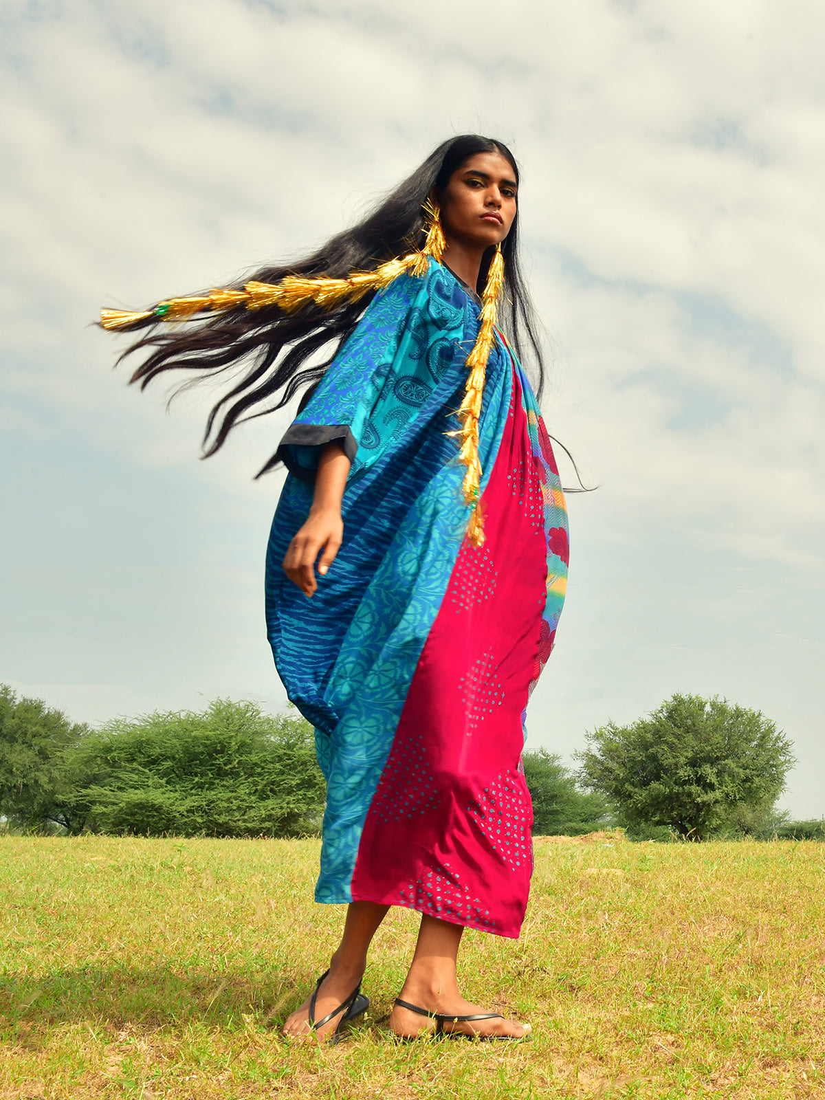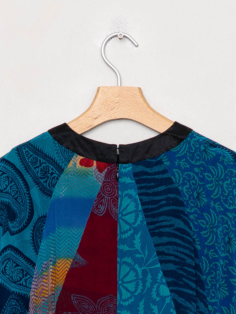The Simmy Dress is a loose, flowy silhouette crafted from recycled silk saris—each hand-selected and thoughtfully pieced together from up to six different prints. Designed with an asymmetric gathered detail and invisible back zipper, every top is one-of-a-kind and never repeated. Easy to wear, easy to tailor, and made to celebrate pattern and play.