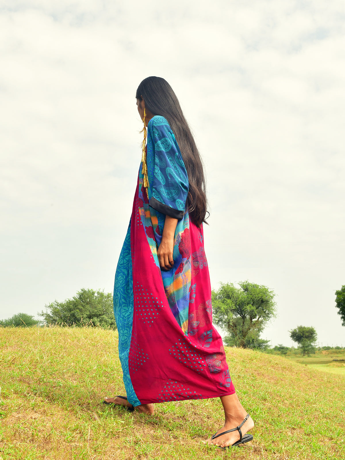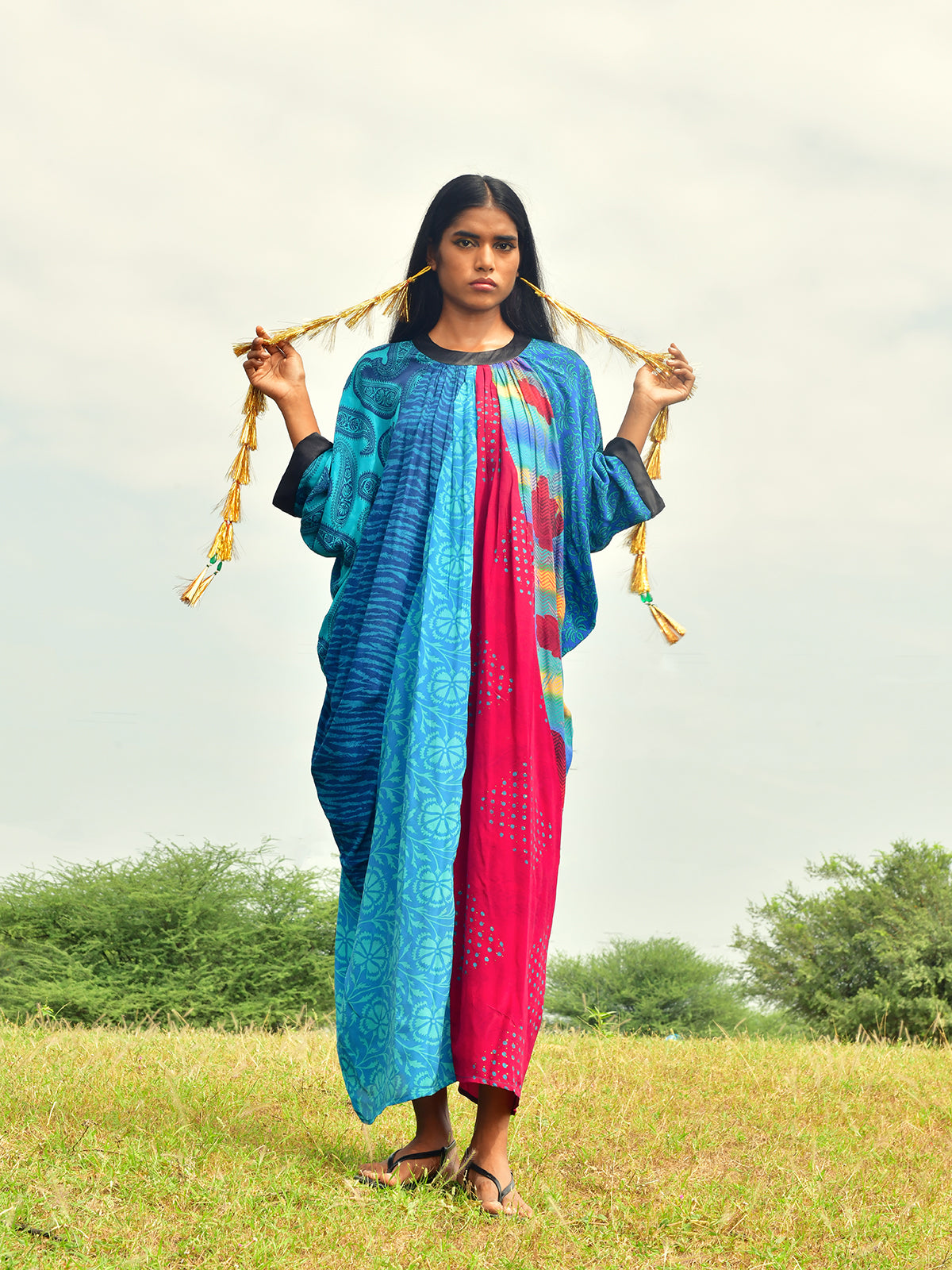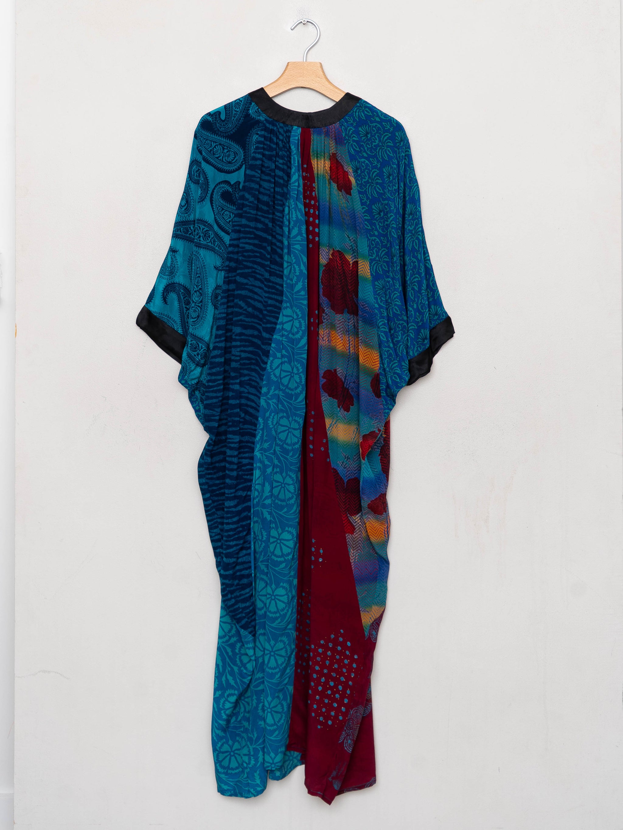 The Simmy Dress is a loose, flowy silhouette crafted from recycled silk saris—each hand-selected and thoughtfully pieced together from up to six different prints. Designed with an asymmetric gathered detail and invisible back zipper, every top is one-of-a-kind and never repeated. Easy to wear, easy to tailor, and made to celebrate pattern and play.