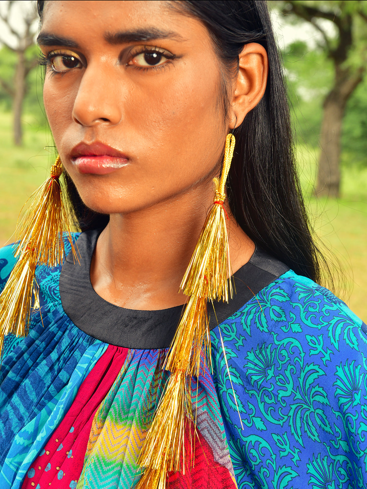 We take recycled silk saris, and sort them into combinations of vibrant colors and prints. Then we create something new out of them. We're proud to be able to extend the beauty and lifecycle of this precious resource.