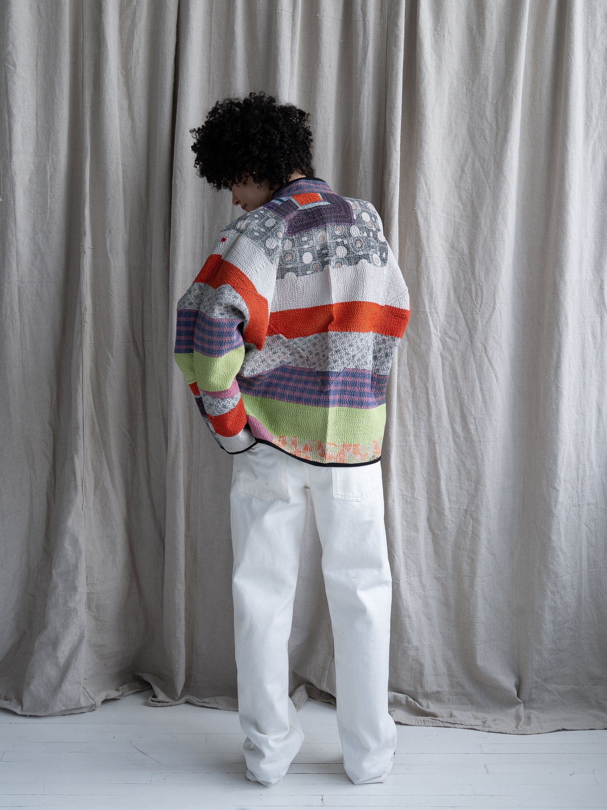 Because the quilts are vintage, gentle signs of age — like fading, small repairs, or texture variations — are expected and part of the textile’s character. Namai also offers lifetime repairs to help keep your jacket in long-term rotation.
