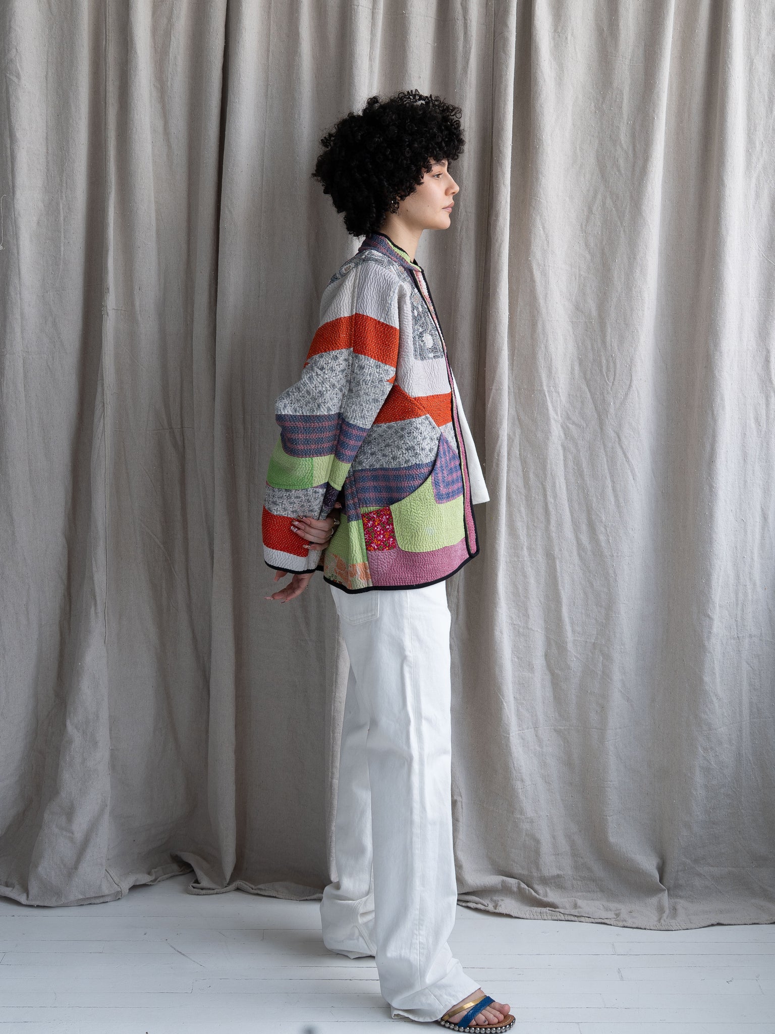 Clean bias binding, rollable sleeves, and coconut shell buttons add everyday practicality, while the one-of-one construction offers individuality you won’t find in mass-produced women’s quilted jackets or printed patchwork jacket styles.
