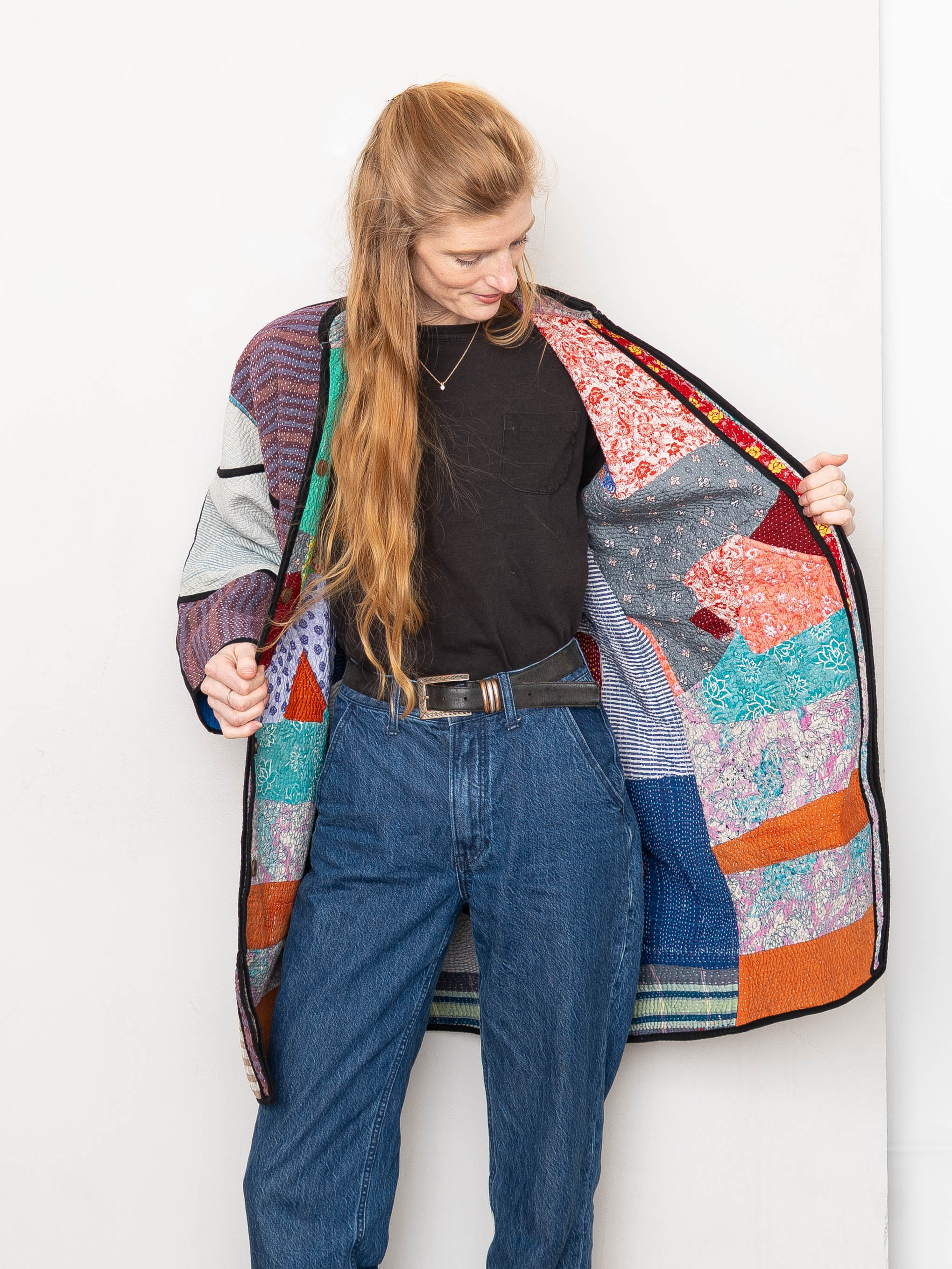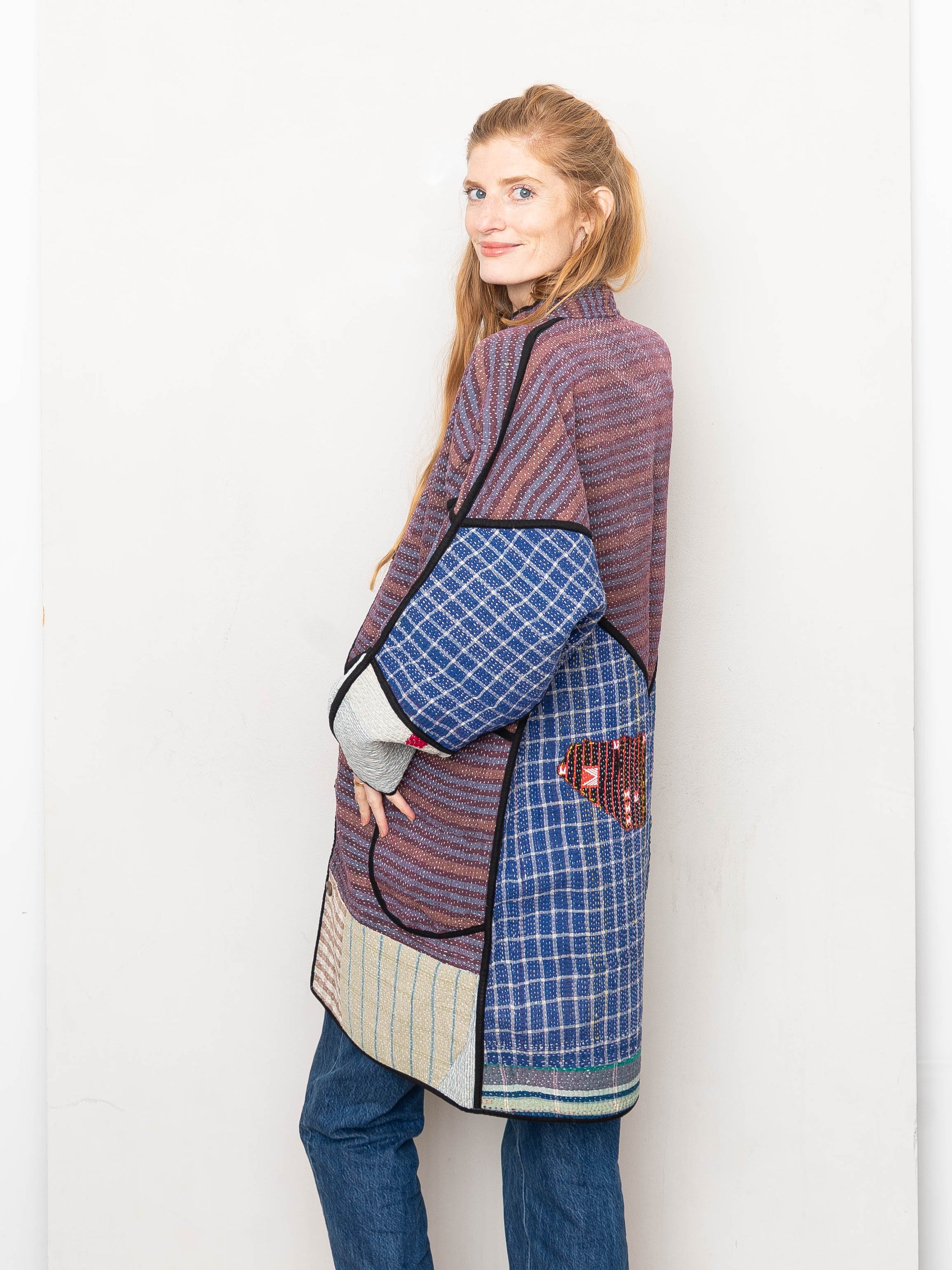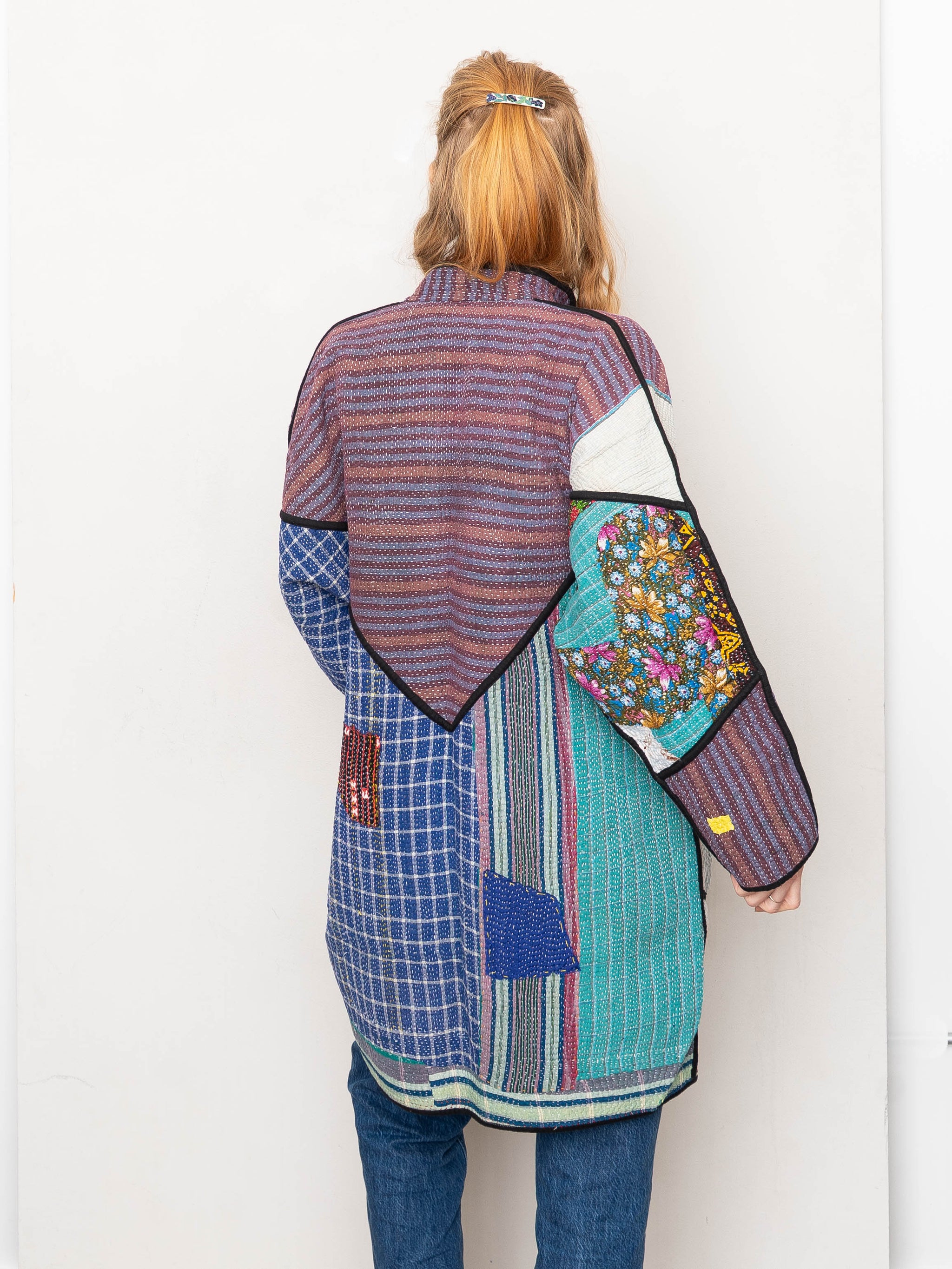 • The Sai Coat is a fully reversible long quilted jacket made from vintage Kantha quilts, finished with a double-sided collar stand, roomy pockets, and clean bias binding along the seams. Its longer silhouette offers a naturally expressive drape without feeling heavy.