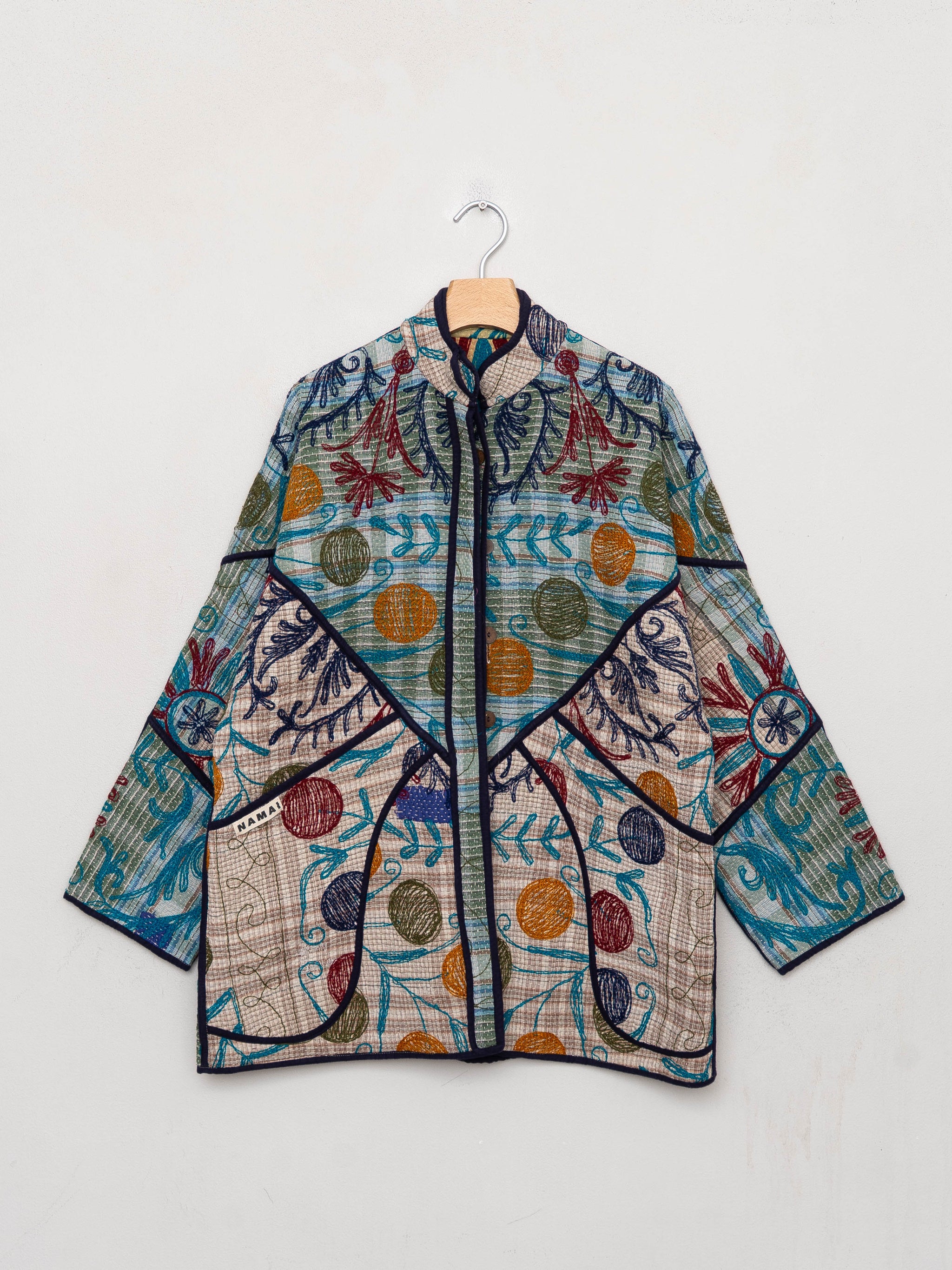 The Narmada Jacket is a relaxed, thigh-length style with an easy, oversized fit and generous patch pockets on both sides. Fully reversible and made from vintage Kantha quilts, each piece is completely one of a kind—no two are alike. Designed with thoughtful details like rollable sleeves, a mandarin collar, and coconut shell buttons on both sides for effortless wear.