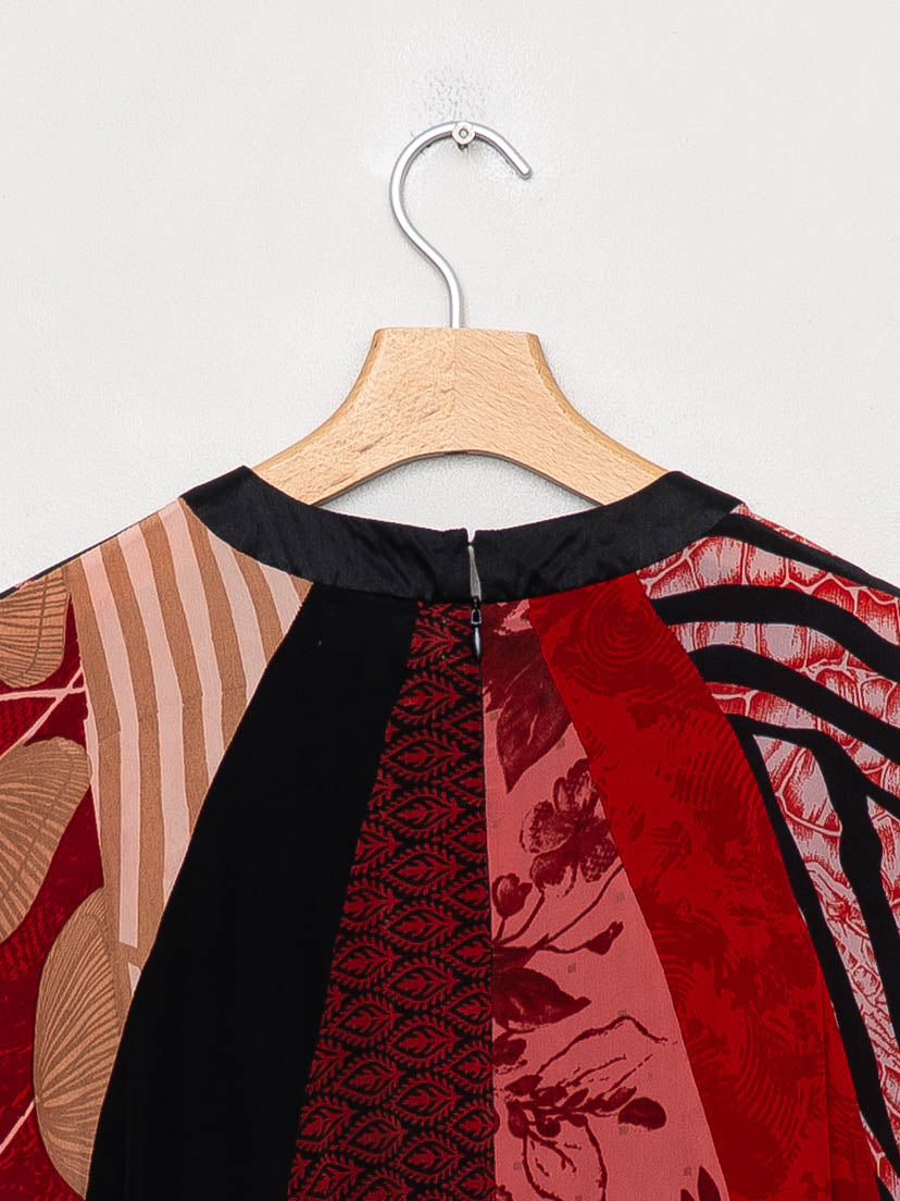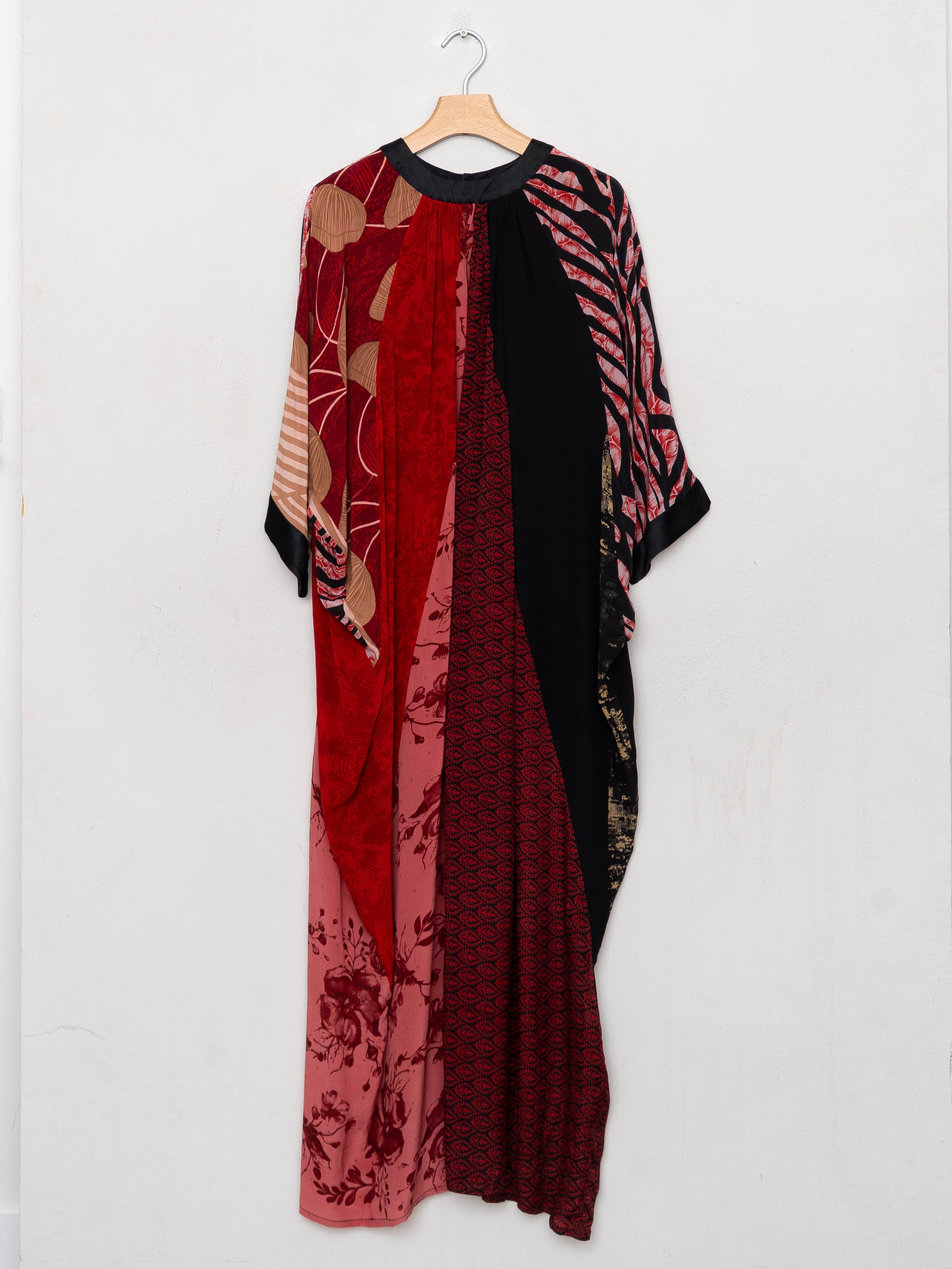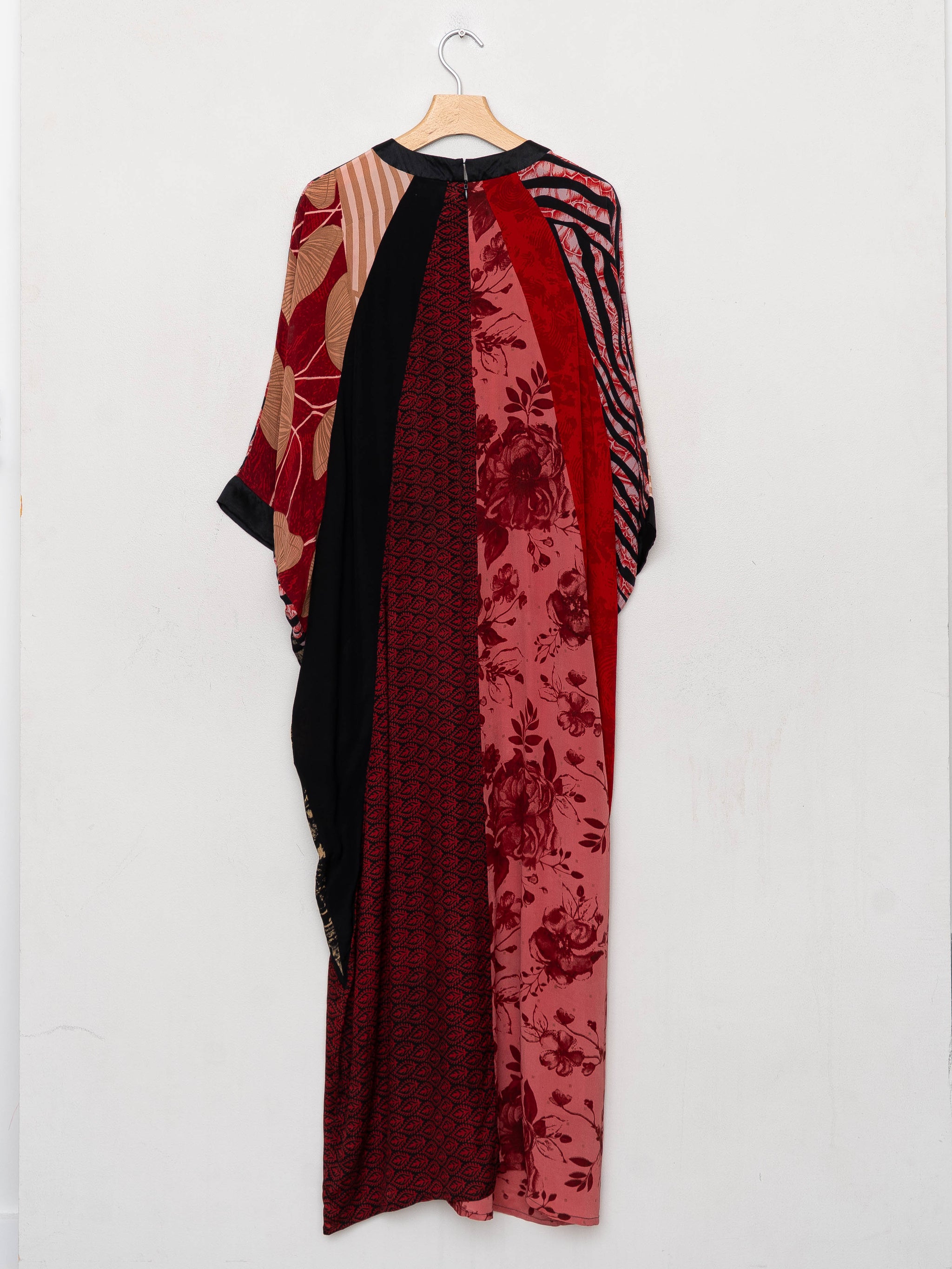 The Simmy Dress is a loose, flowy silhouette crafted from recycled silk saris—each hand-selected and thoughtfully pieced together from up to six different prints. Designed with an asymmetric gathered detail and invisible back zipper, every top is one-of-a-kind and never repeated. Easy to wear, easy to tailor, and made to celebrate pattern and play.