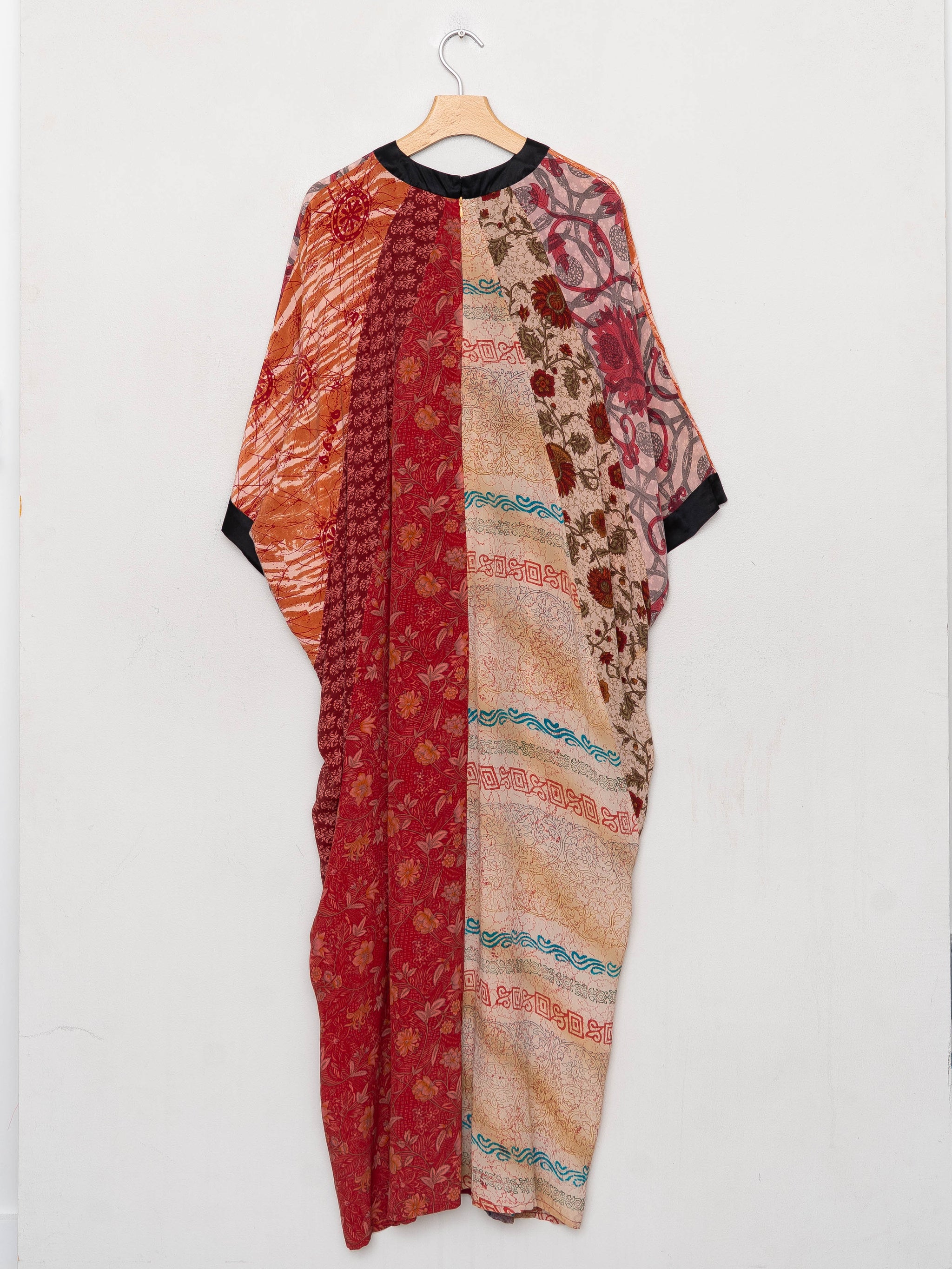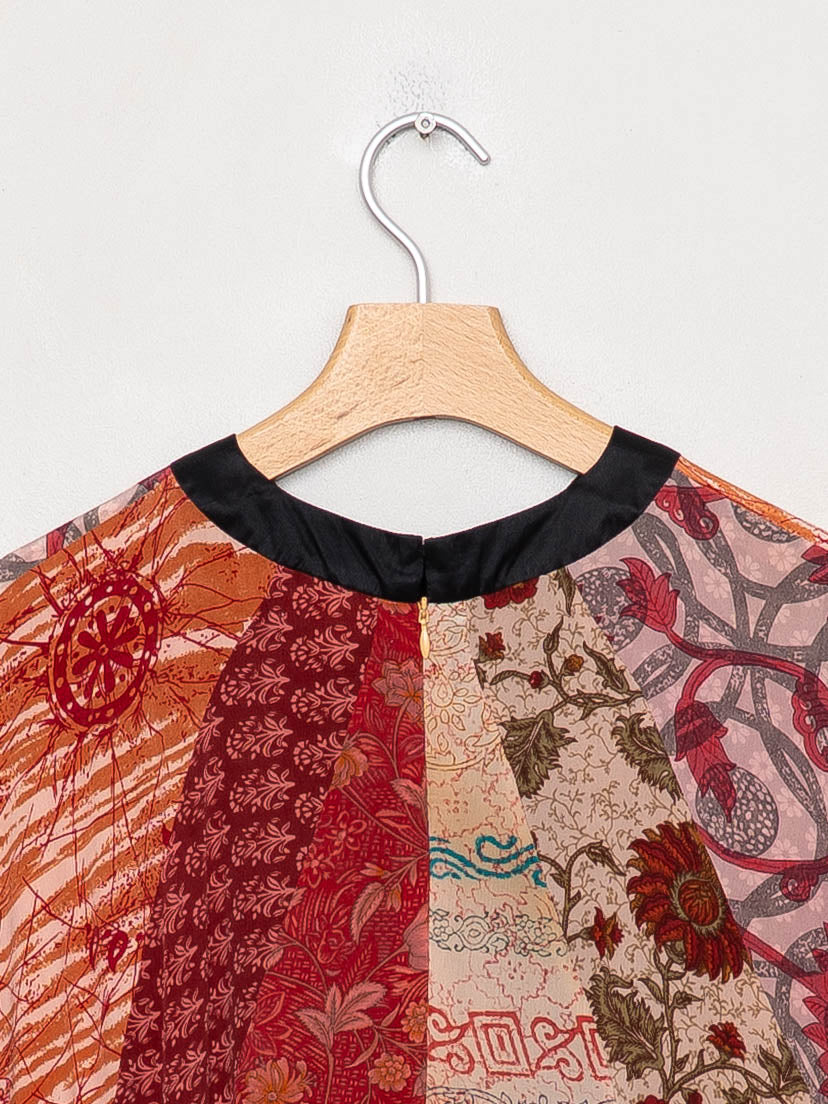The Simmy Dress is a loose, flowy silhouette crafted from recycled silk saris—each hand-selected and thoughtfully pieced together from up to six different prints. Designed with an asymmetric gathered detail and invisible back zipper, every top is one-of-a-kind and never repeated. Easy to wear, easy to tailor, and made to celebrate pattern and play.