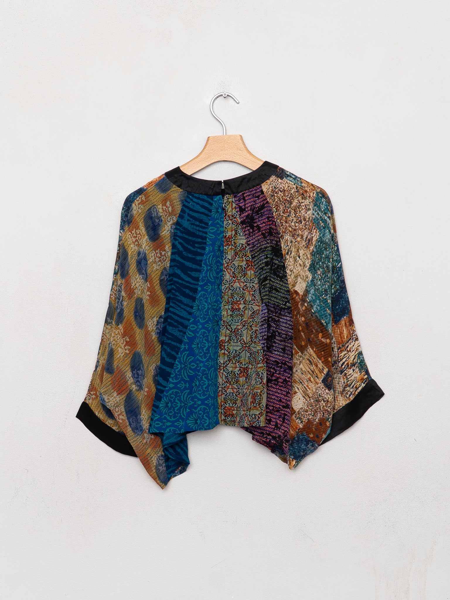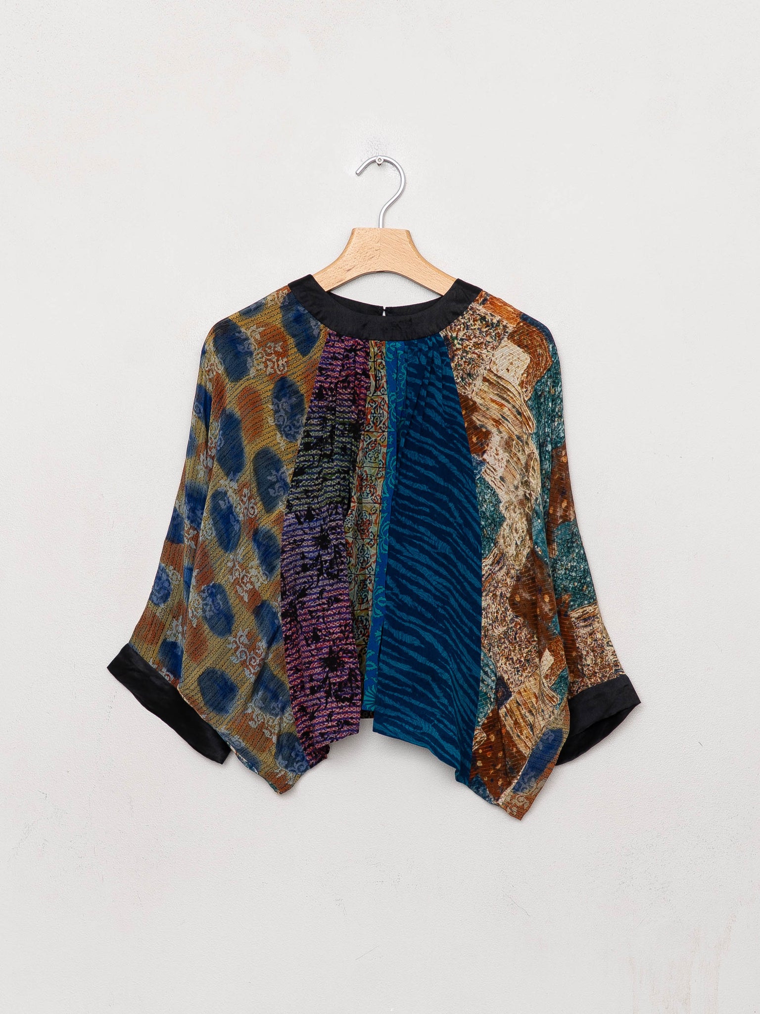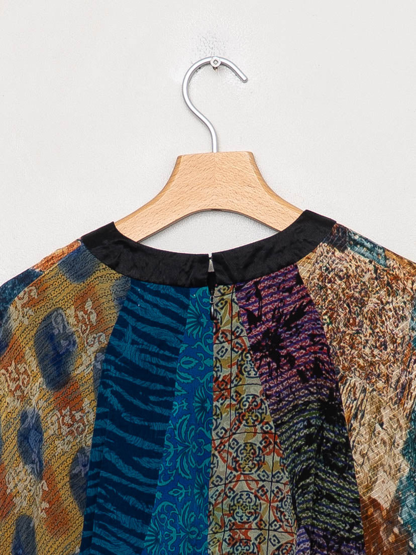 The Simmy Top is a loose, flowy silhouette crafted from recycled silk saris—each hand-selected and thoughtfully pieced together from up to six different prints. Designed with an asymmetric gathered detail and invisible back zipper, every top is one-of-a-kind and never repeated. Easy to wear, easy to tailor, and made to celebrate pattern and play..