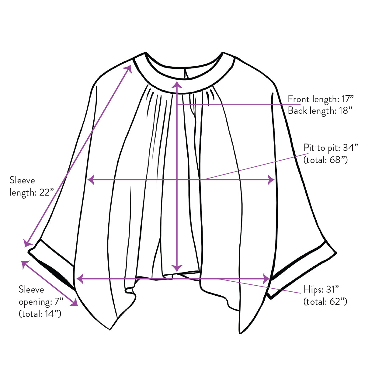 Pit-to-pit (from the bottom of armhole): 38” (total circumference 68")