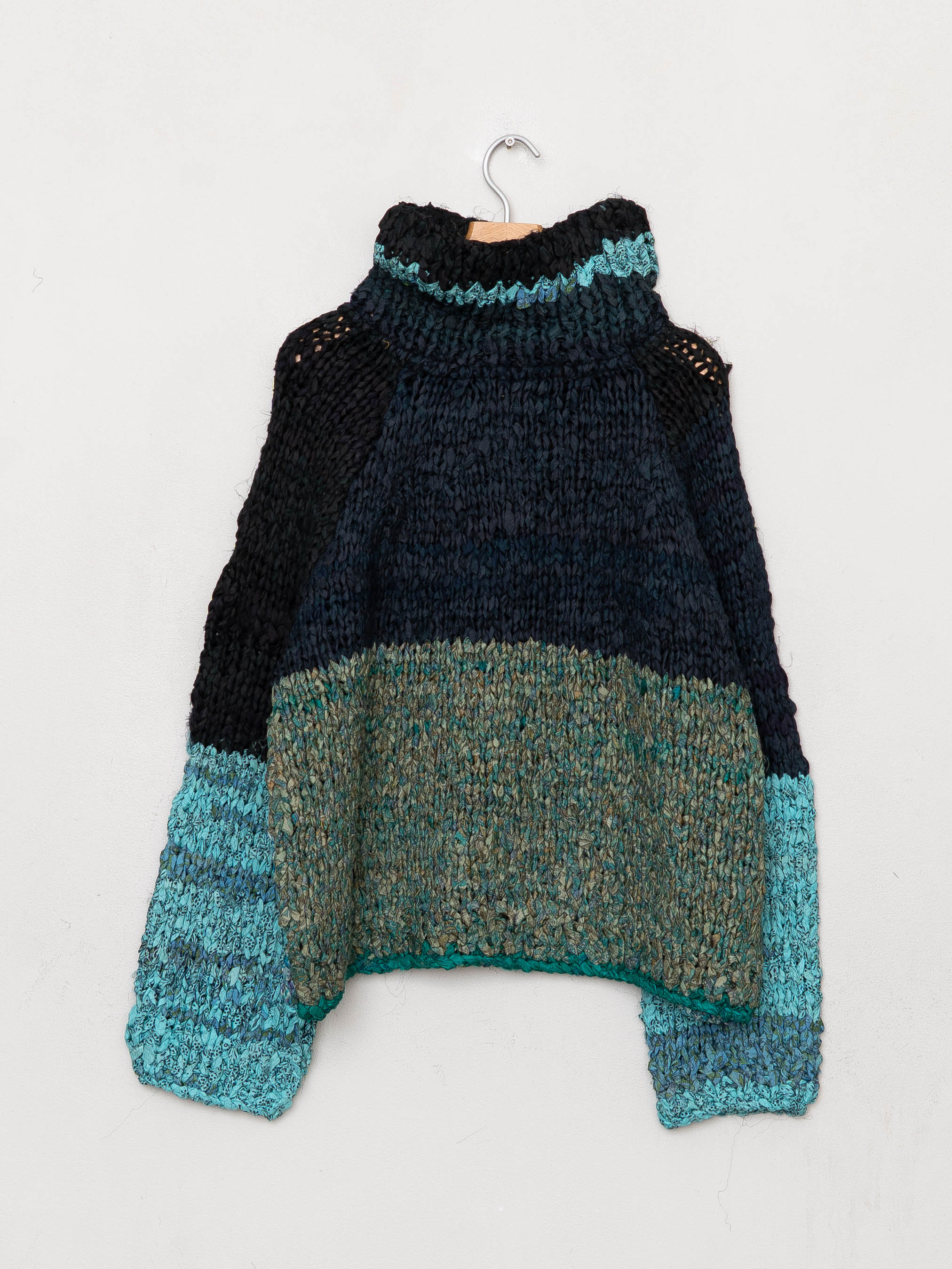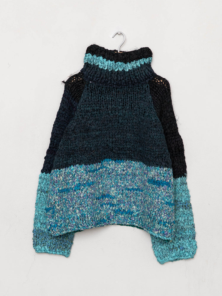 The Vishnu Sweater is a chunky knit made out of strips of recycled sari silk. It takes six sarees to make up one sweater. The recycled silk is torn into strips and hand knitted. Each one is completely handcrafted and no two are alike.