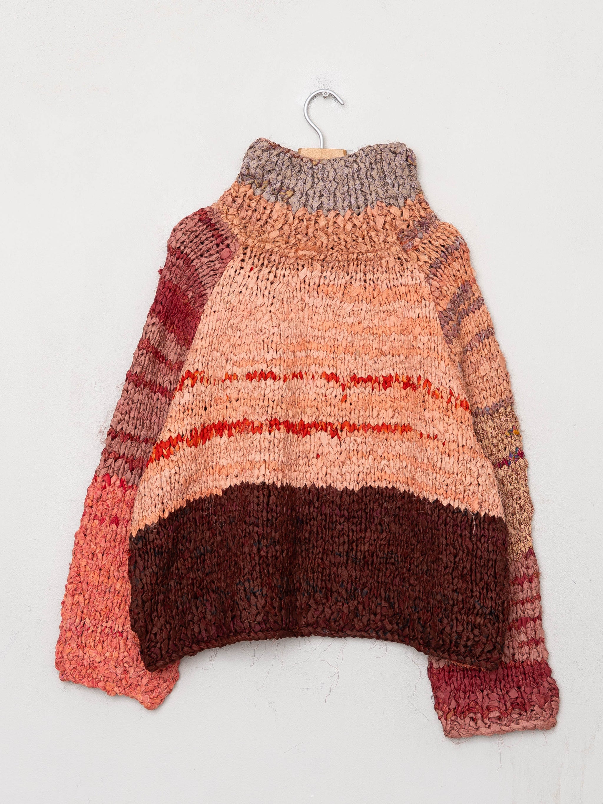 The Vishnu Sweater is a chunky knit made out of strips of recycled sari silk. It takes six sarees to make up one sweater. The recycled silk is torn into strips and hand knitted. Each one is completely handcrafted and no two are alike.
