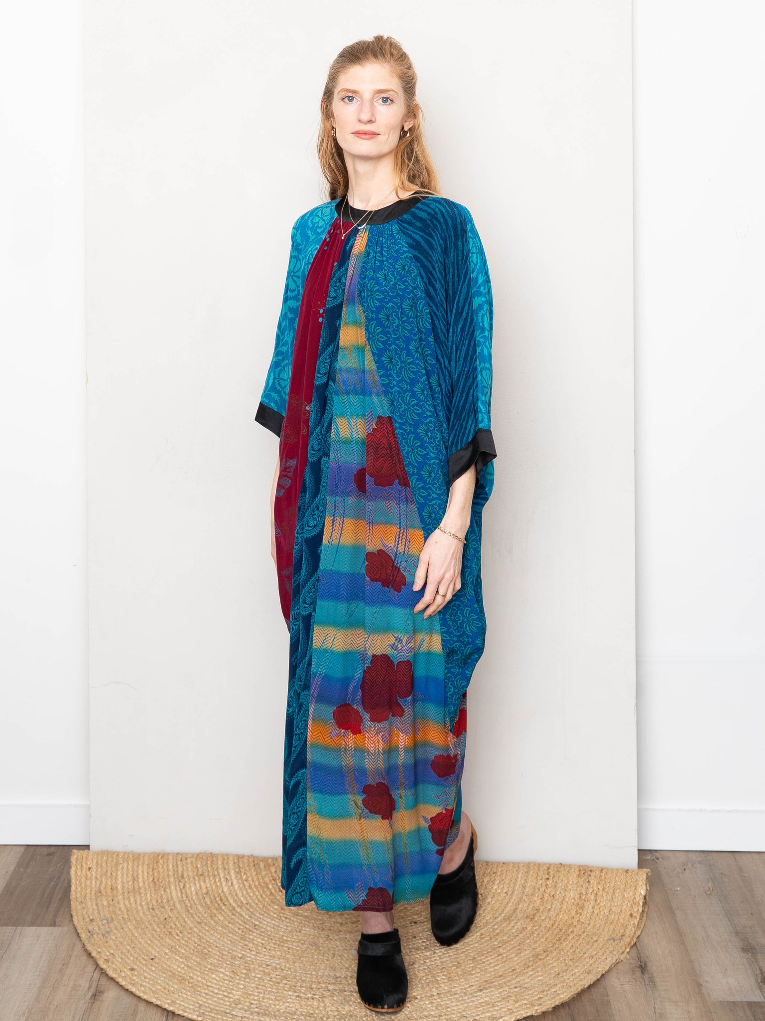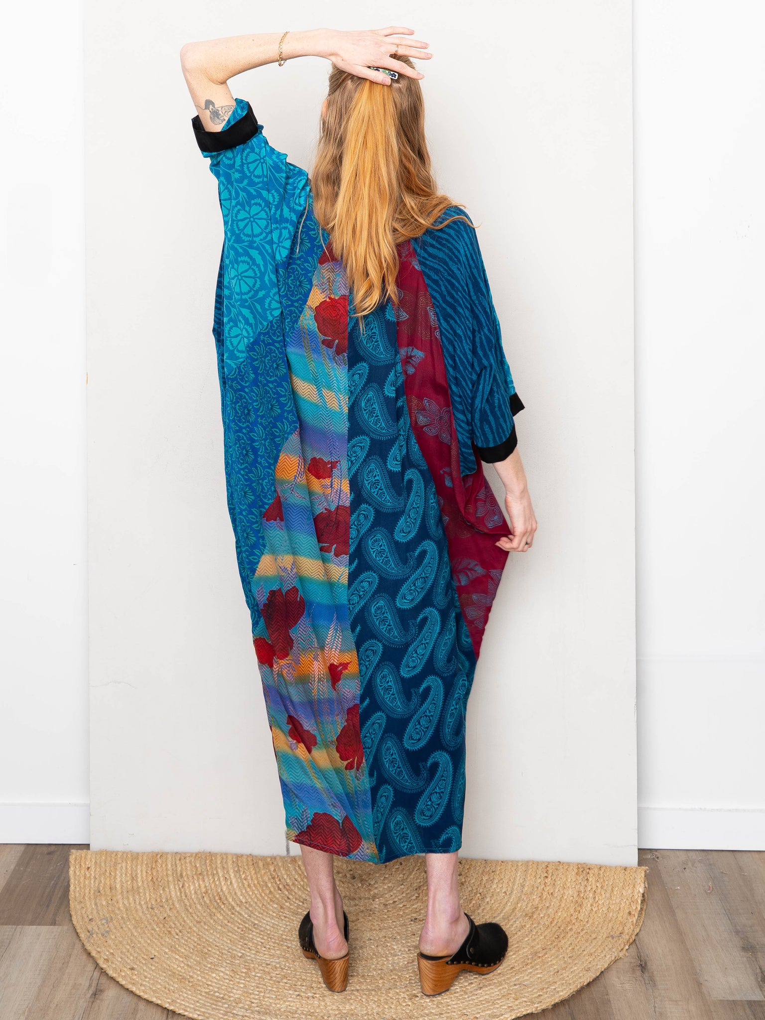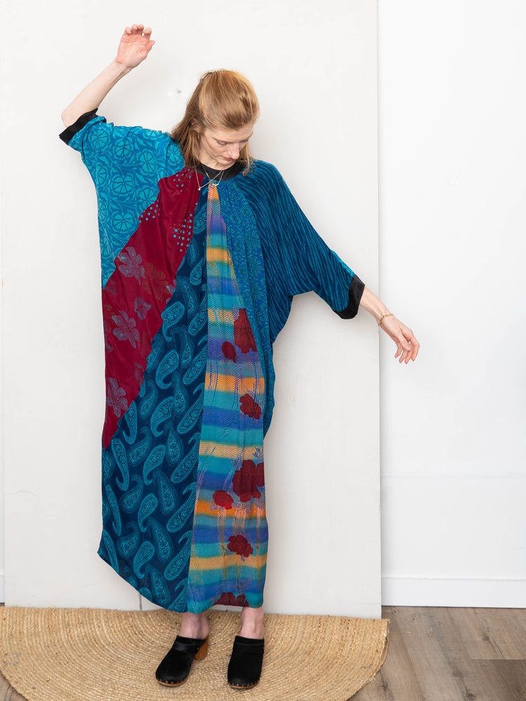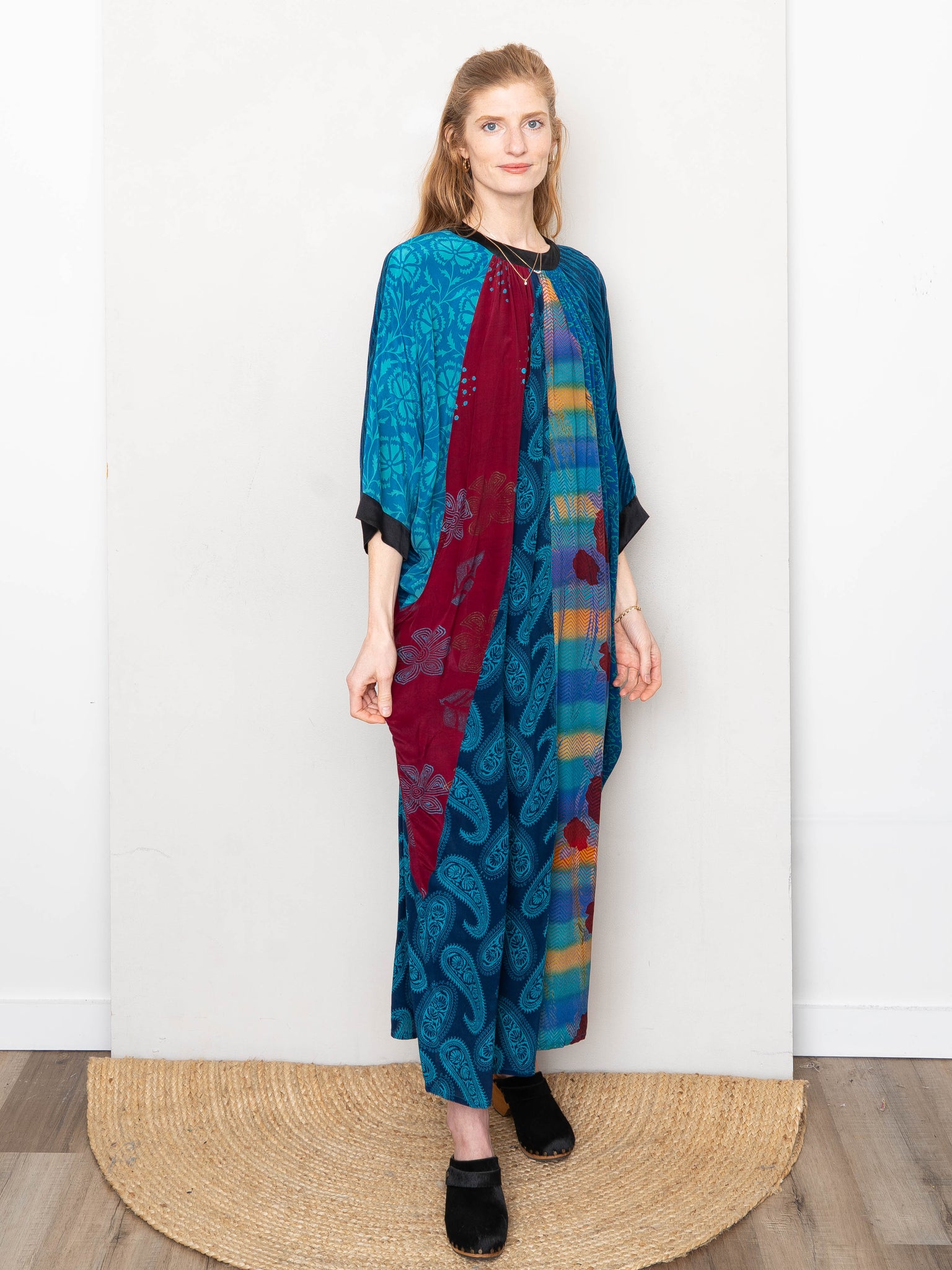The Simmy Dress is a loose, flowy silhouette crafted from recycled silk saris—each hand-selected and thoughtfully pieced together from up to six different prints. Designed with an asymmetric gathered detail and invisible back zipper, every top is one-of-a-kind and never repeated. Easy to wear, easy to tailor, and made to celebrate pattern and play.
